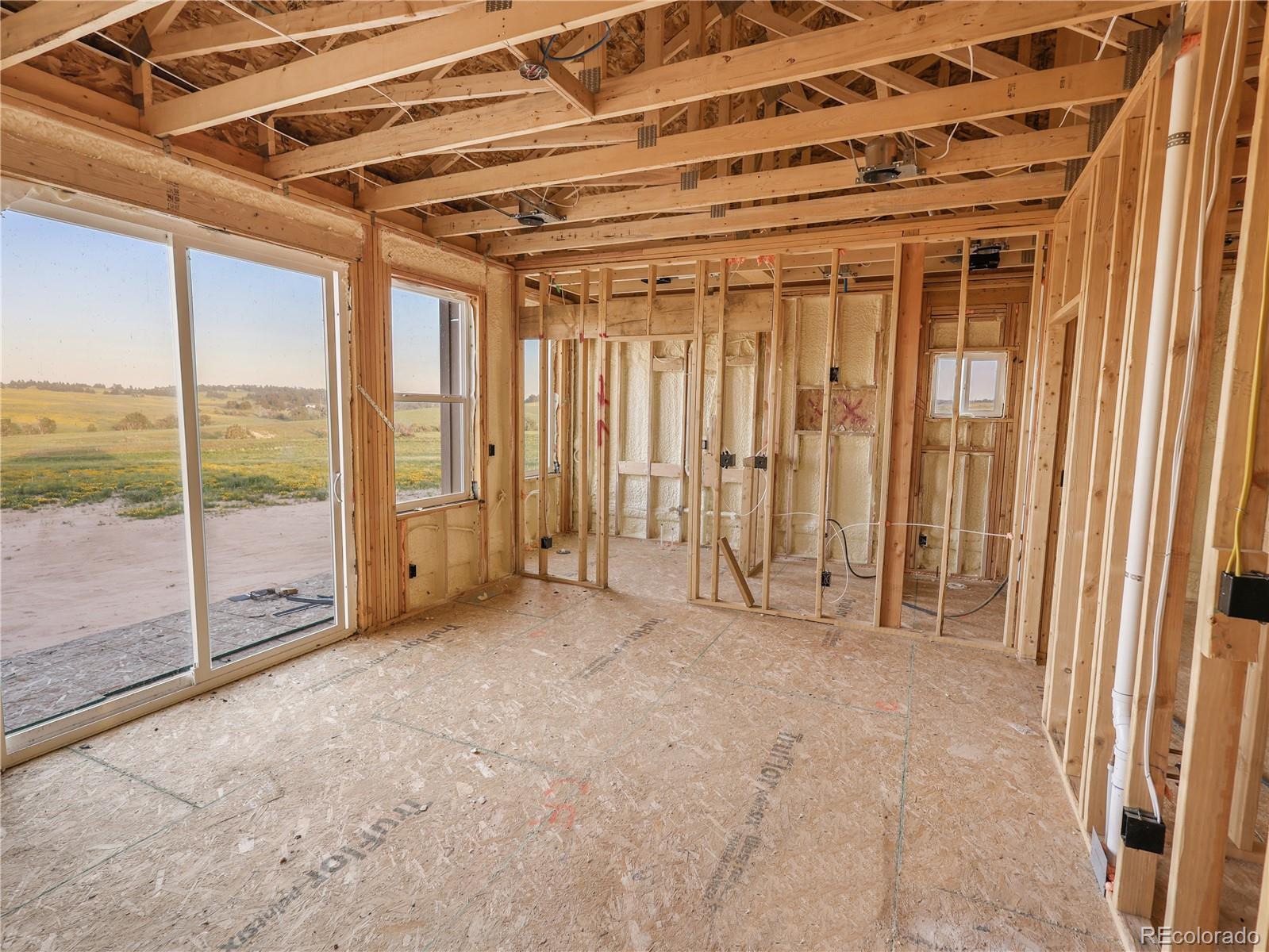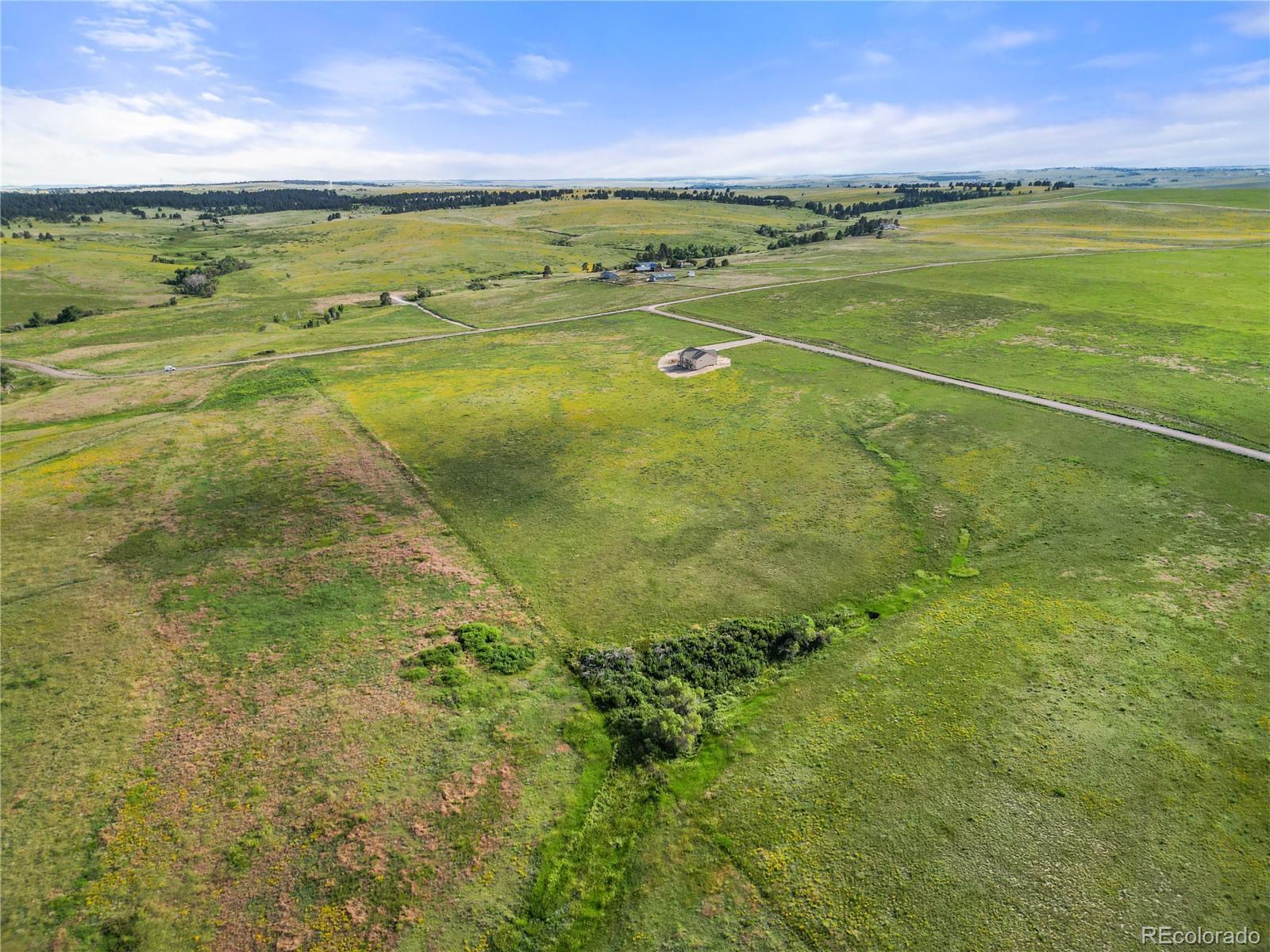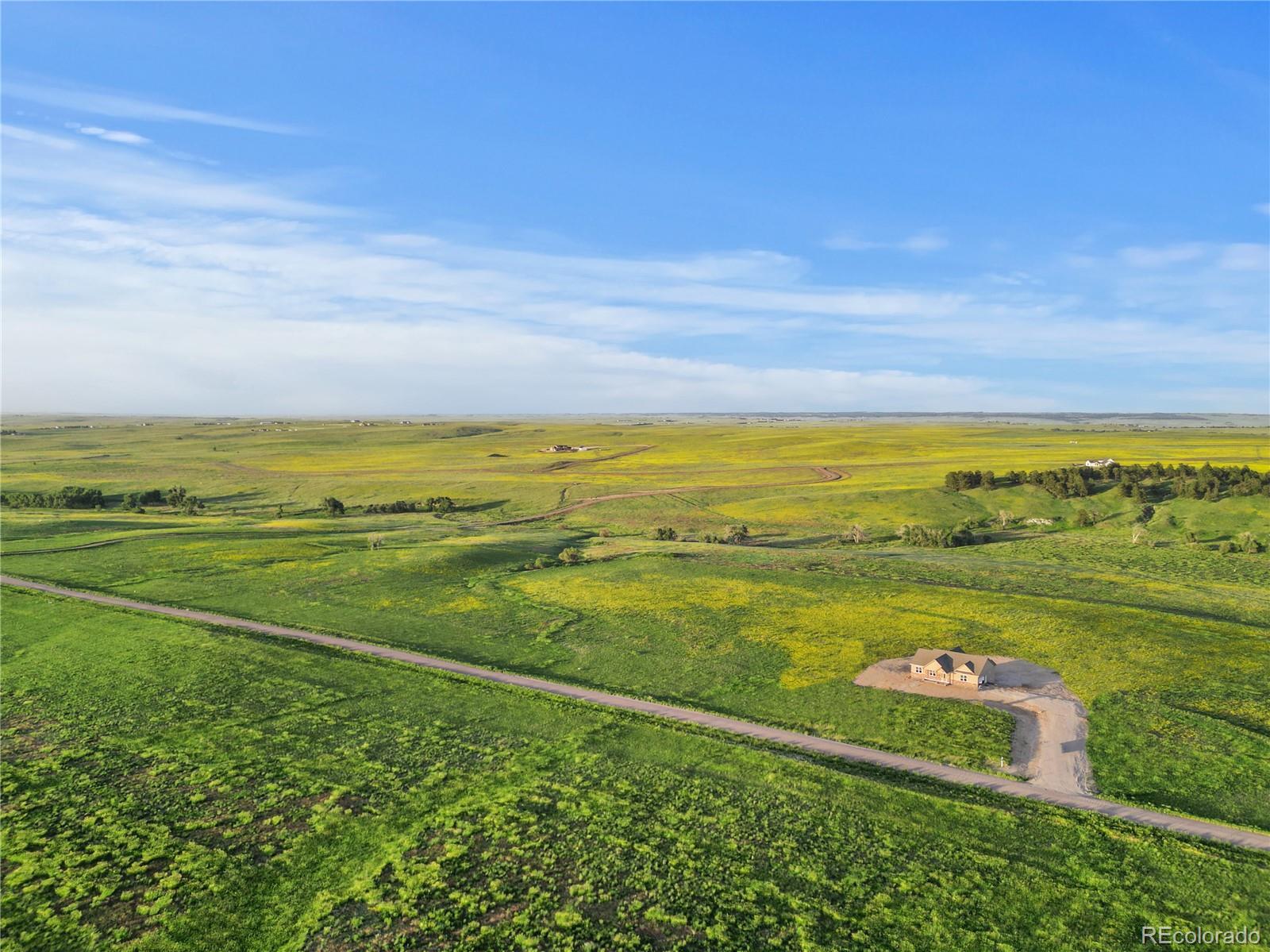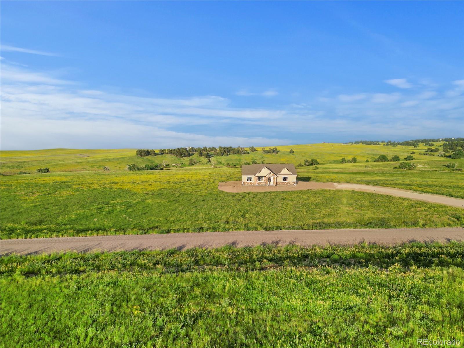 Own a brand-new custom walk-out ranch on 35 wide-open acres in the sought-after Serenity at Wolf Creek Ranch community. Built by local craftsman Colorado By Design, this modern farmhouse blends quality construction with sweeping prairie views. With no HOA, and A1 zoning, the property is a canvas for barns, horses, livestock, or your dream rural retreat—just five minutes from Kiowa and within easy reach of the Denver Metro area. The open floor plan is anchored by vaulted ceilings, oversized windows, and wide-open living spaces designed to maximize natural light, views, and comfort. The spacious living room—framed by built-ins and a fireplace—connects seamlessly to the gourmet kitchen and covered deck, creating an ideal setting for entertaining or simply watching the sunrise as wildlife roams the pasture. The primary suite is a true retreat, featuring a spa-like five-piece bath, an oversized walk-in closet, and private access to the covered deck—where tranquil views stretch for miles. A secondary bedroom with its own ensuite, a dedicated office, laundry room, and cozy sitting area with 9’ ceilings complete the main-level layout. Downstairs, the finished walk-out basement offers 9’ ceilings, two additional bedrooms, a full bath, a spacious rec room, a bonus room (perfect for a gym or theater), and a fully appointed kitchenette—ideal for guests or future in-law quarters. Guest houses and garage apartments are permitted with county approval, and RVs or temporary housing are allowed during construction. Construction is actively underway with completion anticipated by September 2025. This is your chance to secure a one-of-a-kind home on a legacy lot—where modern comfort meets Colorado countryside, and every sunrise feels like it’s yours alone. Please note: Renderings are for illustrative purposes only and do not represent the final finishes or colors. Blueprints are for reference and may not reflect all changes. Contact the listing agent for more details
