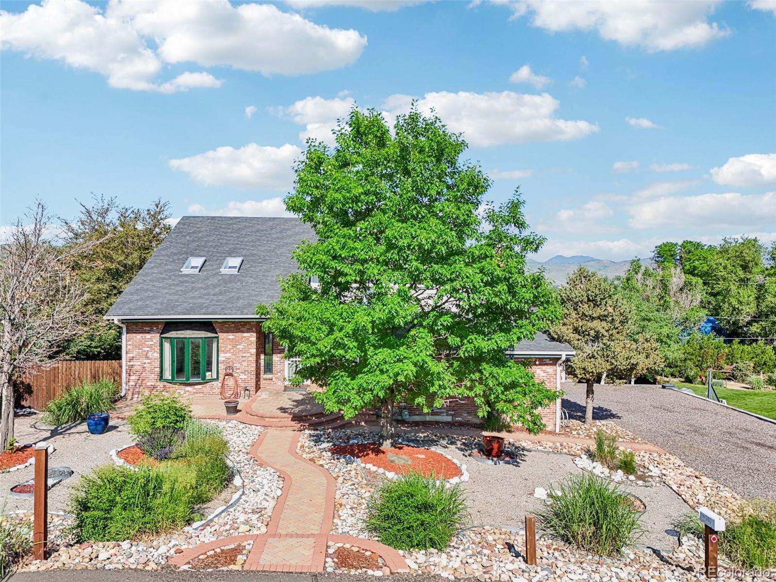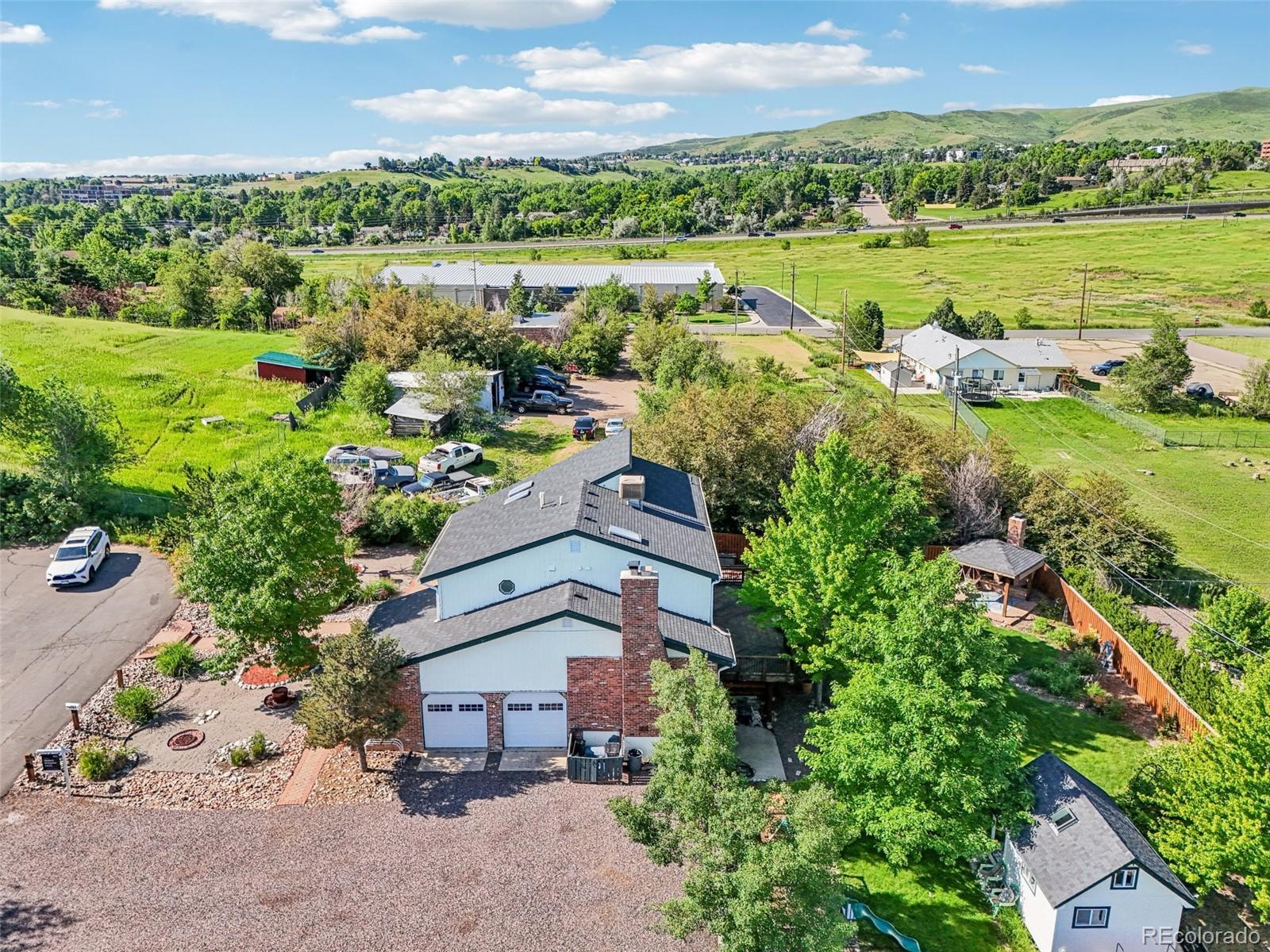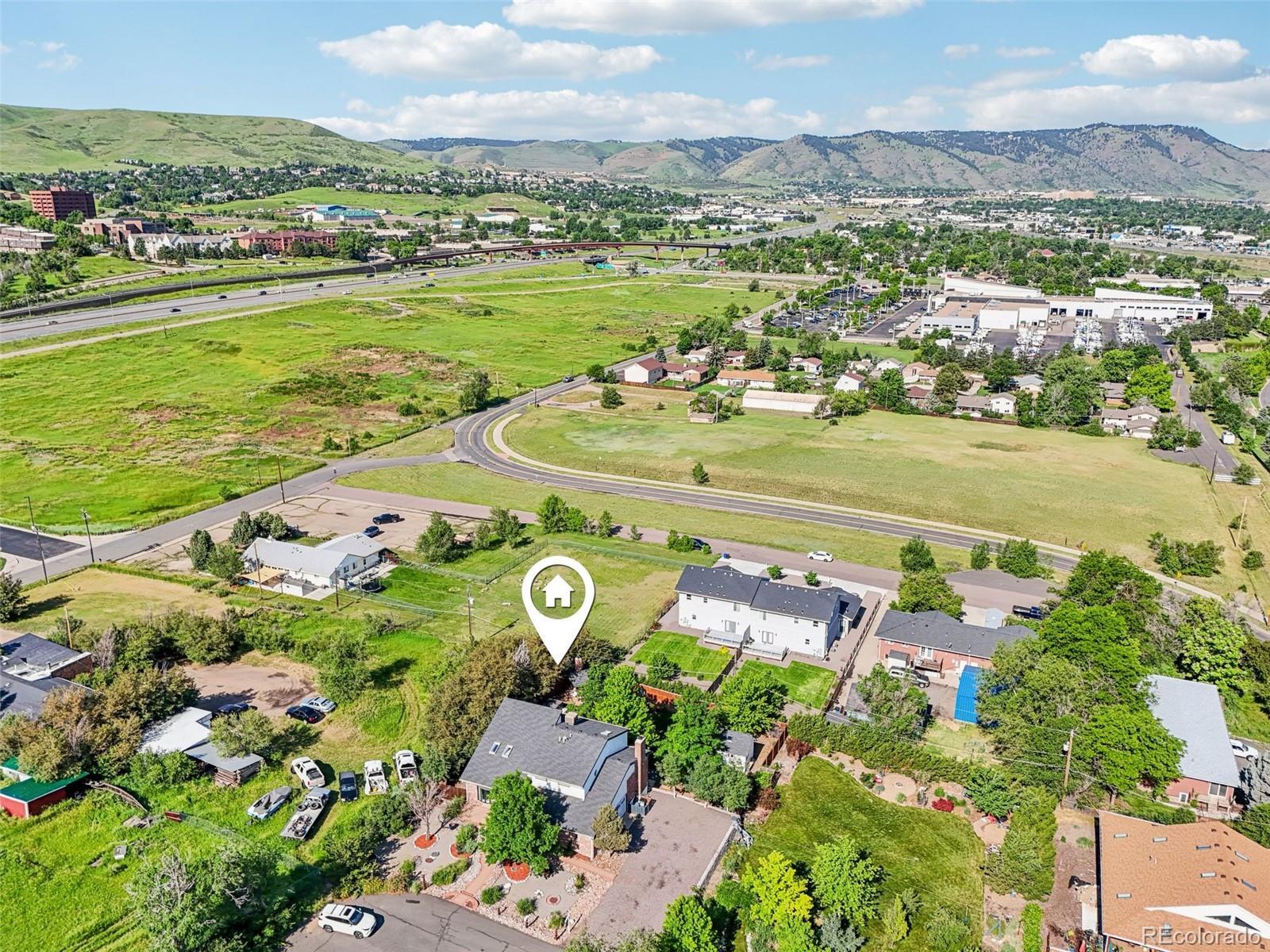 Tucked away on a quiet cul-de-sac in Golden, this home offers stunning mountain views, no HOA, and a prime location near Colorado Mills Mall- within walking distance! You'll love the spacious driveway which can accommodate boats or trailers alongside the two-car garage. Inside, hardwood floors run throughout the main level, featuring a home office, bright living room, and updated kitchen with quartz counters, a double oven, and newer appliances. A renovated powder room adds convenience, while the open layout flows into a second larger family room with a brick fireplace and two access points to the huge back deck, perfect for entertaining or relaxing while enjoying the views. Upstairs, the primary suite boasts unobstructed views, an en suite bathroom, and a walk-in closet. A loft, two additional bedrooms, a full bath, and a laundry room complete the level. The finished basement includes a large room that could be used as a bedroom or media room, an additional non-conforming bedroom, a ¾ bath, and a flex space with walkout access, great for a gym. The large backyard features a hot tub, built-in gas fireplace, and a play shed. Unbeatable Location: Conveniently located near 6th Avenue, I-70, and C-470, this home offers quick access to downtown Golden, Denver, and the mountains. And a top-rated Montessori school is just a few miles away. Seller is offering a $10,000 credit to the buyer with a full-price offer.