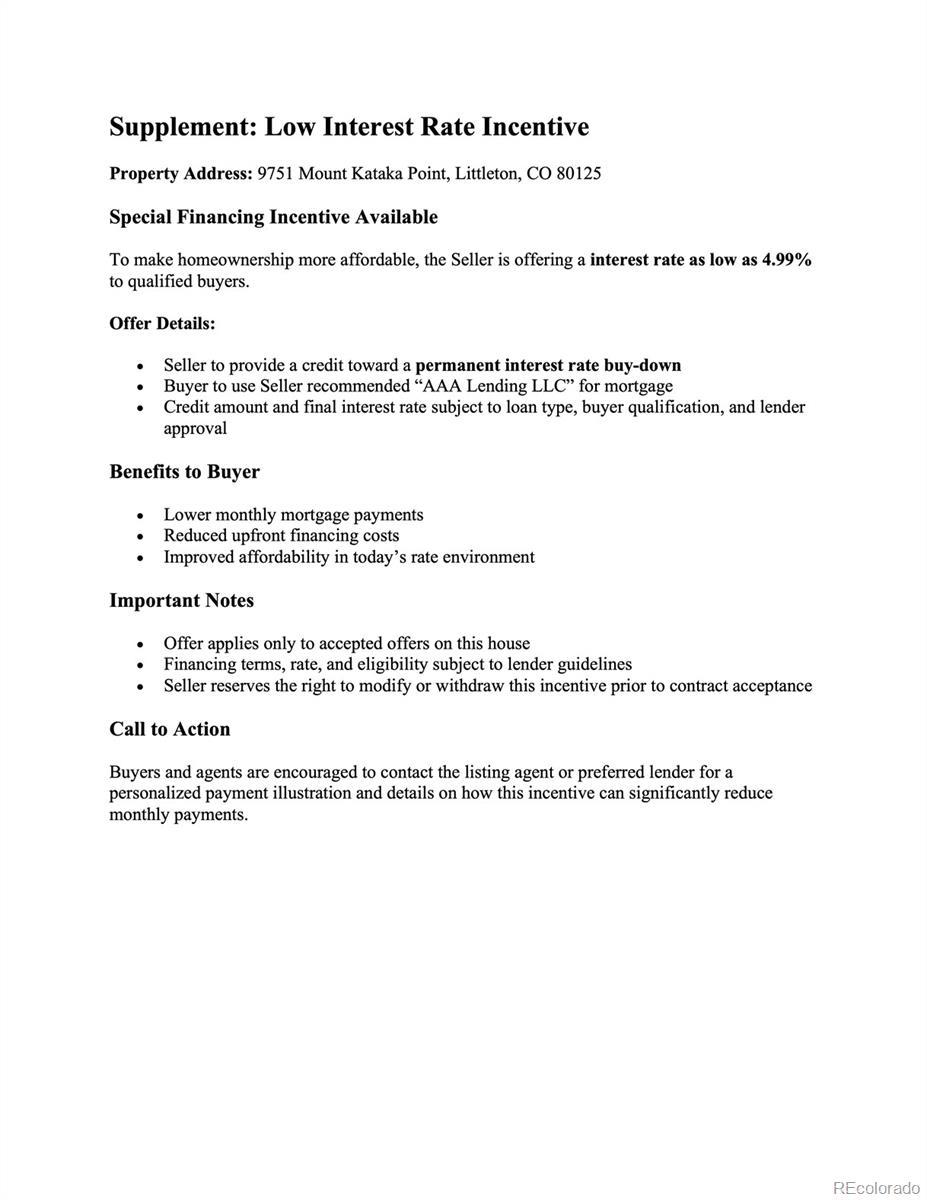 Location, location, location — plus rates as low as 4.99% for well-qualified buyers! This beautiful home is located in one of the most desirable Sterling Ranch communities and features 3 bedrooms, 2.5 bathrooms, and a walk-out unfinished basement backing to open space. The home is filled with high-end upgrades and finishes, including luxury vinyl plank flooring, upgraded cabinets and countertops, stainless steel appliances, and abundant natural light throughout. Enjoy two decks—a second-story deck and a covered main-level deck—perfect for morning coffee, listening to meadowlarks, and taking in stunning sunrises. The open kitchen and dining area are ideal for family gatherings and entertaining. All bedrooms and the convenient second-floor laundry are located on the upper level. The south-facing orientation helps snow melt quickly in winter, while evenings on the back deck or sunsets from the front porch provide the perfect way to unwind. This smart home includes a non-monitored alarm system, app-controlled lighting and thermostat, and the ability to monitor utility usage via app. Owned solar panels (fully paid off) help reduce electricity costs. The garage offers ample storage and includes a 220V outlet for electric vehicle charging. Ideally located near Lockheed Martin, C-470, Wadsworth Blvd, Chatfield State Park, Roxborough Park, Waterton Canyon, and within walking distance to Safeway. Move-in ready and truly a gem—hard to find at this price point. Low interest rate incentive available. Seller may offer buyer credit toward a lender-approved interest rate buydown. Rates as low as 4.99% for well-qualified buyers may be available when using seller-recommended mortgage broker, subject to lender approval, underwriting, loan program, and market conditions. Buyer must qualify. Rate not guaranteed.