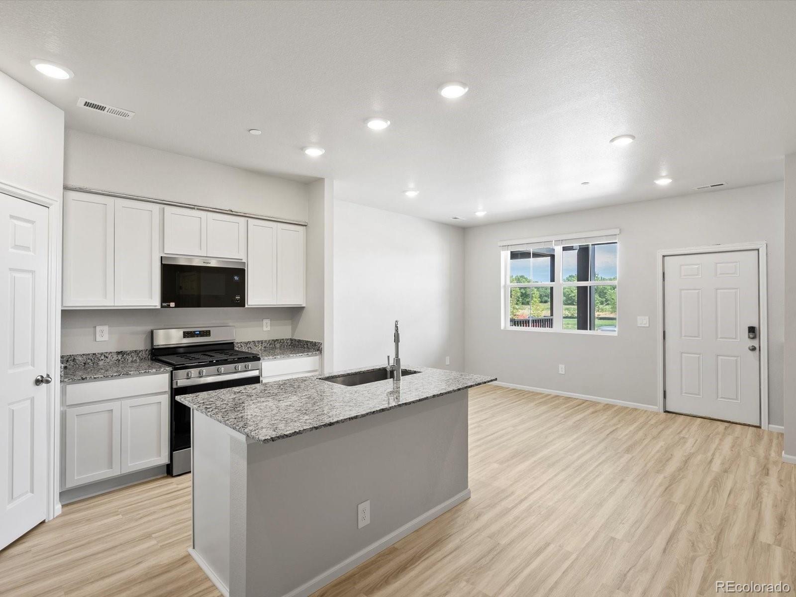 Open concept kitchen with granite countertops and white cabinets! The Willow is a stylish two-story townhome featuring an open-concept main floor and a charming covered front porch. Upstairs offers three bedrooms, including a private primary suite, plus a convenient laundry room. With 2.5 baths and a two-bay garage, this design blends comfort and functionality. The Meritage Home difference includes spray-foam insulation, advanced air filtration for year-round comfort and healthier air, and durable cementitious siding known for its strength, fire-resistance, and long-lasting performance. A Whirlpool appliance package, and full home blinds are also included for move-in convenience. Welcome home where every detail is built for comfort, efficiency, and LIFE . BUILT. BETTER. Poudre Heights in Windsor offers small-town charm with modern convenience. Enjoy nearby parks, shopping, and dining at Centerra and Windsor Town Center—all just minutes away. *This home qualifies for special incentives through builder preferred lender for a limited time. Terms and conditions apply. See sales counselor for details!