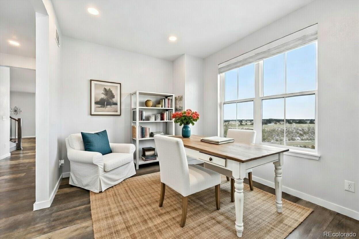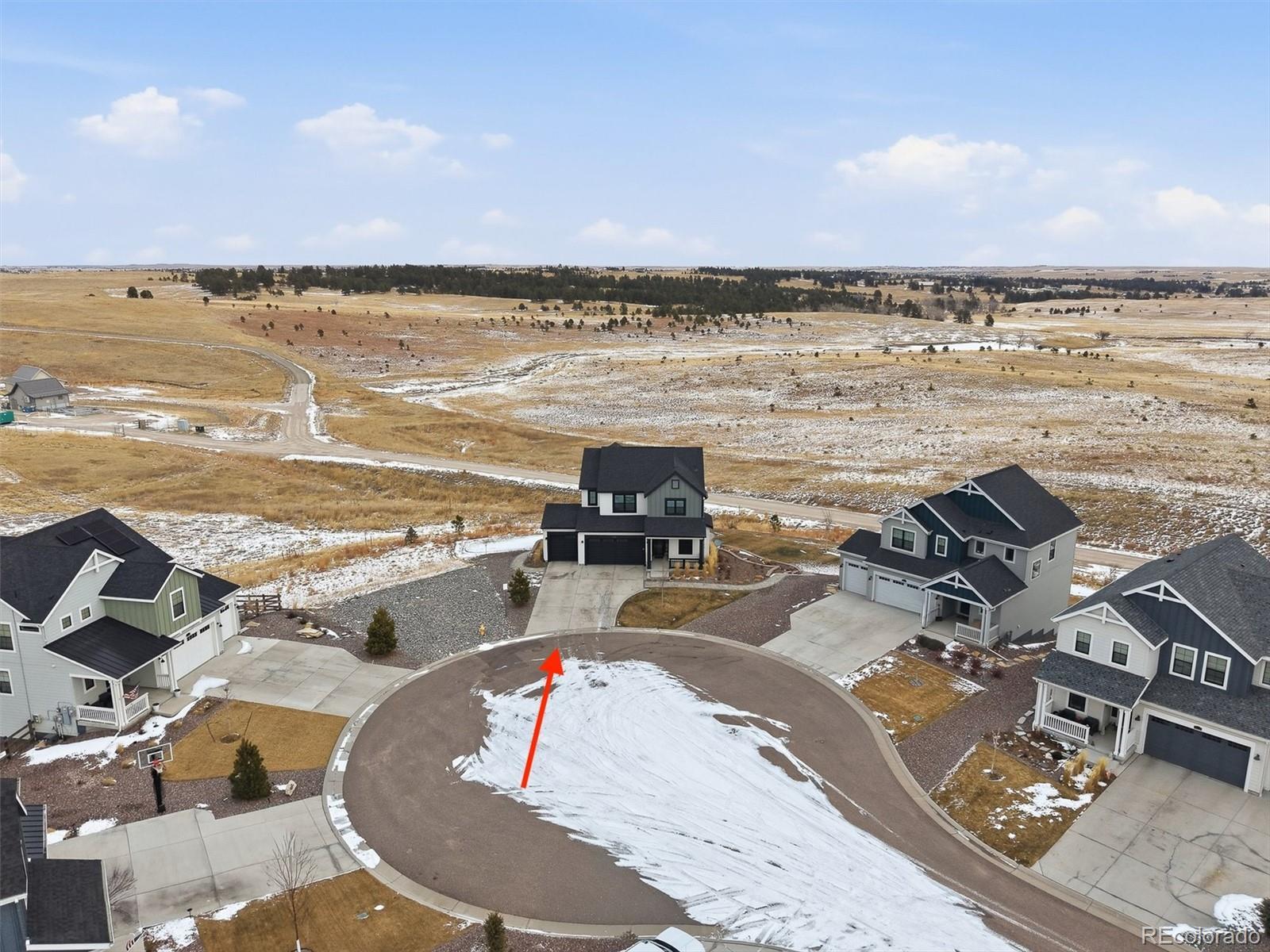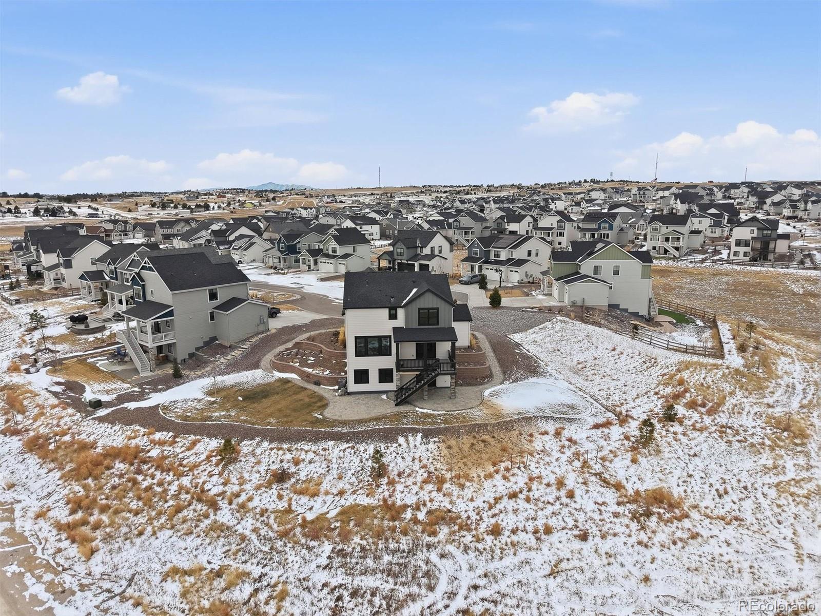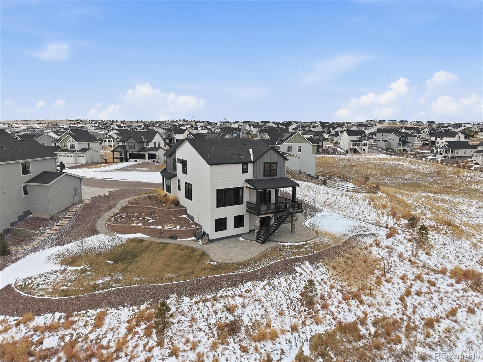 Tucked at the end of a quiet cul-de-sac, this home sits on the best lot in all of Independence. With open space behind plus extra space on each side of the home, it feels private, peaceful, and expansive—like the cul-de-sac is yours alone—with sweeping plains views from nearly every angle. Inside, the home is light, open, and thoughtfully upgraded, blending clean, modern finishes with warm farmhouse-style lighting and design touches. The main level flows beautifully, with a formal office and dining room leading into a huge living room open to the kitchen, ideal for everyday living and entertaining. The kitchen features bright white cabinetry, slab granite countertops, stainless steel appliances, a massive island with seating, and farmhouse-inspired lighting that adds character and charm. Enjoy morning coffee on the covered deck or evenings on the custom brick paver patio surrounded by lush, illuminated landscaping. The walkout basement offers high ceilings and room to grow for future living or recreation space. Upstairs are four spacious bedrooms, including two with walk-in closets, plus convenient upstairs laundry. The primary suite is a true retreat with open-space views, an upgraded walk-in shower, slab granite counters, and a huge walk-in closet with real wood built-ins. Additional highlights include upgraded luxury carpet and pad, LVP flooring, stylish shiplap accents, cordless blinds, Milgard single-hung windows, a whole-home humidifier, and farmhouse-style fixtures. New windows, exterior paint, and a Class 4 roof were completed March 2025. Central A/C, a radon system, upgraded 8-foot garage doors, and a fully insulated and drywalled 3-car garage complete the home. NO HOA fee, plus a community outdoor pool, playgrounds, fitness center, community garden & clubhouse all with quick & easy access to Parker or Elizabeth just 13 minutes away. This is more than a home—it’s space, views, thoughtful design, and a lifestyle that’s hard to find.