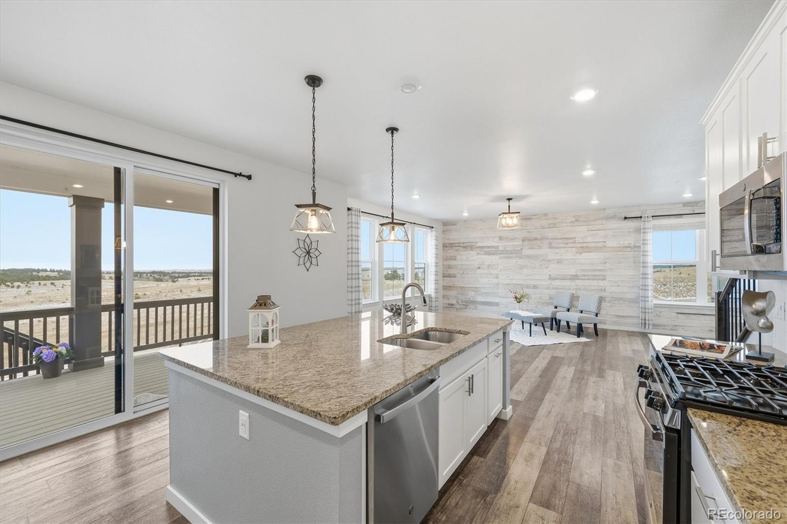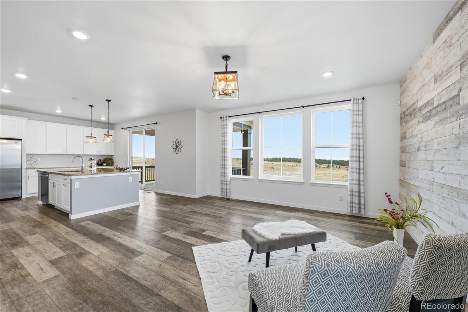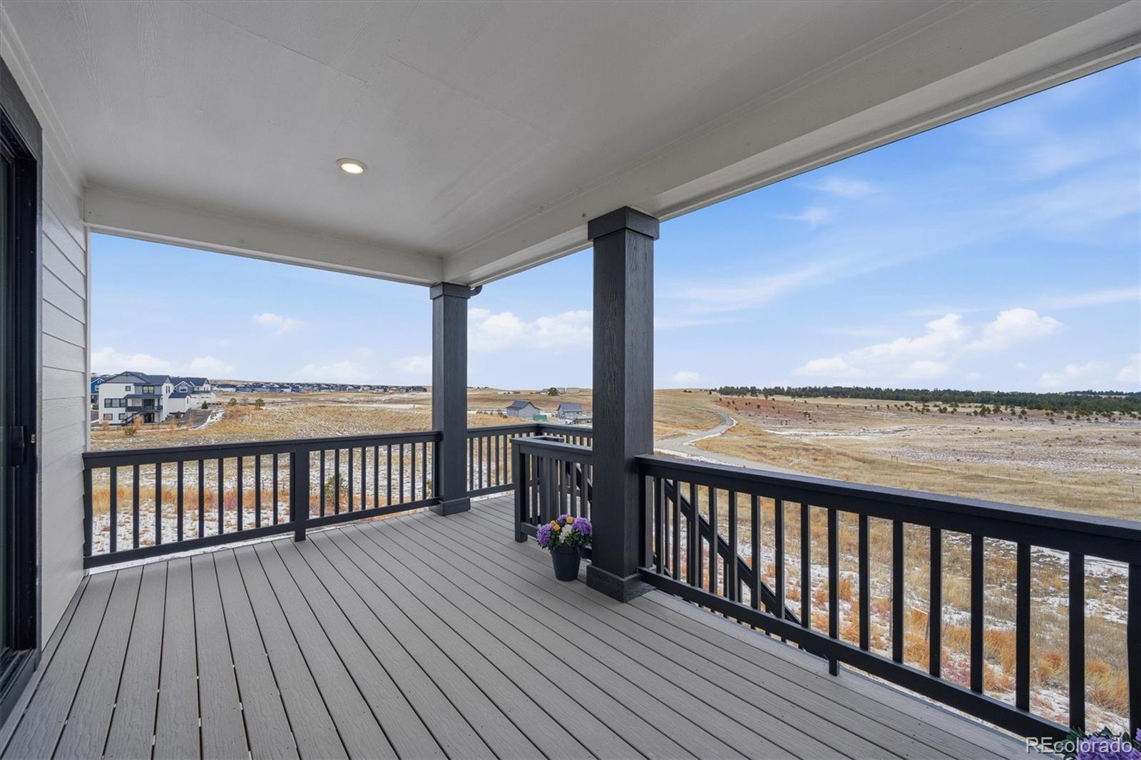 Tucked at the end of a quiet cul-de-sac, this home sits on the best lot in all of Independence. With open space behind plus extra space on each side of the home, it feels private, peaceful, and expansive—like the cul-de-sac is yours alone—with sweeping plains views from nearly every angle. Inside, the home is light, open, and thoughtfully upgraded, blending clean, modern finishes with warm farmhouse-style lighting and design touches. The main level flows beautifully, with a formal office and dining room leading into a huge living room open to the kitchen, ideal for everyday living and entertaining. The kitchen features bright white cabinetry, slab granite countertops, stainless steel appliances, a massive island with seating, and farmhouse-inspired lighting that adds character and charm. Enjoy morning coffee on the covered deck or evenings on the custom brick paver patio surrounded by lush, illuminated landscaping. The walkout basement offers high ceilings and room to grow for future living or recreation space. Upstairs are four spacious bedrooms, including two with walk-in closets, plus convenient upstairs laundry. The primary suite is a true retreat with open-space views, an upgraded walk-in shower, slab granite counters, and a huge walk-in closet with real wood built-ins. Additional highlights include upgraded luxury carpet and pad, LVP flooring, stylish shiplap accents, cordless blinds, Milgard single-hung windows, a whole-home humidifier, and farmhouse-style fixtures. New windows, exterior paint, and a Class 4 roof were completed March 2025. Central A/C, a radon system, upgraded 8-foot garage doors, and a fully insulated and drywalled 3-car garage complete the home. NO HOA fee, plus a community outdoor pool, playgrounds, fitness center, community garden & clubhouse all with quick & easy access to Parker or Elizabeth just 13 minutes away. This is more than a home—it’s space, views, thoughtful design, and a lifestyle that’s hard to find.