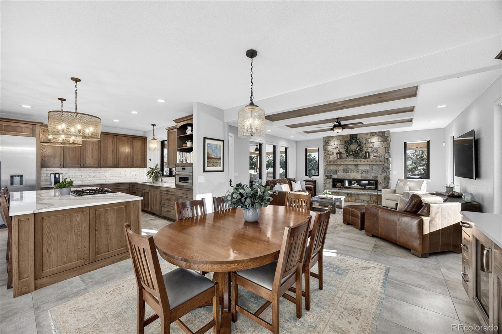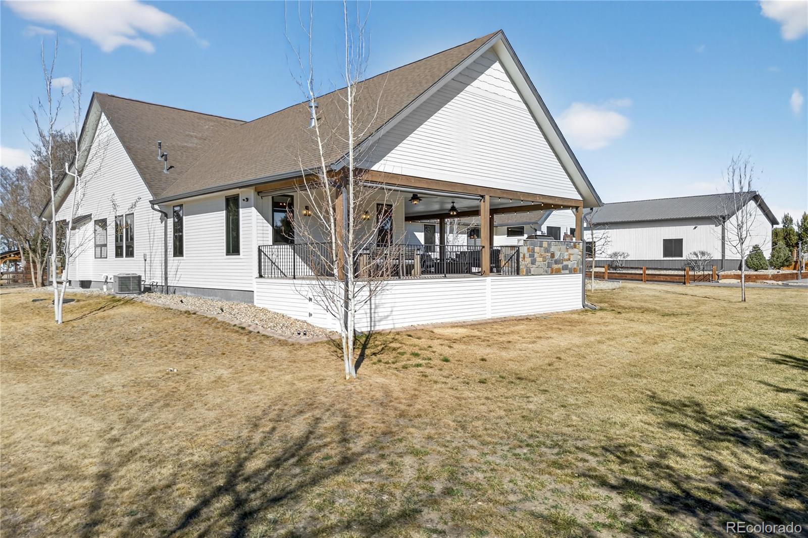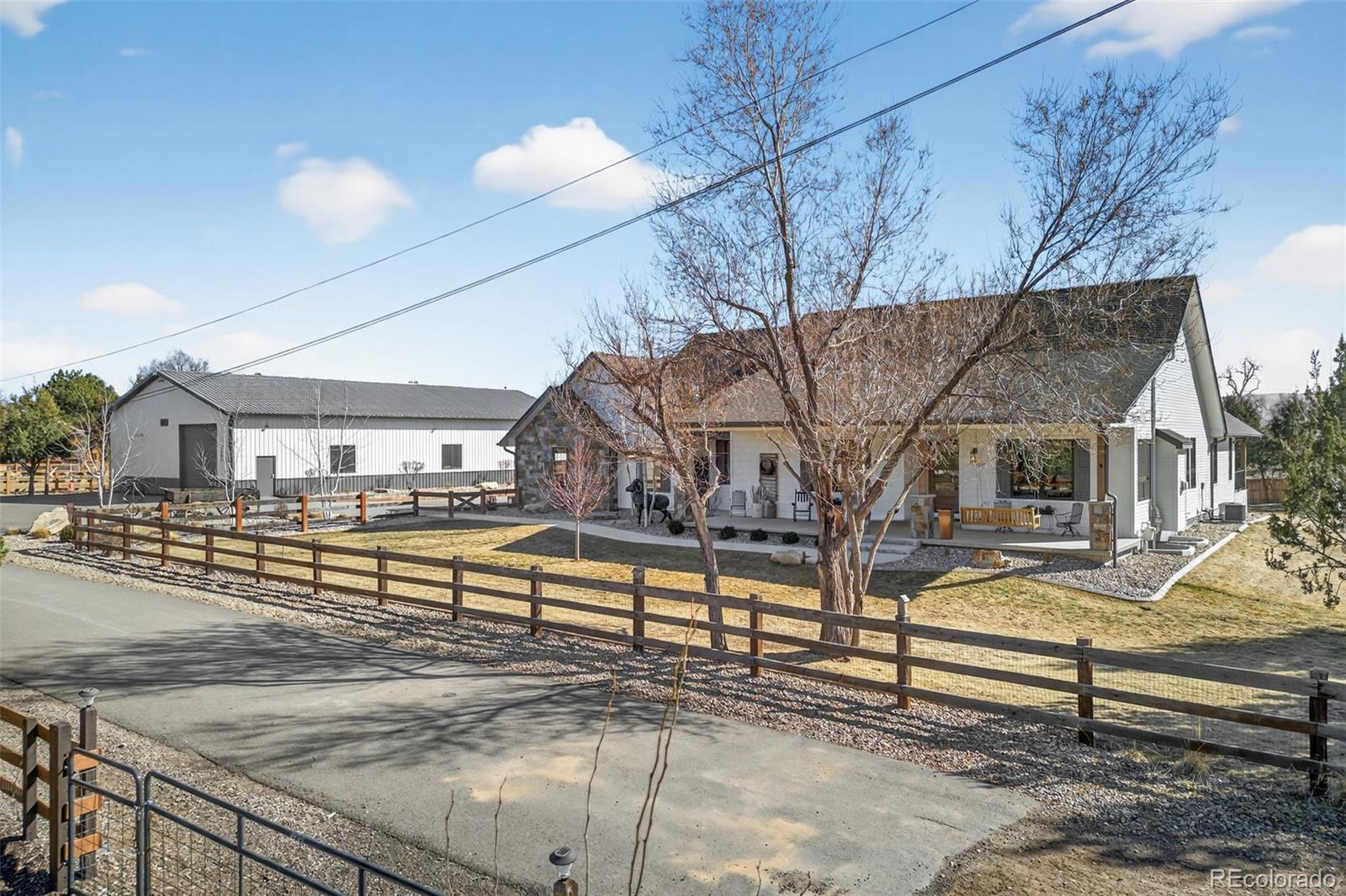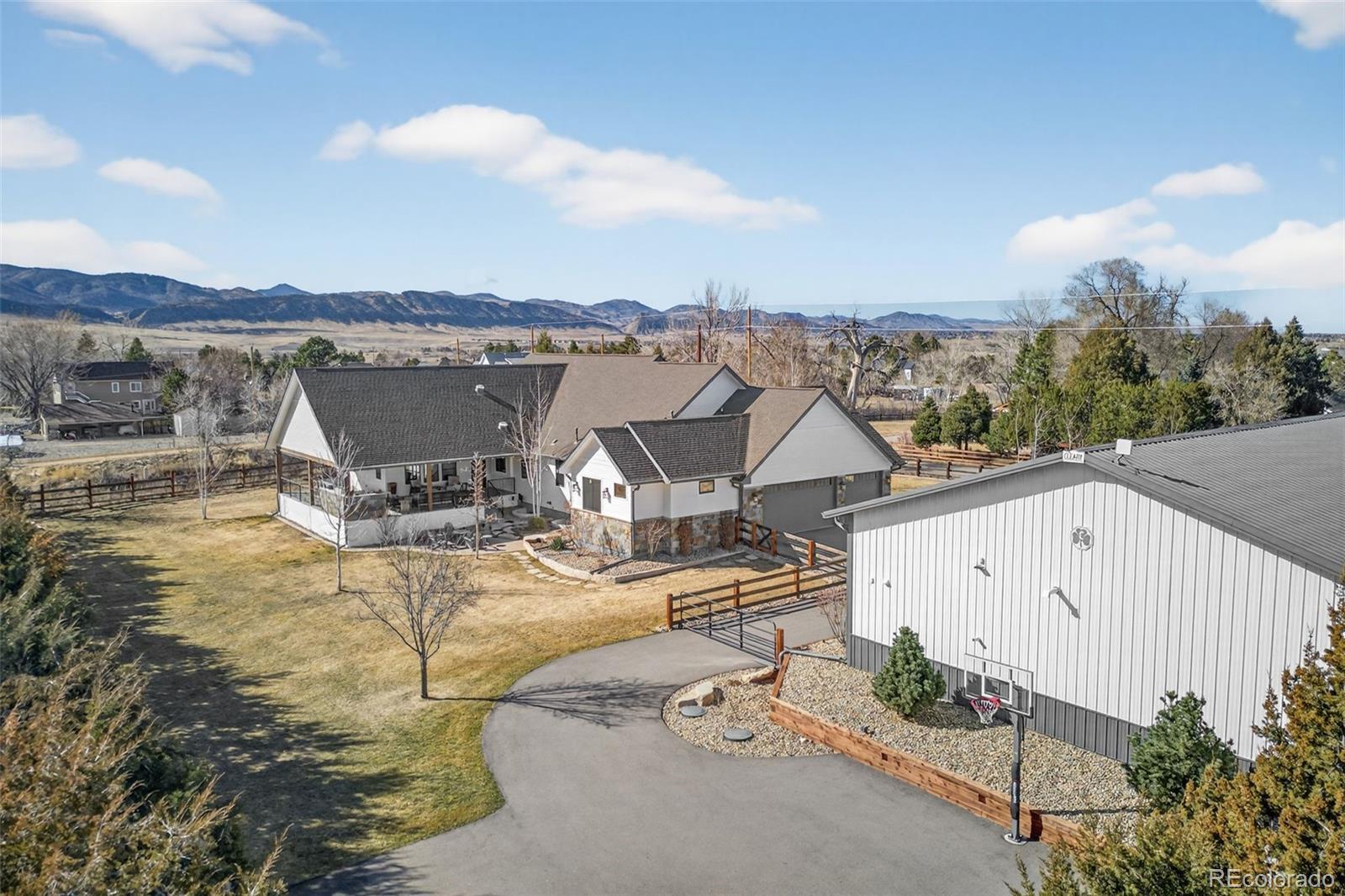 Dreaming of country living in the city? This exceptional modern farmhouse delivers the best of both worlds with luxury finishes, breathtaking foothill views, and an impressive 3,360 sq ft workshop, plus a charming authentic 19th-century wagon that makes the property truly unforgettable. Completely remodeled in 2022, the home was thoughtfully expanded to create a stunning great room anchored by a floor-to-ceiling stone fireplace and a main-level primary retreat featuring a spa-inspired five-piece bath, oversized soaking tub, and dual custom walk-in closets. Every detail was designed for comfort, beauty, and effortless everyday living. Start your mornings on the expansive front porch and unwind or entertain by the fire pit on the spacious rear deck, perfectly positioned to enjoy warm summer evenings and sweeping views. The professionally landscaped grounds showcase an expansive flat lot, trees, and curated plantings, creating a serene, private setting backing to the High Line Canal. The upgraded outbuilding/workshop is ideal for hobbies, storage, or all your recreational toys, making this a rare and versatile property. Ideally located at the end of a quiet dead-end street, the home offers unmatched privacy while remaining just minutes from Roxborough State Park, Waterton Canyon, Chatfield Reservoir, and the boat launch. Cottonwood Riding Club and access to the High Line Canal trail are only a short walk from your front door. Designed for both everyday comfort and unforgettable entertaining, experience the rare combination of refined country living and city convenience in this truly one-of-a-kind property! Check out https://9498wwagonwheeldr.com for more pictures of this stunning home!