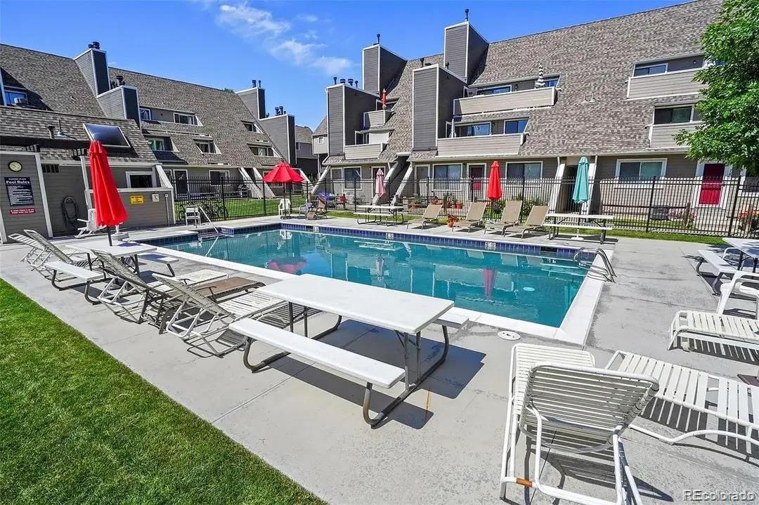 Seller Offering $5,000 Concession for a Limited Time! This main-level end unit offers the convenience of a private exterior entrance and a comfortable, thoughtfully updated interior. Inside, the living area is bright with natural light and features updated laminate flooring, recessed lighting, and a new electric fireplace, all overlooking the community pool just steps away. The kitchen includes ample cabinetry for storage, a large breakfast bar, and a stylish new backsplash, creating a functional and welcoming space for everyday living. The bedroom features brand-new carpet and a spacious walk-in closet, while the fully remodeled bathroom showcases a large walk-in glass shower with tile surround and a new vanity for a clean, modern finish. Enjoy a small private patio area for easy access and low-maintenance living. The community includes a pool and is ideally located near several parks, Pirates Cove Water Park, and the Big Dry Creek Trail, offering convenient access to outdoor recreation, walking and biking paths, and nearby amenities.