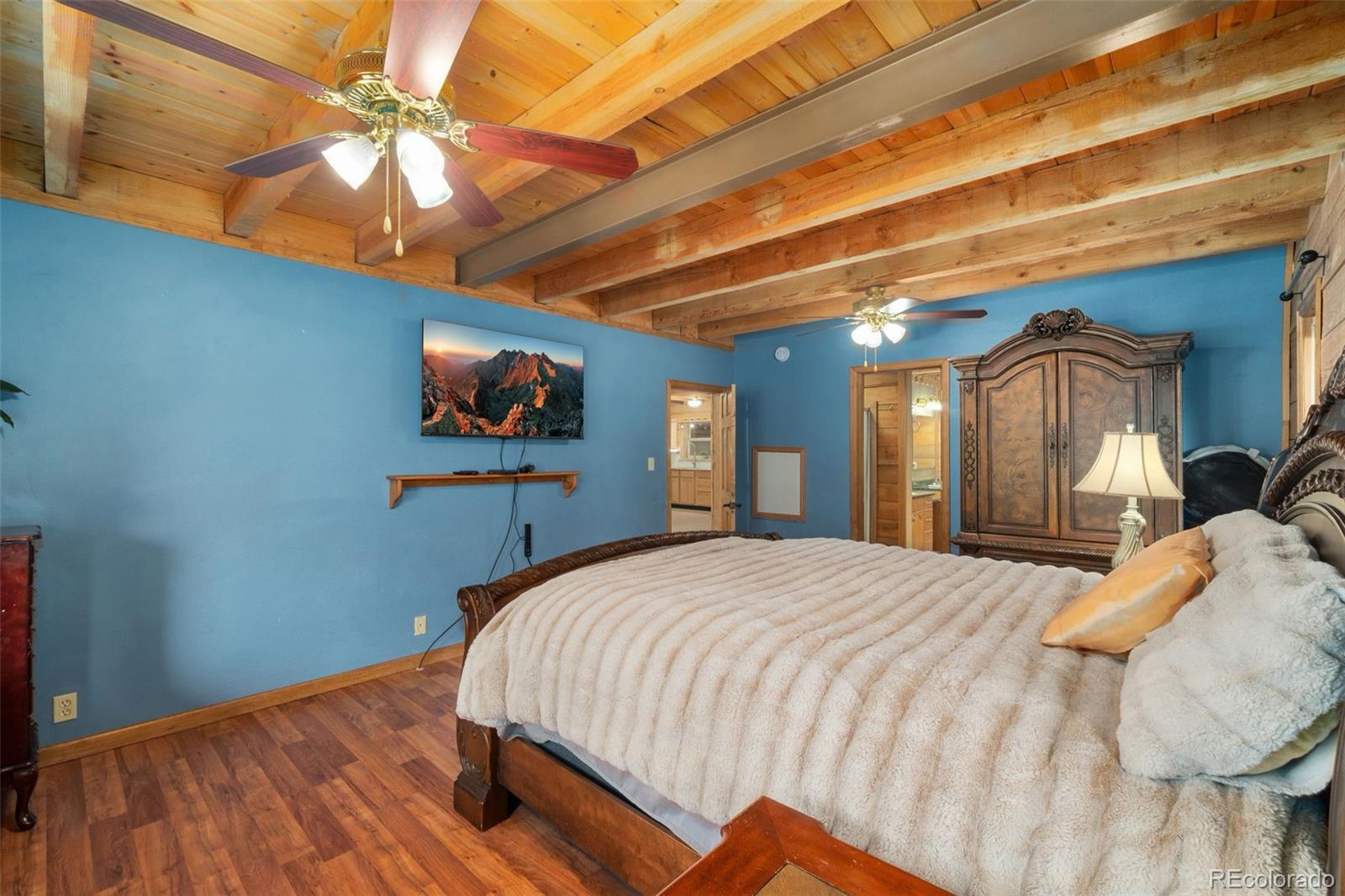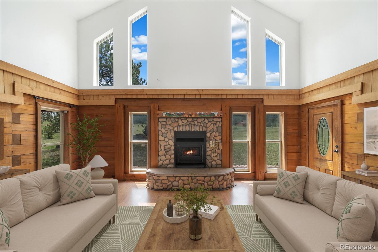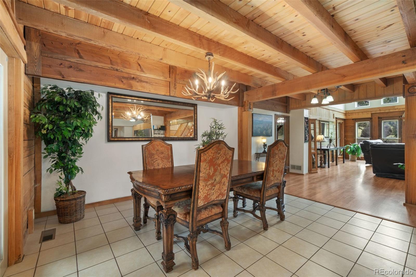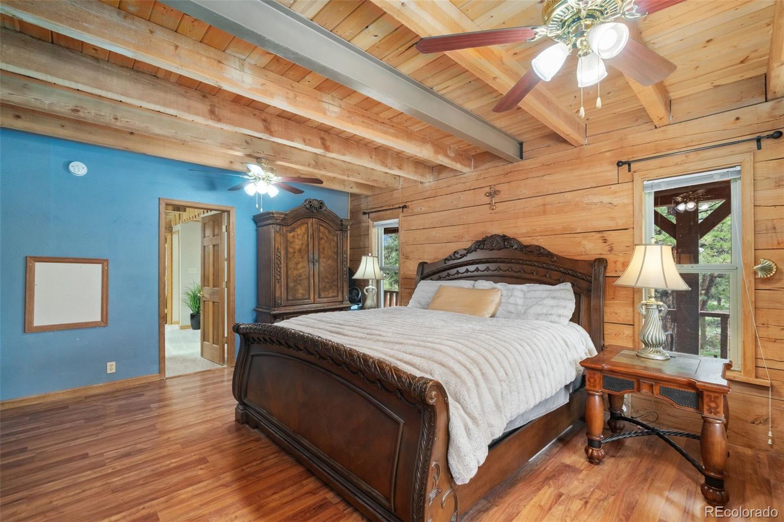 Experience the perfect blend of craftsmanship and natural beauty in this exceptional 4-bedroom, 3-bath custom log home nestled on 3.52 acres in the heart of Glacier View Meadows. Constructed with rare sinker cypress logs sourced from Mississippi trees, this 3,037 sq ft residence offers a unique and timeless appeal. Step inside to discover soaring cathedral ceilings and tongue-and-groove beamed ceilings that enhance the spacious living areas. The impressive great room features a handcrafted mantel and carved staircase timbers, adding to the home's rustic charm. The spacious kitchen and dining area, adorned with timber ceilings, provide the perfect setting for gatherings. The master suite boasts a luxurious 5-piece bath and dual walk-in closets, offering a private retreat. A loft-style recreation room provides ample space to entertain. Enjoy the outdoors on the expansive wraparound deck, or relax in the hot tub under star-filled skies. The property also includes a heated 2-car garage, a shop/workout room, and a 20x24 pole barn, providing ample space for hobbies and storage. Located just 50 minutes from Fort Collins, this home offers easy access to hiking trails, fishing spots, and the amenities of Red Feather Lakes. The Glacier View Meadows HOA maintains roads, private community ponds, open spaces, and hiking trails, ensuring a well-kept and vibrant community. Don't miss the opportunity to own this one-of-a-kind mountain retreat that seamlessly combines rustic elegance with modern comforts.