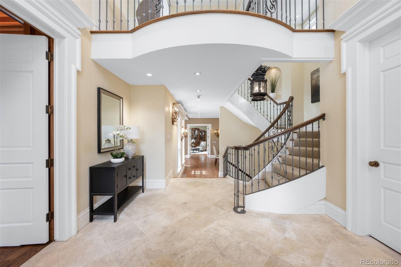 Exceptional value in Cherry Creek North! The private inner courtyard is the focal point—an intimate yet grand entertaining space framed by Napoleonic-era wrought iron gates, spectacular gardens, an intriguing fountain, and visible from every main-level room. Whether hosting elegant dinners or relaxed gatherings, the courtyard creates a seamless connection between indoor and outdoor living. Expansive windows and skylights fill the home with natural light, enhancing the home’s warm, inviting atmosphere. A two-story foyer crowned by an early American chandelier introduces a richly appointed library with cherrywood paneling, complete with a handcrafted coffered ceiling and fireplace. The open-concept main level flows effortlessly between the kitchen, dining area, and gracious living spaces. The expansive kitchen features granite countertops and a large center island designed for gathering. The light-filled primary retreat offers a serene escape with a sitting area and private terrace overlooking the courtyard. A luxurious primary bath and spacious dressing room complete the suite. An additional en-suite bedroom on the upper level provides flexibility for guests or work-from-home living. The lower level expands the home’s versatility and offers numerous possibilities with two additional en-suite bedrooms, a theater, and a mirrored exercise room, wet bar/kitchen - ideal for guests, wellness, and entertainment. An elevator services all three floors, and an oversized three-car garage with built-in storage adds uncommon convenience. Discover a rare opportunity to experience refined living and exceptional entertaining in one of Denver’s most coveted neighborhoods—Cherry Creek North.