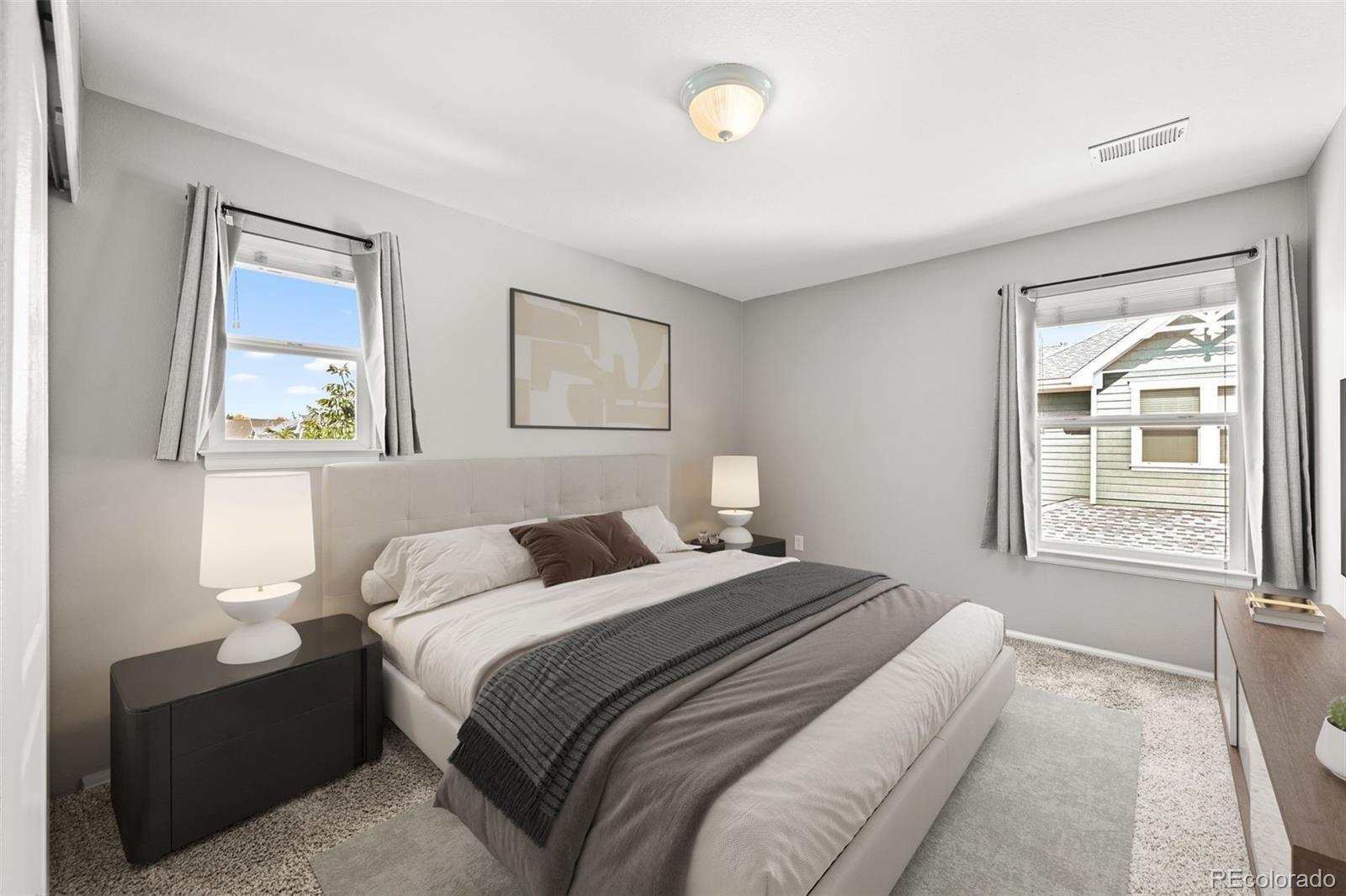 Welcome to this beautiful Central Park two-story, featuring a charming front porch and fenced yard that set the tone for inviting curb appeal. Step inside to a bright, open layout with fresh paint and natural light flowing through the main living and dining spaces. The spacious kitchen offers plenty of cabinetry, counter space, and sightline to the family room — perfect for everyday living and entertaining. Upstairs you’ll find brand new carpet - a generous primary suite with a large walk-in closet and 5-piece bath, complete with double vanities, soaking tub, and separate shower. Two additional bedrooms, a full hall bath, and laundry room with washer/dryer complete the upper level. Major mechanical updates include a brand-new roof, furnace, central A/C, and water heater, providing true peace of mind. Outside, enjoy the private fenced yard, corner lot, and attached two-car garage. This location is truly special — just steps from restaurants, shops, and neighborhood parks, with miles of trails right outside your door. Walk to two nearby pools (Puddle Jumper and Aviator) or the Toca Denver Crossfit gym, less than a block away. With seven community pools, endless open space, and a vibrant mix of amenities, the lifestyle here is unmatched. Plus, you’ll enjoy quick access to top-rated schools, Anschutz Medical Campus, DIA, and Downtown Denver. Move-in ready and perfectly situated, this is an opportunity you don’t want to miss! Offers are being accepted through FinalOffer.com, where buyers can view terms and submit offers transparently. Don’t miss your chance — this home stands out as one of the best values in Central Park!