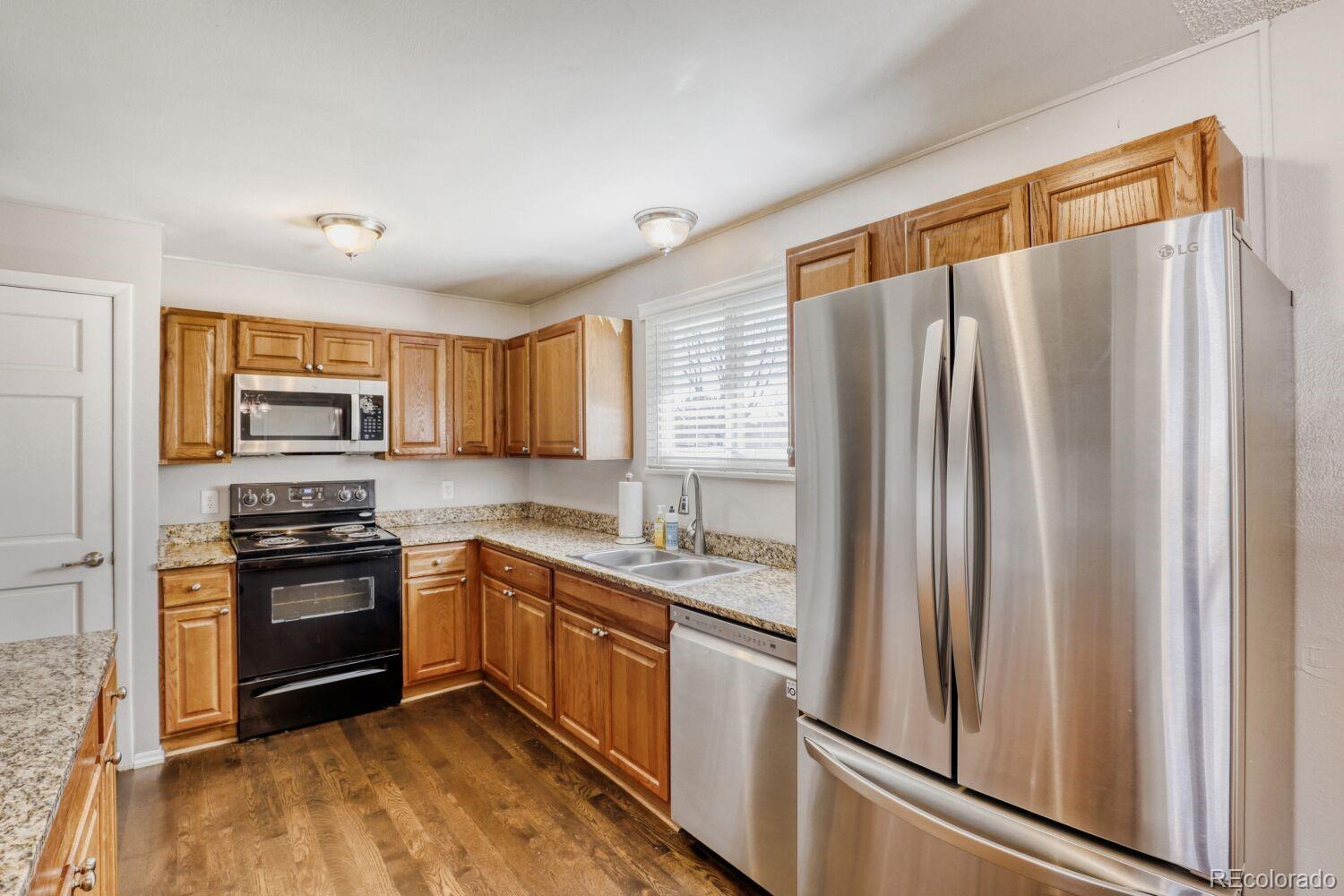 Beautifully upgraded four-bedroom, two-bath ranch in highly sought-after Aurora Highlands on a premium corner lot. This open-concept home is filled with natural light from large windows throughout. The updated kitchen features granite countertops, new appliances, and a bright eat-in dining area. The main level includes the living room, a secondary bedroom, full bath, and a spacious primary suite with updated wood flooring and custom paint. The finished lower level offers two additional bedrooms, bathroom, and a flexible rec/family room with a cozy wood-burning fireplace — perfect for guests, multigenerational living, or remote work. Enjoy the professionally landscaped backyard with a new patio, plus easy access to shopping, dining, and entertainment. Move-in ready with clear pride of ownership. Other home highlights include: New hot water heater, New interior paint, updated wood flooring, New backyard landscaping-warranty included.