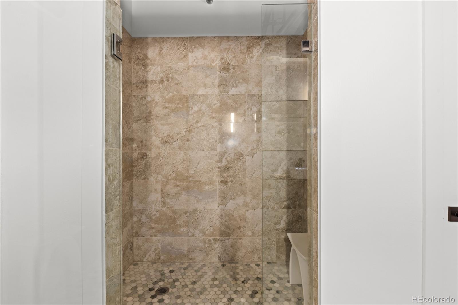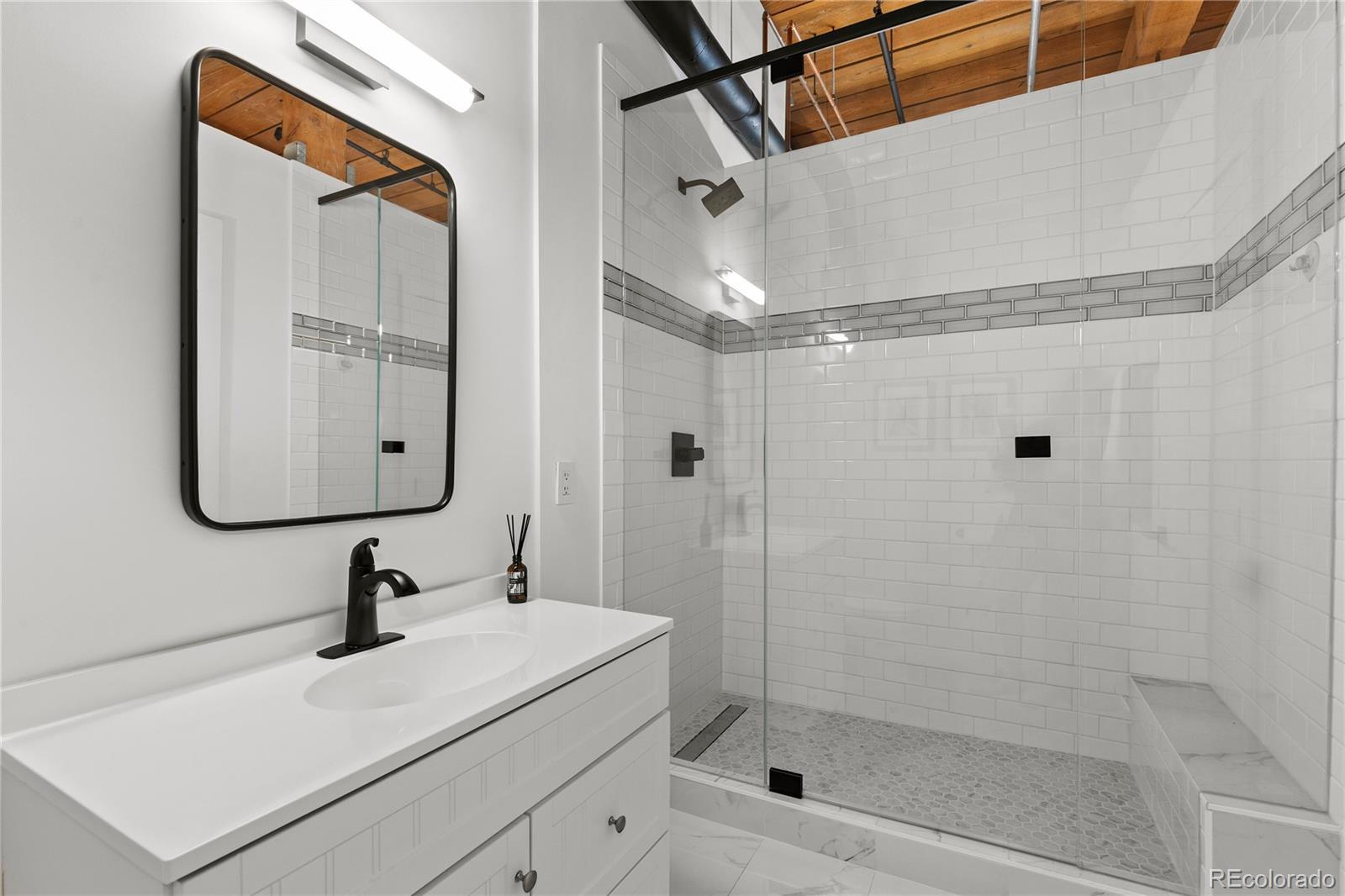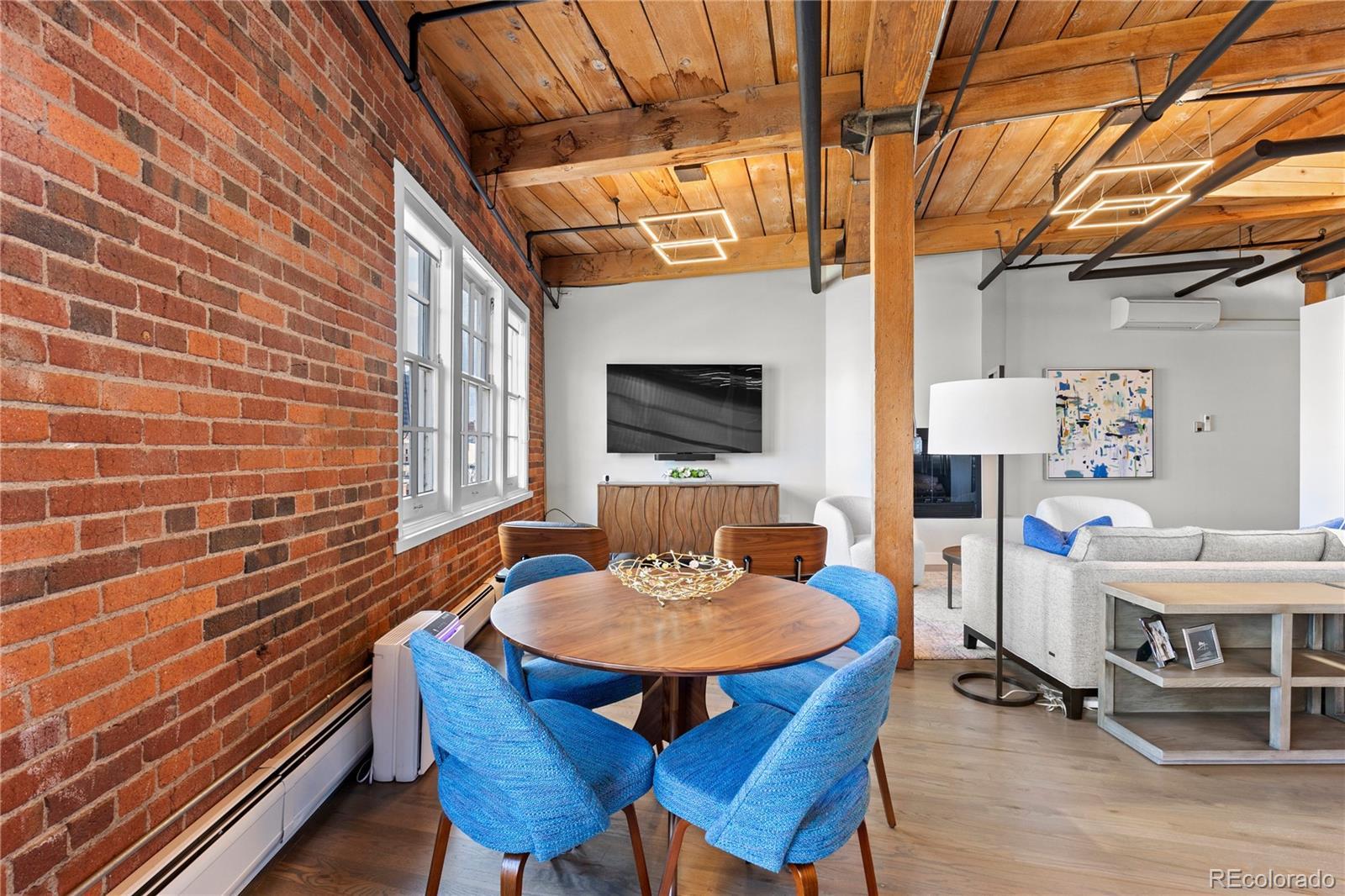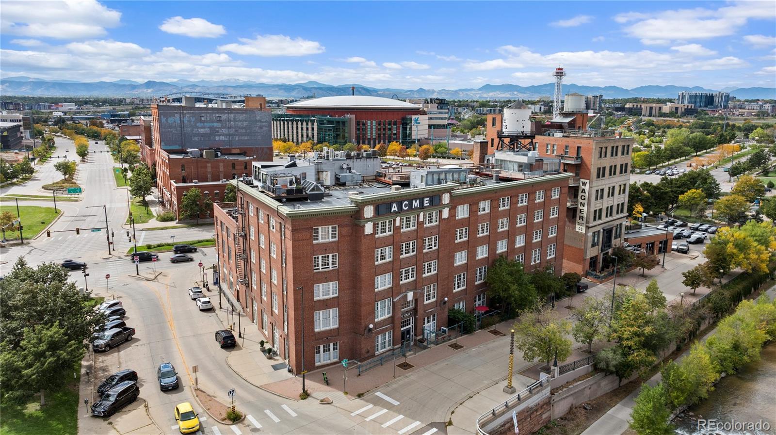 Discover refined loft living in this remodeled penthouse at the historic Acme Lofts in LoDo. Dramatic 18-foot ceilings, exposed brick, and original beams create a striking backdrop for an open and light-filled floor plan. Anchored by a gas fireplace, the living room flows into a chef’s kitchen with Caesarstone quartz counters, European soft-close cabinetry, and premium Thermador appliances. The primary suite offers a large walk-in closet and an updated three-quarter bath, while the second bedroom features a striking skylight with roof access, a unique detail that enhances both light and function. Both baths have been fully renovated with modern finishes. Recent improvements include upgraded chain window coverings, two mini split AC units for customizable cooling, and a new building-wide security system. Hardwood floors throughout, in-unit laundry, and garage parking add everyday convenience. Rare roof rights provide potential for expansion or a private rooftop deck. From the shared rooftop terrace, take in 360-degree city and mountain views. Set in the heart of LoDo with a walk score of 94, this home is steps from Union Station, Coors Field, Ball Arena, and Denver’s best dining and culture.