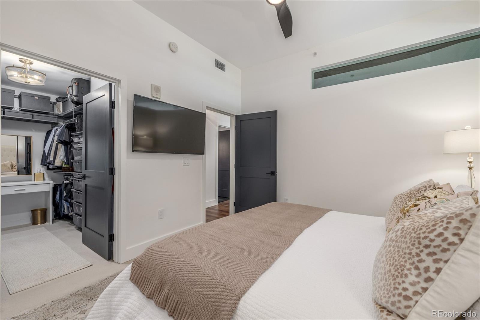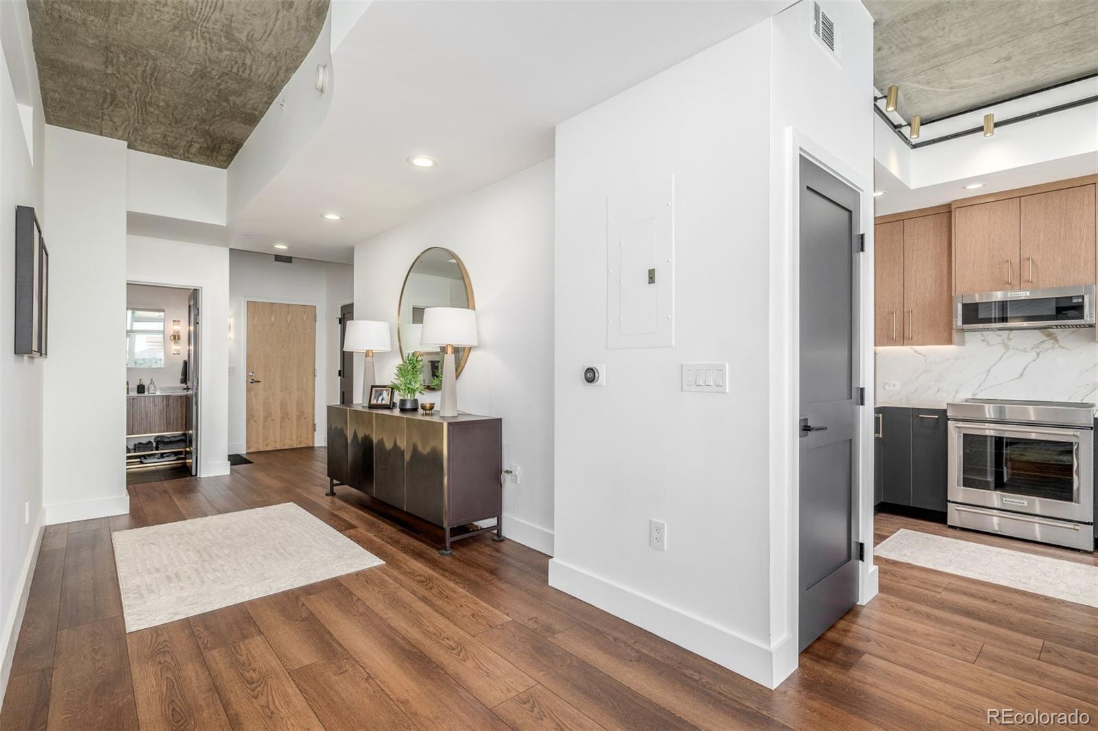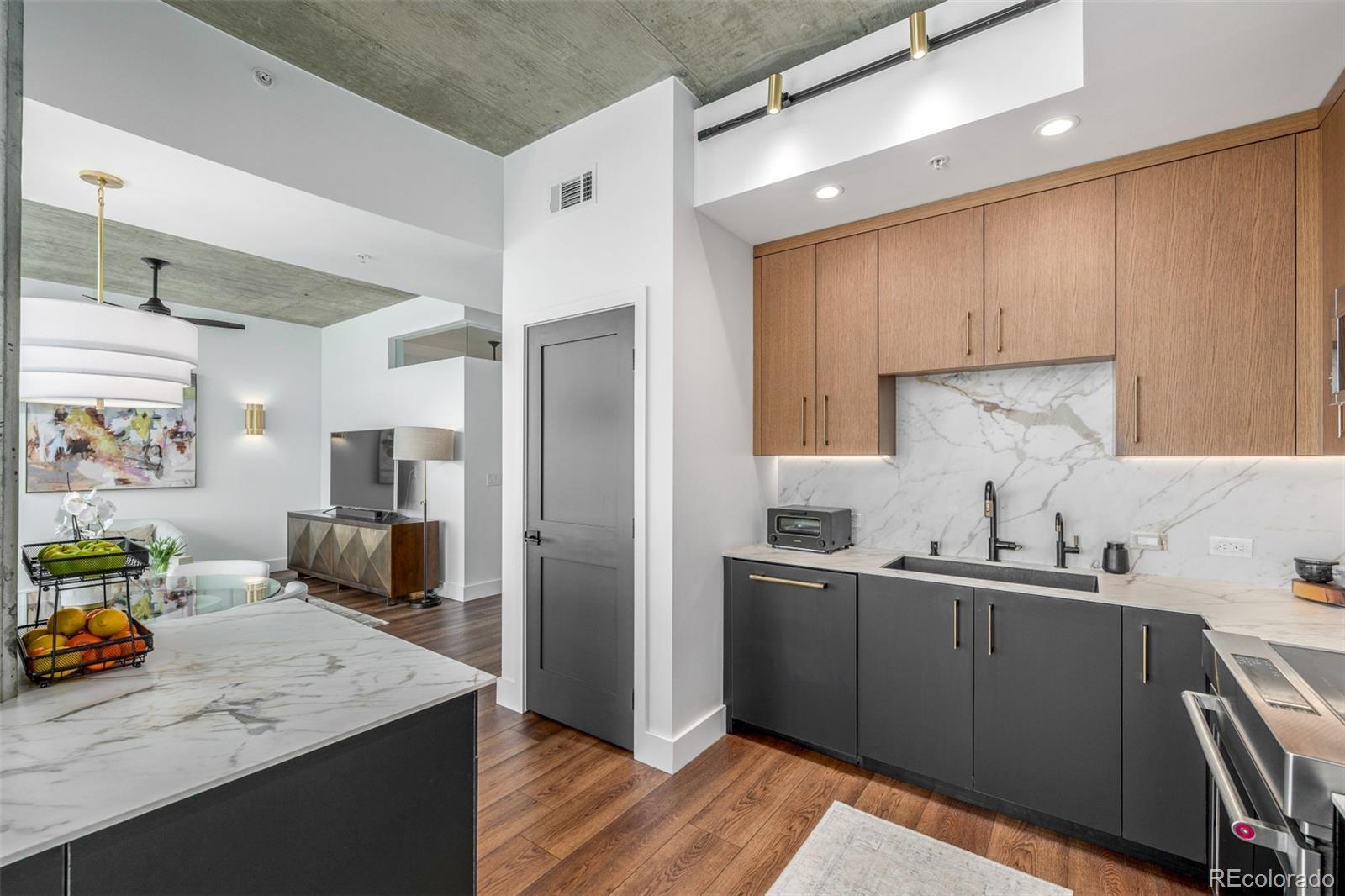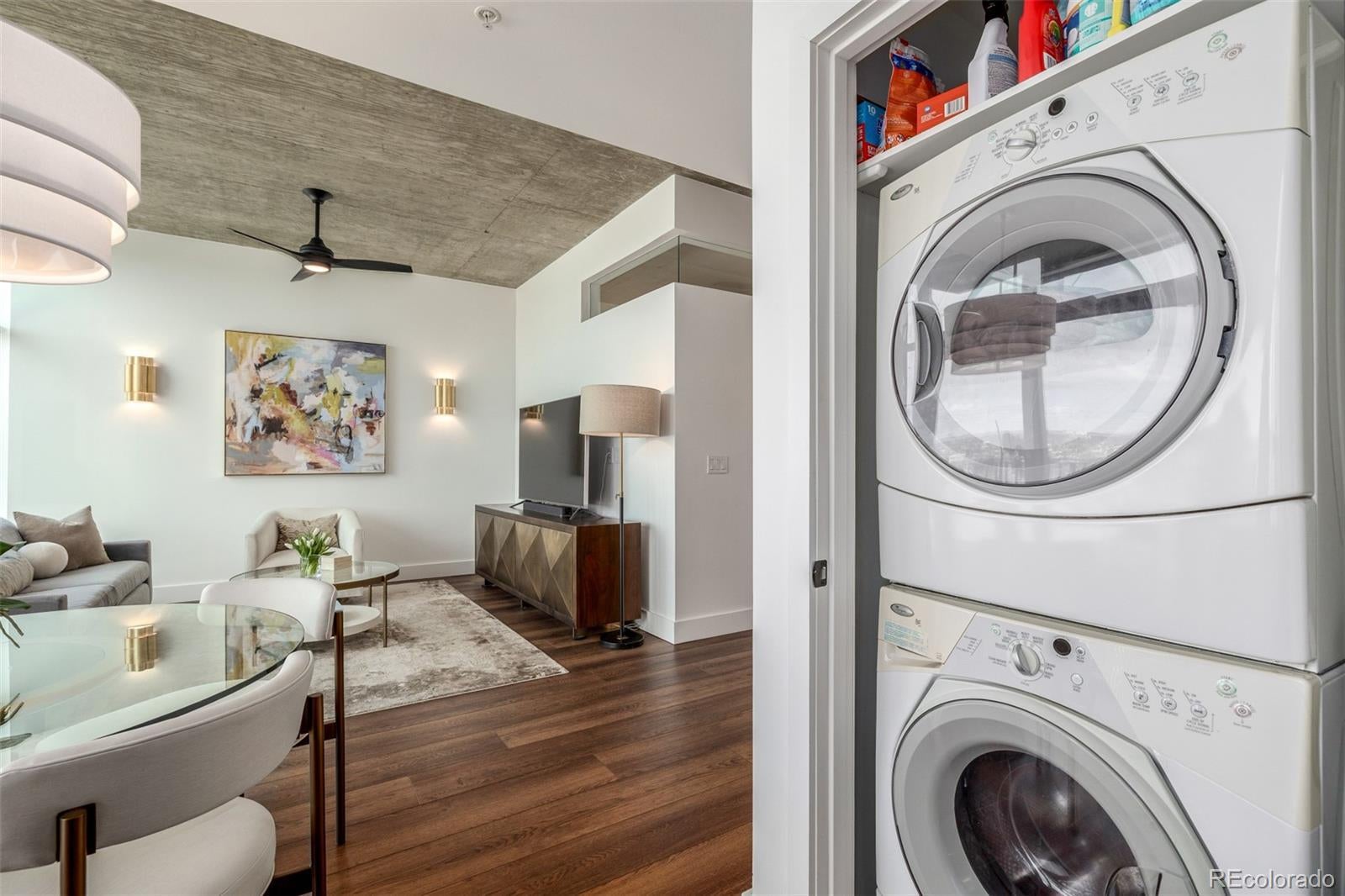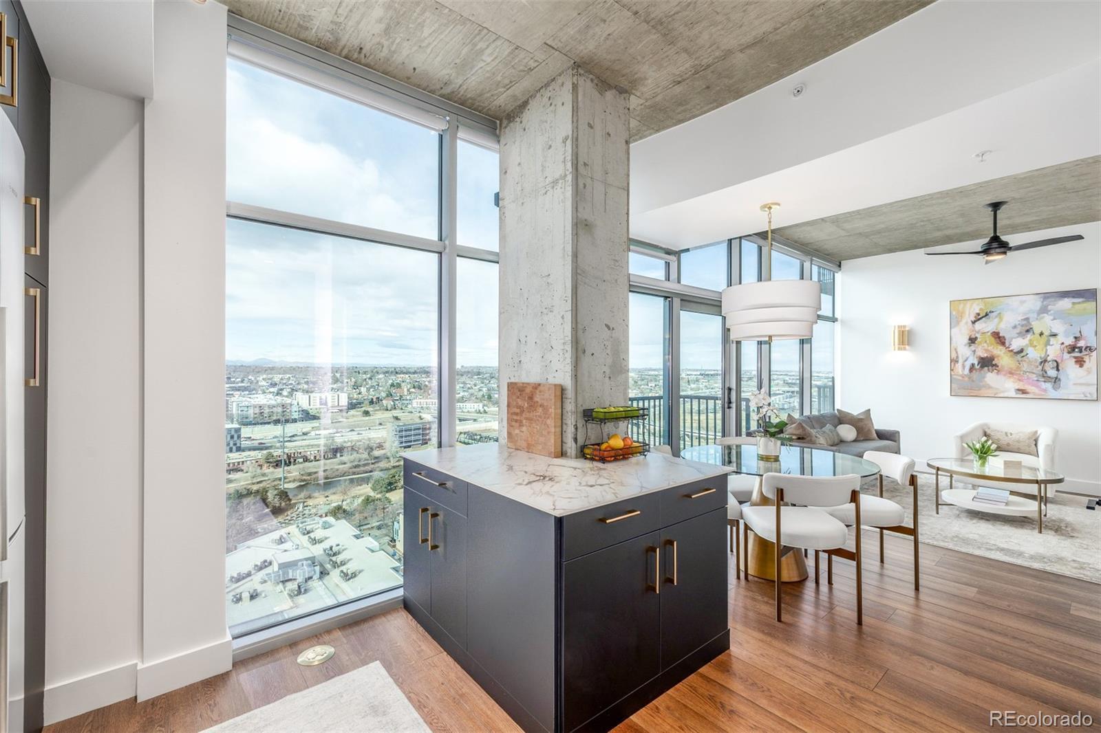 This stunning fully renovated 19th-floor condo in the iconic Glass House offers a blend of modern design, breathtaking views, and unbeatable convenience. Step inside and discover a thoughtfully designed layout. The living room with floor-to-ceiling windows floods the home with natural light and showcases the vast views of the Front Range Mountains, Commons Park, and the Platte River. The sleek all new European modern style kitchen with 2cm Porcelanosa counter tops, full 42" height cabinetry, under cabinet, lighting, lazy-Susan corner cabinet, pantry with pull outs and an added island for additional counter space. Additional features include a KitchenAid Induction cooktop, stainless oven and microwave and Bosch a refrigerator. There is new luxury vinyl flooring throughout, new trim, luxury doors and roller window blinds, all adding warmth and sophistication. The bedroom is generously sized and has an added glass transom window to adds natural light. The large closet is ELFA-outfitted for shelving , while an oversized hall closet provides even more storage. Living in the Glass House means enjoying world-class amenities right at your fingertips. The 8th-floor pool and clubhouse level offer a tranquil escape, complete with a rooftop fire pit, community BBQ grills, workspaces, lounge and cityscape views. Health enthusiasts will love the included membership to the private Riverfront Athletic Club, offering personal training and a variety of fitness classes. Situated in the heart of Riverfront Park, one of Denver’s most coveted neighborhoods, just steps from Commons Park, the Platte River, and a vibrant mix of restaurants, shops, trails, and entertainment. Commuters have quick access to I-25, Union Station and the close connection to the newly updated 16th Street and the free transit buses for easy access to the central business district. Plus, you’ll enjoy the added convenience of one of the widest & best parking spaces #039 private storage unit on level 1-#107.