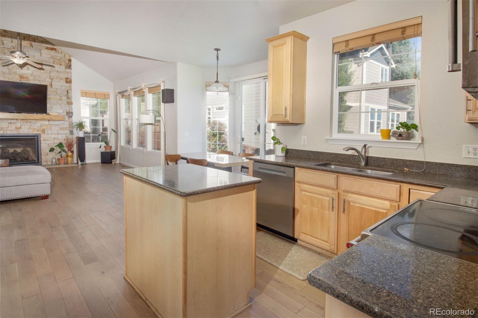 Experience golf course living at its finest! This beautiful and spacious 2-story home sits along the Ute Creek Golf Course, offering stunning golf and water views from many rooms. Step inside to find a warm and welcoming study with radiant heated floors, and an elegant formal living and dining room-perfect for entertaining. The updated kitchen features an island, granite countertops, stainless steel appliances including a stove with 1 1/2 ovens, pantry, and a sunny breakfast nook that opens to the inviting family room with soaring ceilings and a stone-surround gas fireplace. Enjoy seamless indoor-outdoor living with a sliding door leading to the patio, garden, and backyard. Beautiful wide-plank hardwood floors flow throughout, complemented by tile in the baths and laundry room, which includes cabinetry and a sink. Upstairs the luxurious primary suite offers a private retreat with cathedral ceilings and a cozy gas fireplace-your own serene escape. You'll find two additional bedrooms plus a spacious 20x15 bonus/flex room, ideal for a home office, gym, or media space. A full unfinished basement provides endless possibilities. Enjoy peaceful mornings and quiet evenings from your own golf course haven.