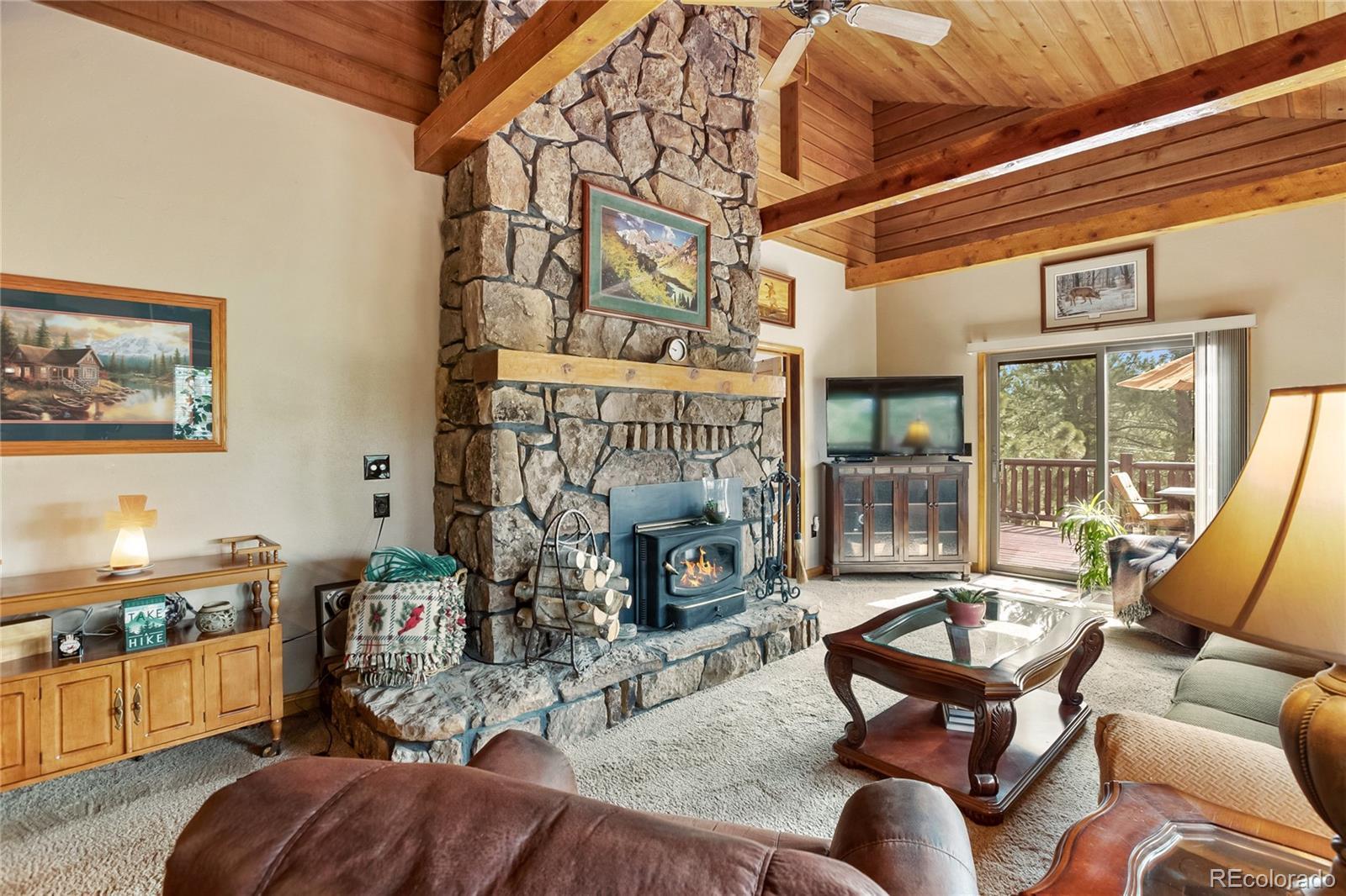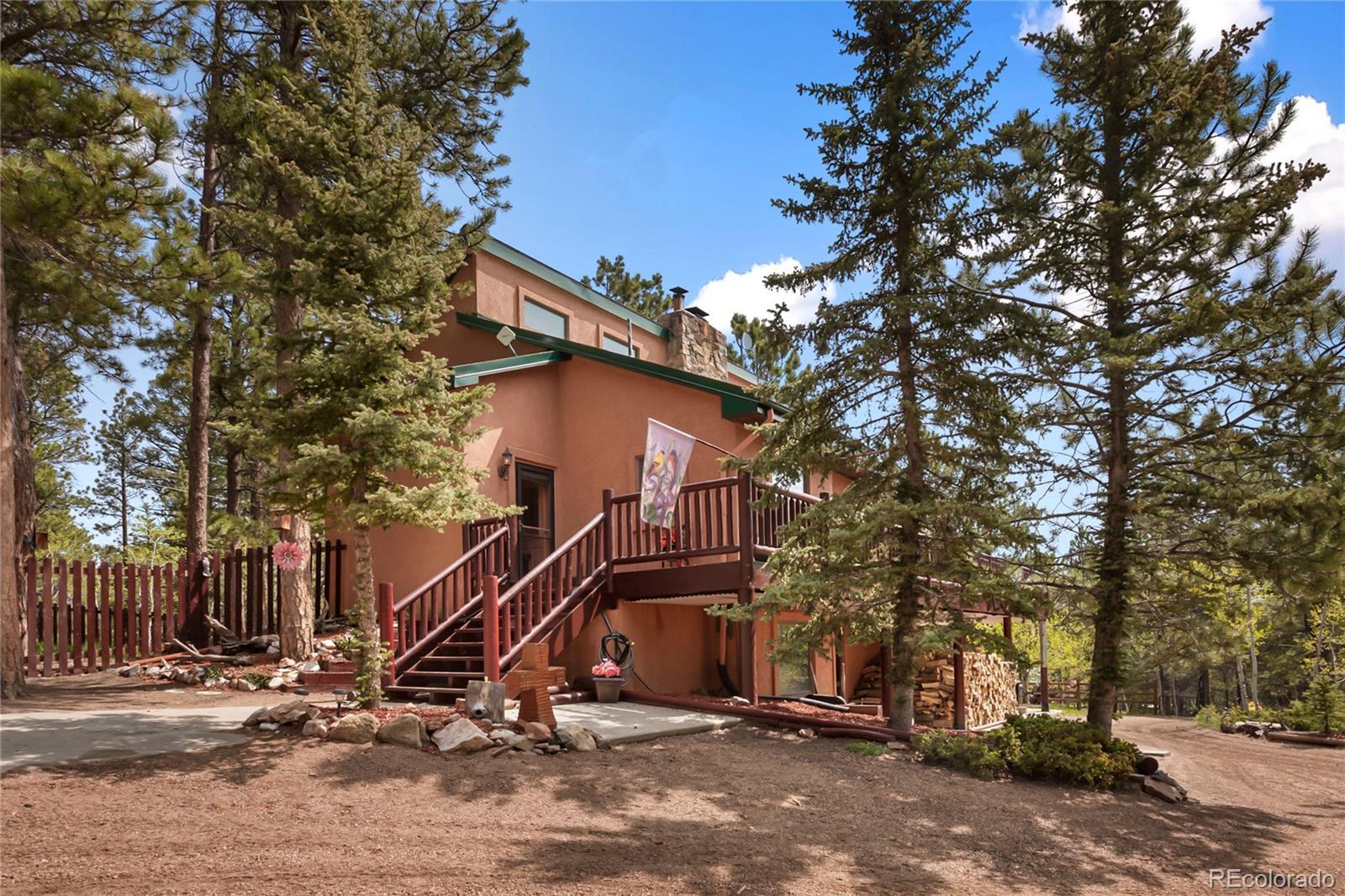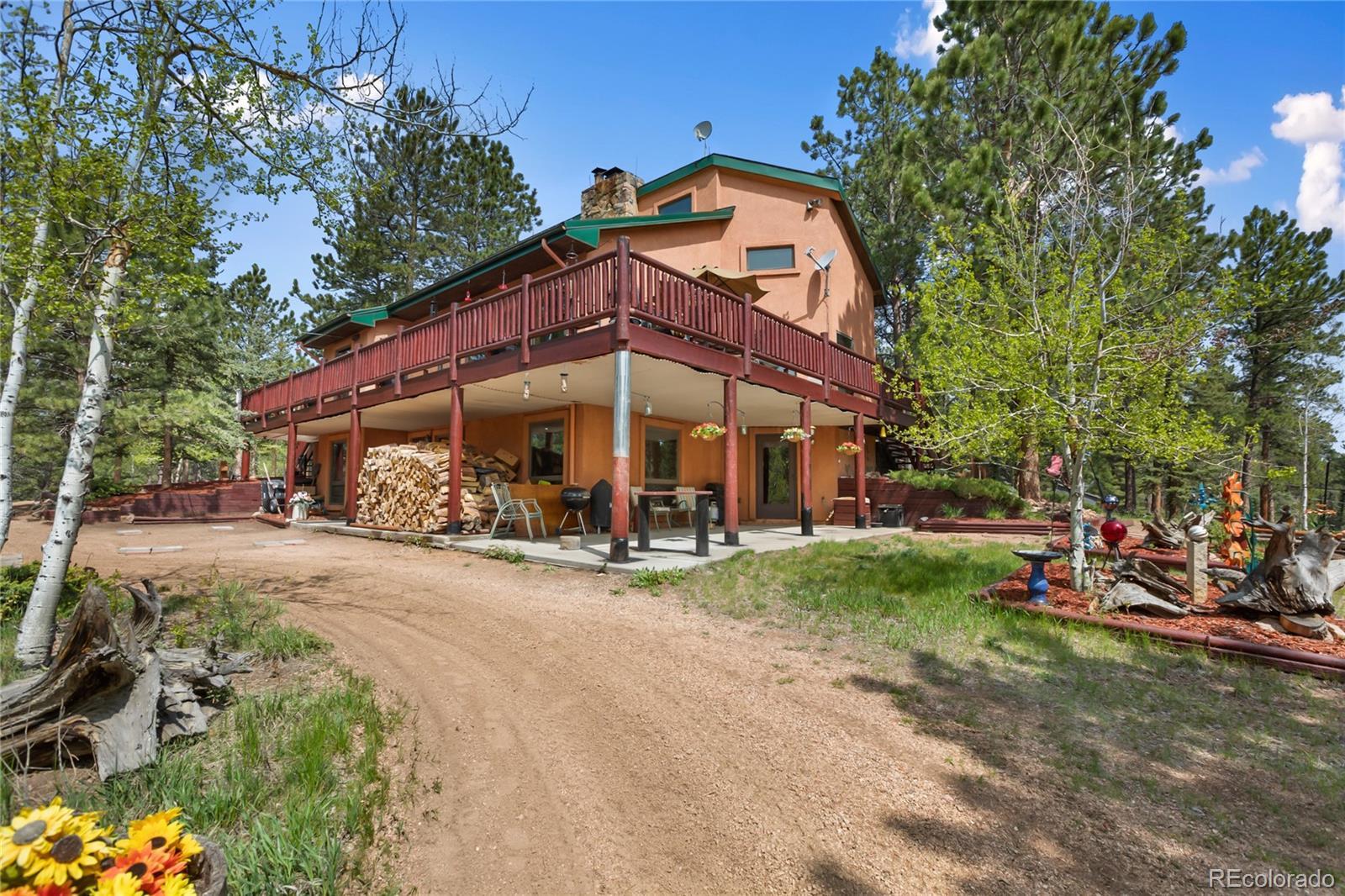 Stunning home nestled on a serene 5.49-acre lot with private, picturesque setting. Home offers 4 spacious bedrooms, 2 baths, and a sleek galley kitchen with quartz countertops, newer appliances (refrigerator, gas range/oven, dishwasher, disposal, microwave), rich oak cabinets, wood flooring, and charming tongue-and-groove ceilings on the main level. Spacious living room with a moss rock fireplace and wood insert, plus large windows for ample light and passive solar. Main-level master suite with full bath and his-and-hers closets. Upper level includes an office or fourth bedroom. The lower level offers a 23x14 family room with a wood stove, storage, two additional bedrooms, a 3/4 bath, and walkout access to the front yard and side patio. Laundry room includes washer, dryer, extra refrigerator, and freezer. Detached two-car oversized garage with workshop and attic storage. Includes log splitter, Polaris ATV, power washer, and firewood. Well and septic system. Large fenced backyard with flowerbeds, Ponderosa pines, and aspens. Low-maintenance stucco siding and metal roof. Discover your Colorado paradise! Fully Furnished! RV Parking!!!!
