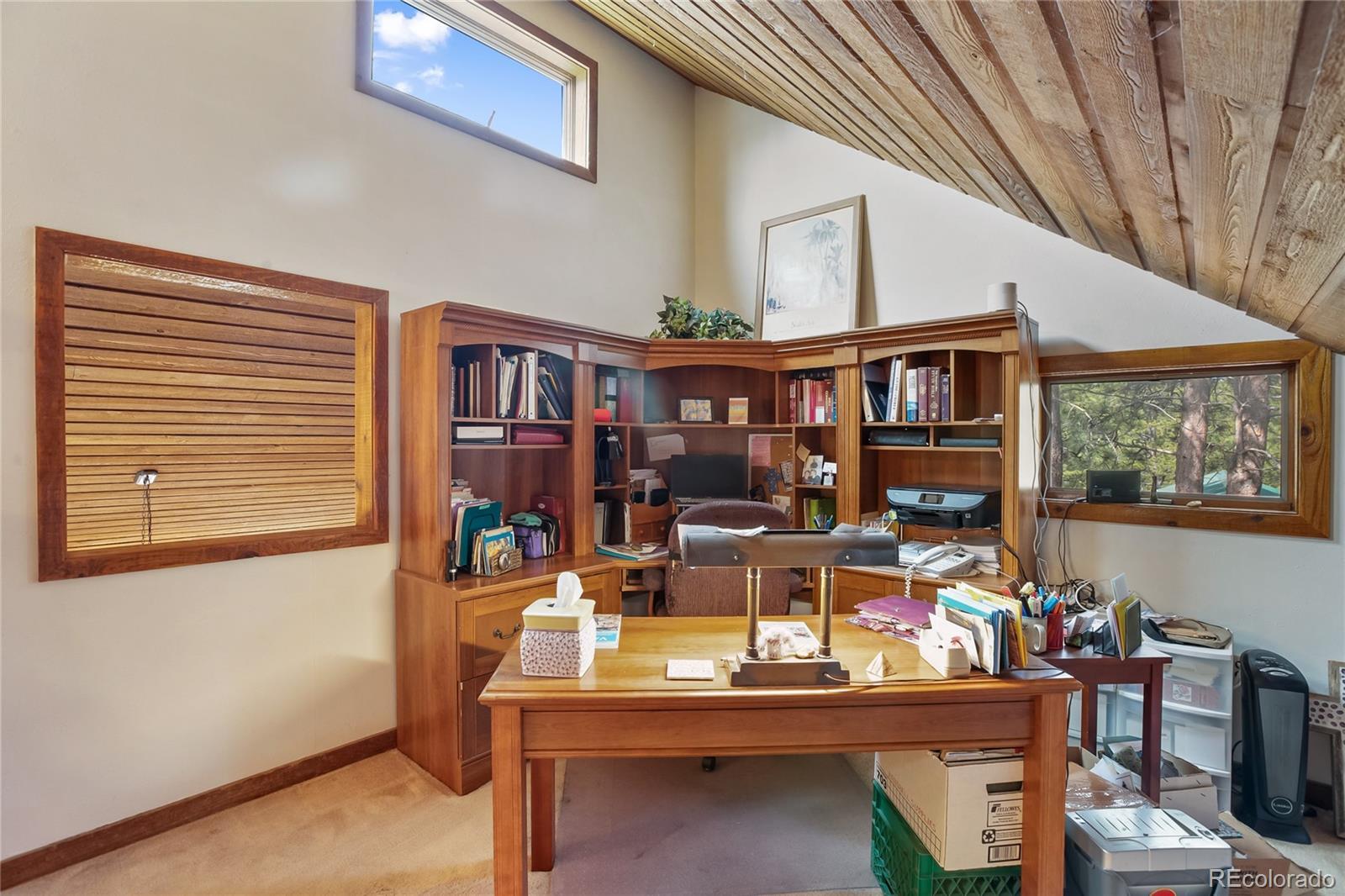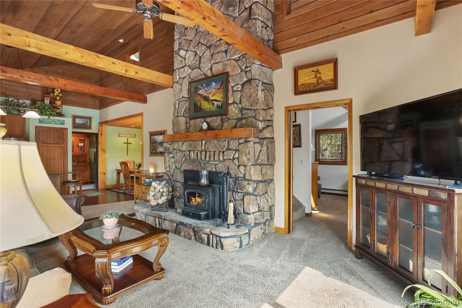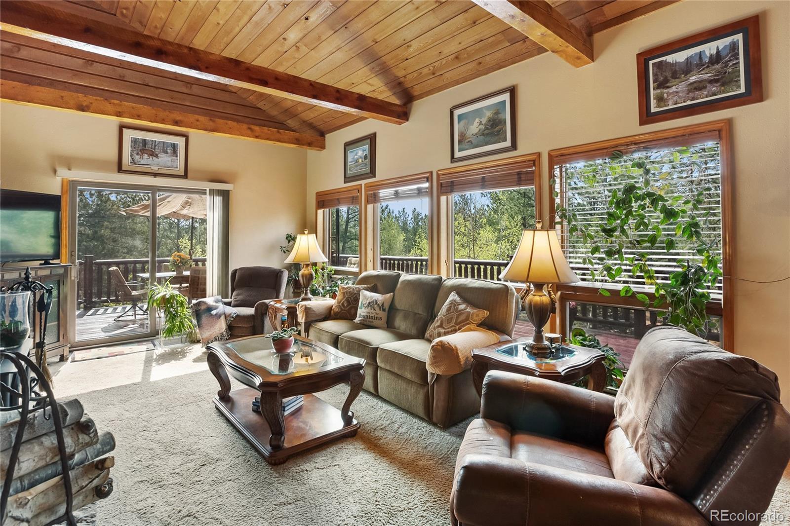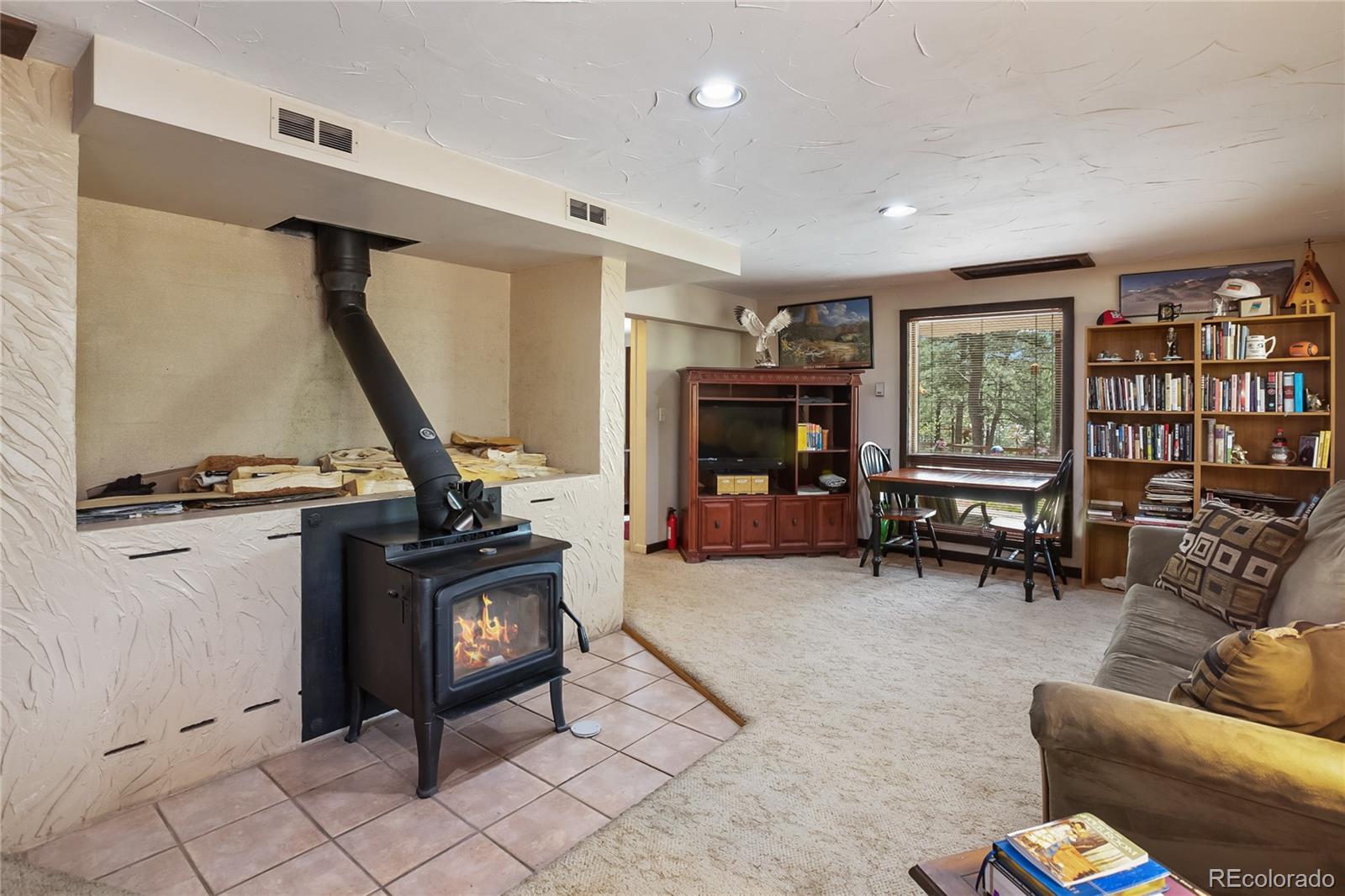 Stunning home nestled on a serene 5.49-acre lot with private, picturesque setting. Home offers 4 spacious bedrooms, 2 baths, and a sleek galley kitchen with quartz countertops, newer appliances (refrigerator, gas range/oven, dishwasher, disposal, microwave), rich oak cabinets, wood flooring, and charming tongue-and-groove ceilings on the main level. Spacious living room with a moss rock fireplace and wood insert, plus large windows for ample light and passive solar. Main-level master suite with full bath and his-and-hers closets. Upper level includes an office or fourth bedroom. The lower level offers a 23x14 family room with a wood stove, storage, two additional bedrooms, a 3/4 bath, and walkout access to the front yard and side patio. Laundry room includes washer, dryer, extra refrigerator, and freezer. Detached two-car oversized garage with workshop and attic storage. Includes log splitter, Polaris ATV, power washer, and firewood. Well and septic system. Large fenced backyard with flowerbeds, Ponderosa pines, and aspens. Low-maintenance stucco siding and metal roof. Discover your Colorado paradise! Fully Furnished! RV Parking!!!!