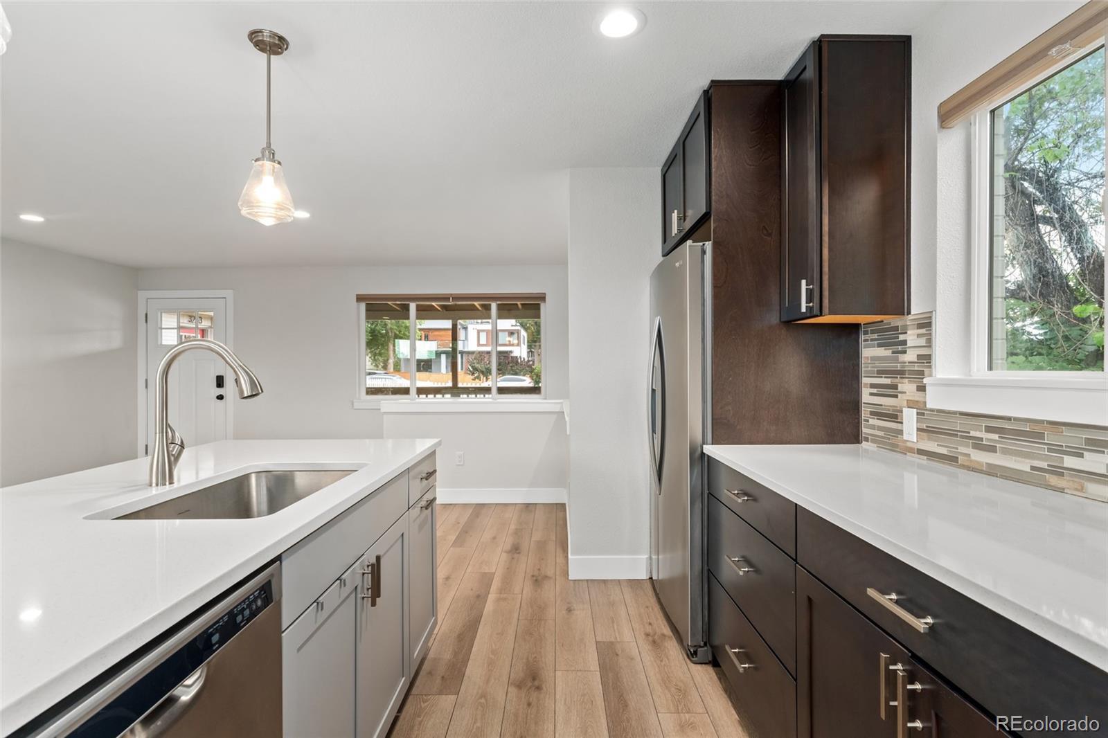 Welcome to this completely updated townhome in the heart of Denver’s highly sought-after Clayton neighborhood—an incredible location just minutes from RiNo, City Park, downtown, and major transit routes! Enjoy the perfect blend of classic charm and modern updates throughout this thoughtfully renovated home. A spacious covered front porch invites you into the open-concept main floor featuring bright living and dining areas that flow seamlessly into the stunning kitchen. Here you'll find rich two-toned cabinetry, gleaming quartz countertops, stainless steel appliances, and a large island with seating and an integrated sink—ideal for both everyday living and entertaining. The main level includes two spacious and sunny bedrooms and a beautifully remodeled full bathroom. Downstairs, the walk-out basement offers exceptional versatility with a large bonus/flex room, a third bedroom, and a dedicated office space—perfect for remote work or creative pursuits. The fully updated lower-level bathroom features dual sinks and an oversized walk-in shower with stylish finishes, while a separate laundry room adds convenience and function. Step outside to your own private fenced backyard retreat, complete with a lush lawn, sunny patio, and access to the detached 1-car garage. Additional highlights include a Sonos sound system, hard-wired ethernet throughout, and breathtaking west-facing views of both the mountains and city skyline—perfect for enjoying stunning Colorado sunsets. Surrounded by mature trees and friendly neighbors, this home feels peaceful and secluded while keeping you close to the energy and amenities of the city. Truly move-in ready and packed with upgrades, this townhome offers the best of urban living!
