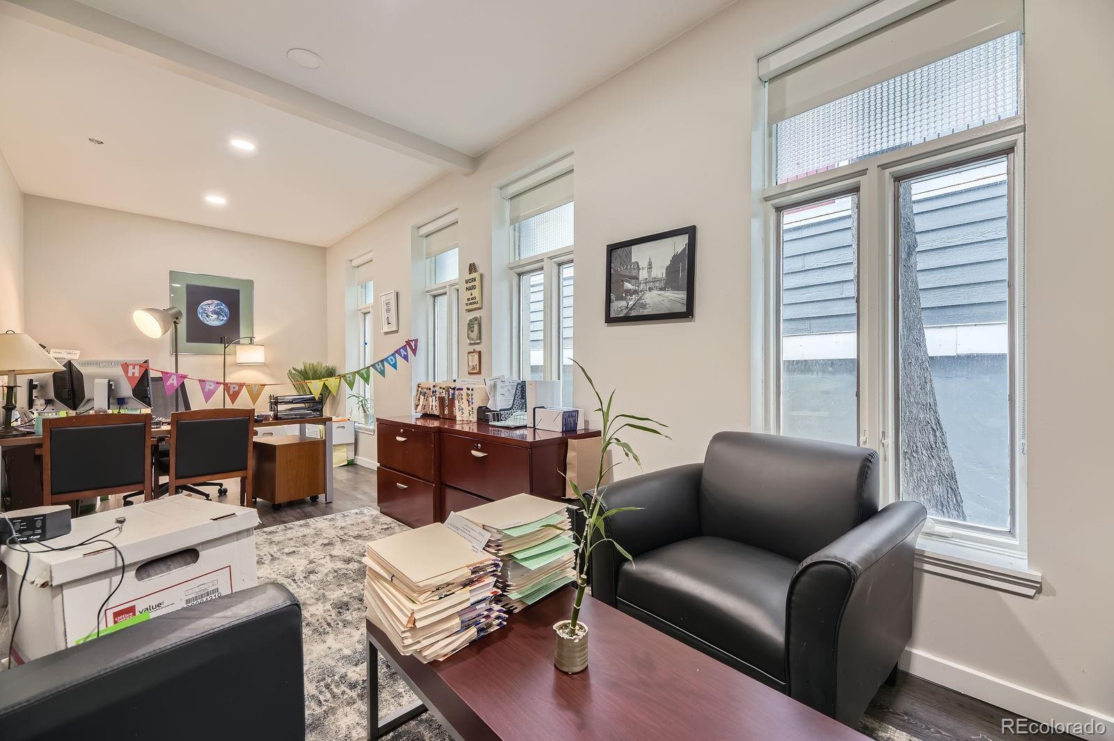 Charming Turn-of-the-Century Office Building (Built in 1902) – For Sale in Downtown Denver Rare opportunity to acquire a distinctive and beautifully updated office building located in one of Denver’s most desirable neighborhoods. Property Features: • Lot Size: 5,450 SF • Building Size: 4,014 SF of office space • Garage: Detached 1.5-car garage for storage or parking a small SUV • Offices: 8 private offices and 3 open shared work areas, with space for up to 8 additional desks • Conference Room: Spacious and well-appointed • Parking: 8 dedicated spaces in a secure, private gated lot accessible via rear alley Currently occupied by attorneys, the building was thoughtfully renovated to support professional office use. The remodel, completed in 2020, included significant updates: • Three modern restrooms • Lunchroom with a fully equipped kitchen • Laundry closet with washer and dryer • Executive office with ample natural light • Newer engineered flooring throughout entire office • Updated paint, carpet, lighting, and window coverings • Fire sprinkler system and security system included • Two rear emergency exits with metal safety doors • Trex decking on front porch and rear deck for low maintenance • New Trex deck with a spiral staircase leading to the parking area • New roof, gutters, and skylights installed before current tenancy This building seamlessly blends historic charm with modern updates to create a professional, functional, and stylish workspace. Many furnishings and fixtures (including desks, shelves, and artwork) are included in the sale — a complete list is available upon request.