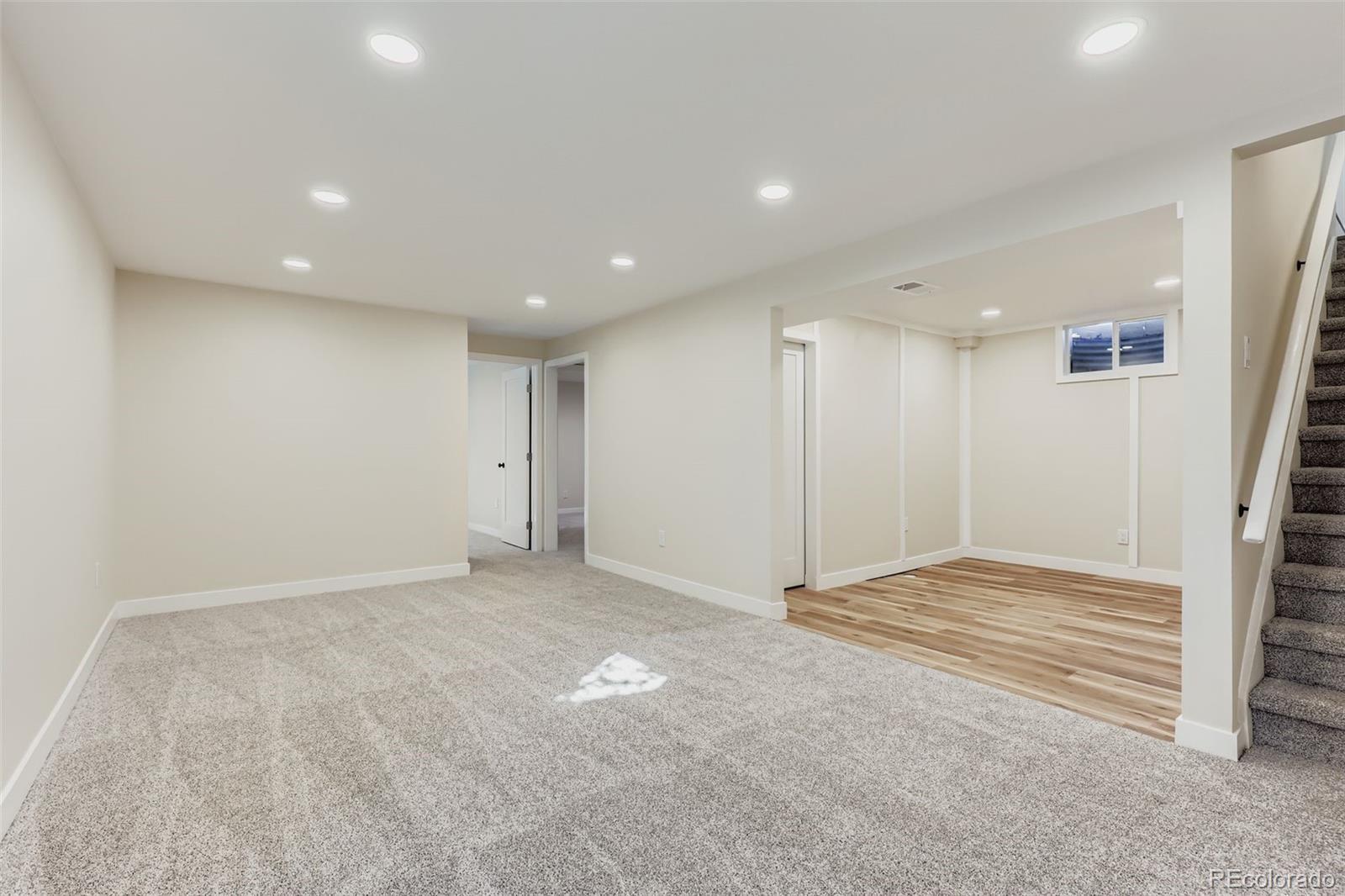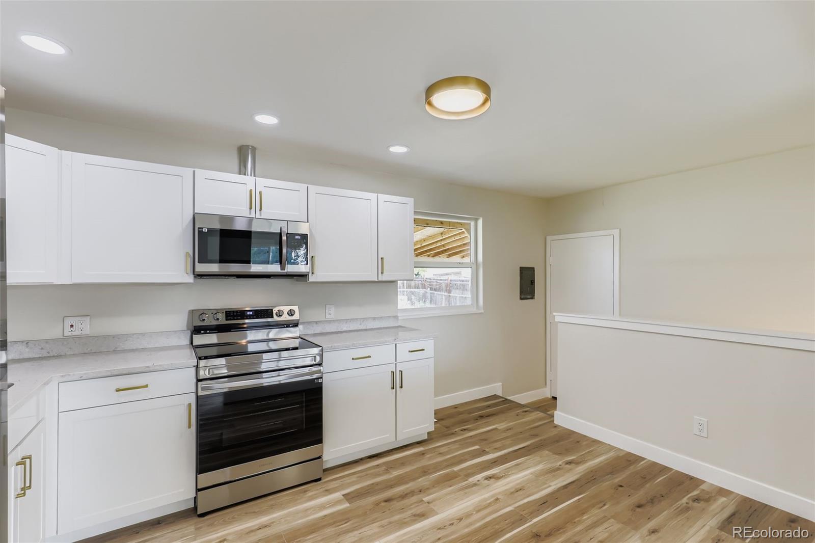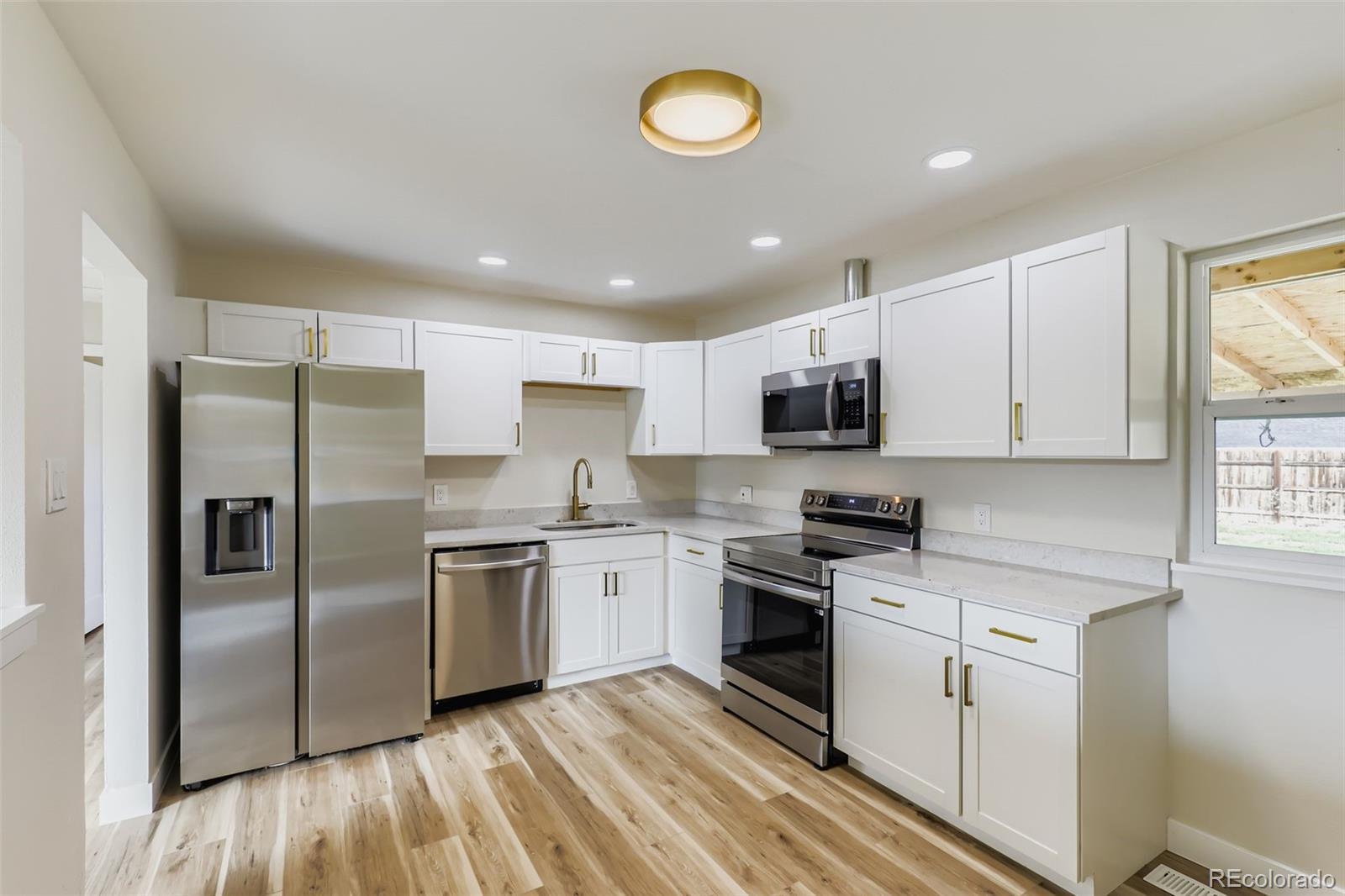 Welcome home to this beautifully remodeled ranch-style home located in Denver's thriving Montbello neighborhood. This turnkey property offers the perfect blend of modern updates and classic charm, with 4 spacious bedrooms – 2 on the main floor and 2 in the fully finished basement – providing flexible living options. Step inside to discover an open and inviting layout featuring luxury vinyl plank flooring, fresh paint, and updated lighting. The modern kitchen boasts sleek quartz countertops, brand-new stainless steel appliances, and new cabinetry –You'll love entertaining and everyday cooking. The main level includes two generously sized bedrooms and a fully remodeled bathroom with contemporary finishes. Downstairs, the finished basement expands your living space with two additional bedrooms (with proper egress), another updated bathroom, a spacious family room, laundry area, and a flex space perfect for a media room, gym, or future bar area. Outside, enjoy a private backyard, ideal for relaxing or hosting, with plenty of room for gardening or future customization. An attached 1-car garage with south facing driveway and additional off-street parking round out this fantastic property. Conveniently located near parks, schools, shopping, and major highways, this Montbello gem offers unbeatable value and comfort. Don’t miss your chance to own this fully updated home – schedule your showing today!