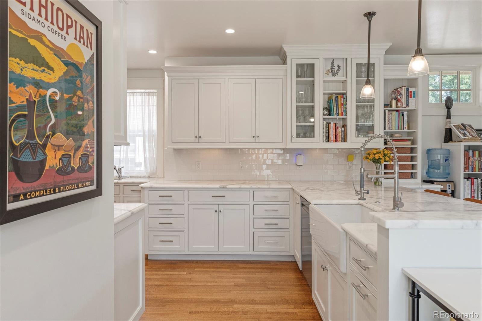 Built in 1915, this home located in the 7th Avenue Historic District is a perfect blend of historic detail and tasteful updates. Thoughtfully restored to retain its vintage character while updating it for contemporary living. Original features abound, including a living room with a fireplace and coffered ceiling, original glass pocket doors lead to the dining room, and intricate woodwork has been lovingly refurbished. The functional layout creates ample space for entertaining both indoors and outdoors. The main floor sprawls with a comfortable living room overlooking the charming covered front porch. A formal dining room adjoins both the chef’s kitchen and living spaces. The kitchen is a dream with tons of storage and counter space + a breakfast bar for informal dining. The sun-filled and spacious sitting room opens beautifully to the back and side yards and the numerous sitting/entertaining spaces. The second floor offers a primary suite with an updated bathroom, plus 2 additional bedrooms and a shared hall bathroom with a dual vanity. There is a bonus room connecting the secondary bedrooms - offering a flex space for an office, or play/tv room. On the third floor, with high ceilings, there are two bedrooms and a full bathroom. The basement is well laid out with a bedroom or rec room, bathroom and a laundry room – plus additional storage throughout. Enjoy the Colorado climate from multiple outdoor spaces, including the welcoming covered front patio and a deck that wraps around the sunny south and west sides of the house. The xeriscaped yard is very low maintenance and sets the perfect backdrop for hosting. The location is hard to be beaten - less than a block from Cheesman Park and the Denver Botanic Gardens. You're also a short distance from local favorites like Satchel's on 6th, Oliver's Market, and Novo Coffee, with easy access to Cherry Creek North and downtown.