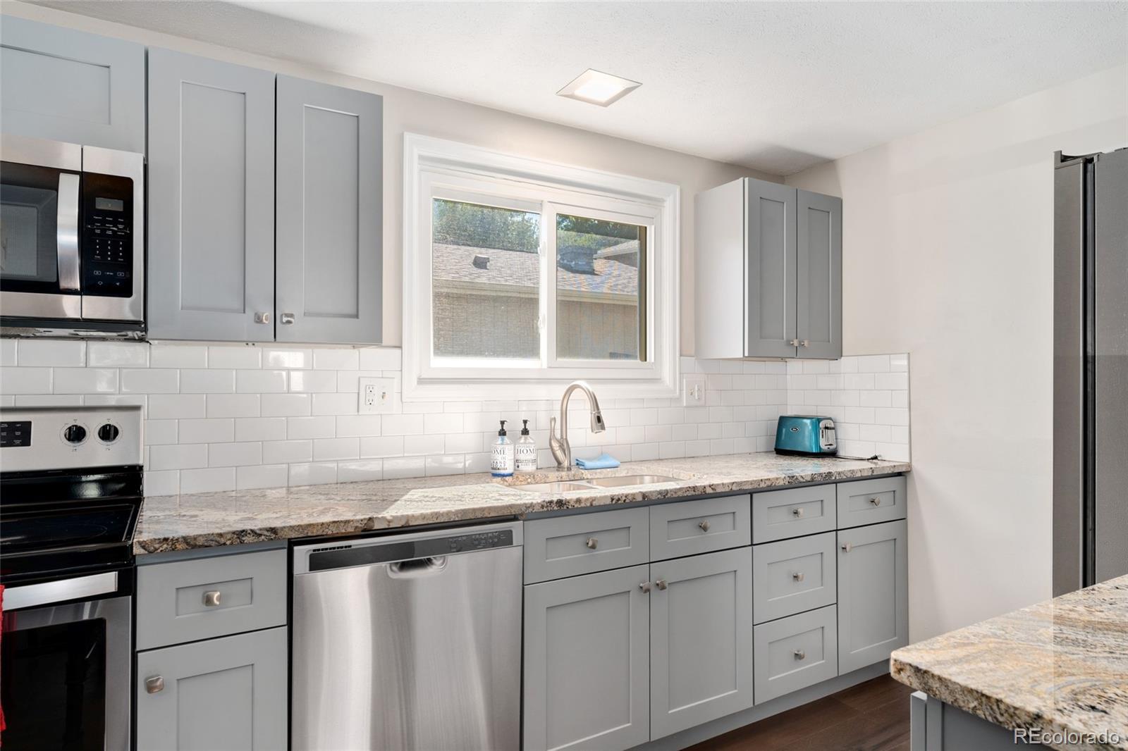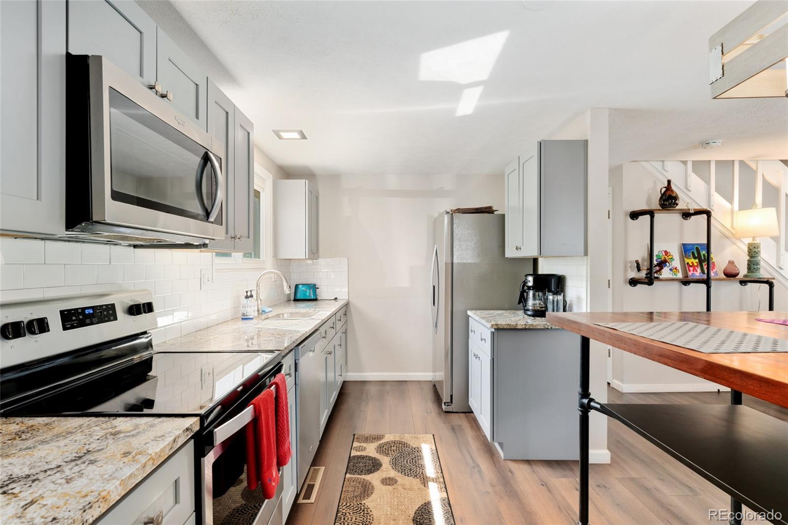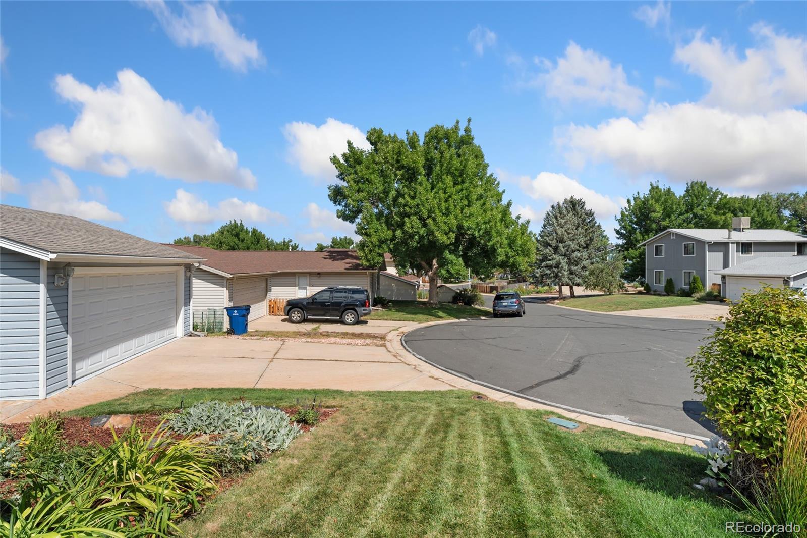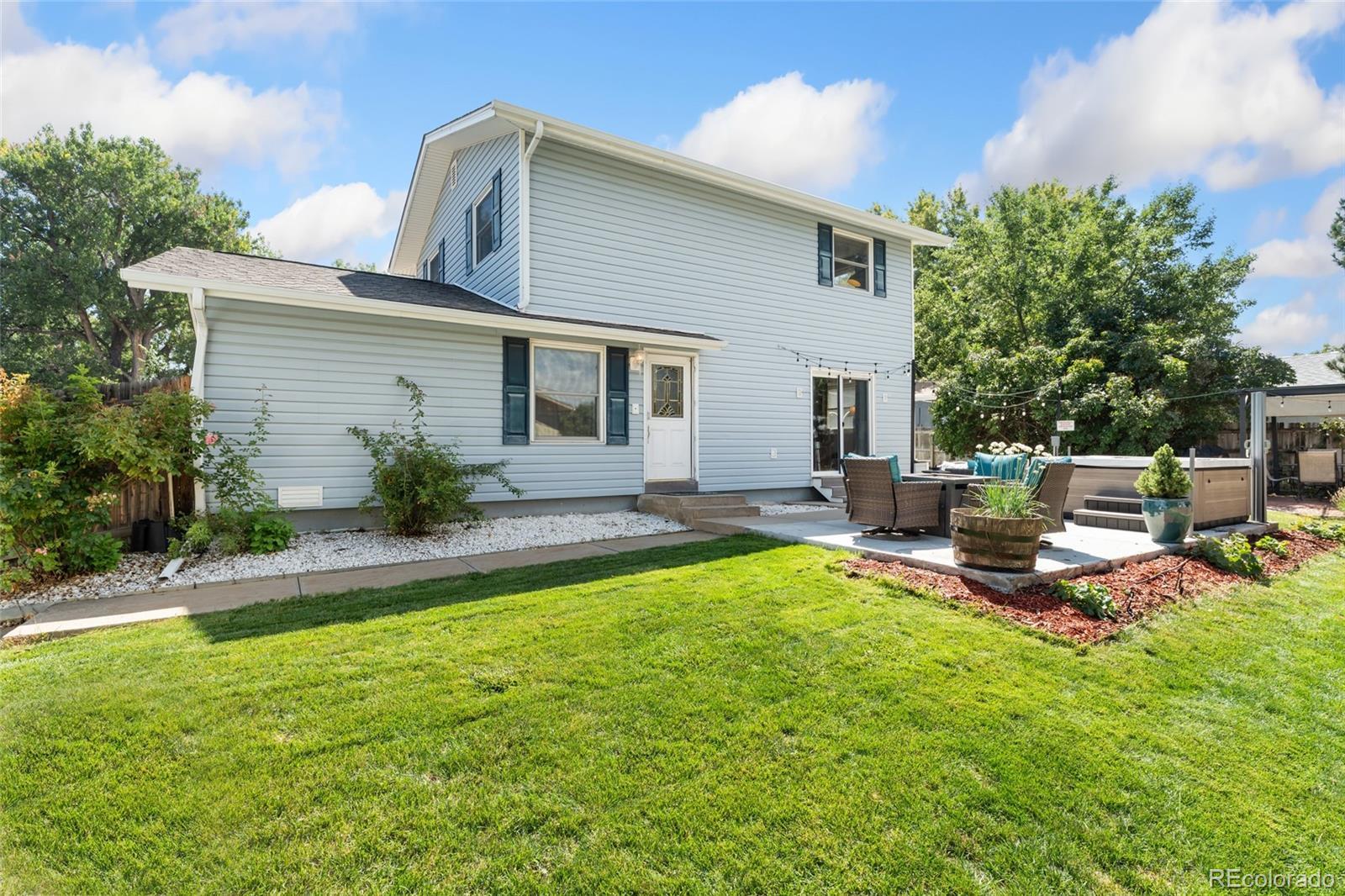 Charming and beautifully maintained, this home is nestled in the desirable Trendwood community on a quiet cul-de-sac street. Step inside to easy-maintenance laminate wood floors and a great open-concept main level. The chef-worthy kitchen features light gray cabinetry, granite countertops, stainless appliances, and a subway tile backsplash. The main level also offers both a living room and family room, with the flexibility to convert the family room into a spacious primary bedroom with an attached bath if desired. Upstairs you’ll find three bedrooms, including a primary suite with a large walk-in closet. The private backyard is perfect for relaxation or entertaining, complete with a large concrete patio, fenced garden area, and a separate corner brick patio. Recent updates include a new electric panel, new patios, and a fully renovated bathroom. Energy-efficient solar panels add to the home’s appeal. Community trails are just steps away, leading to the Westminster Sports Center and neighborhood park. Standley Lake is minutes away, and easy access to Hwy 36 makes commuting to the mountains, Boulder, and downtown Denver a breeze.