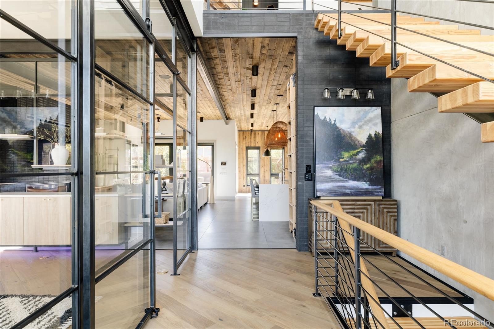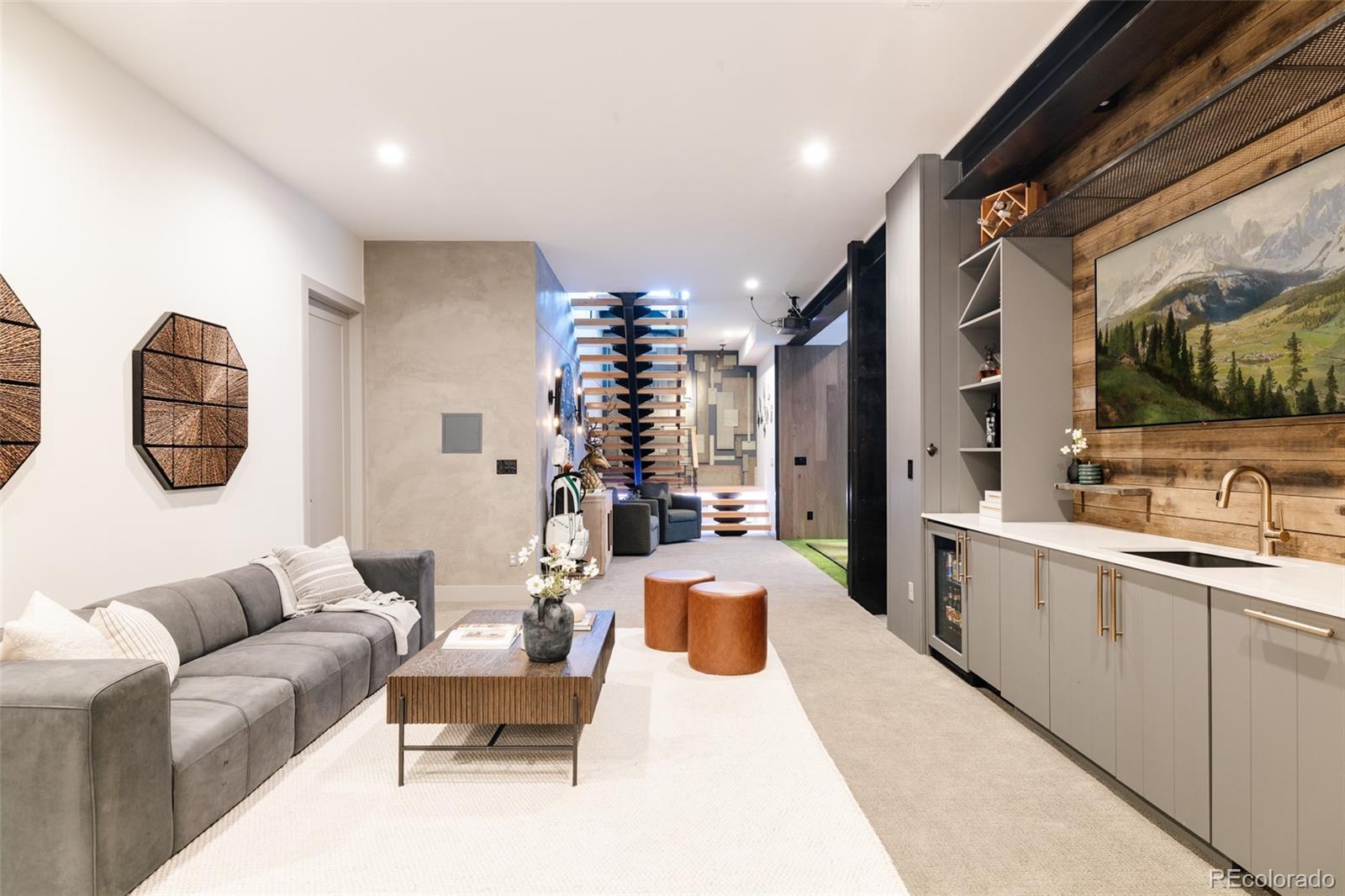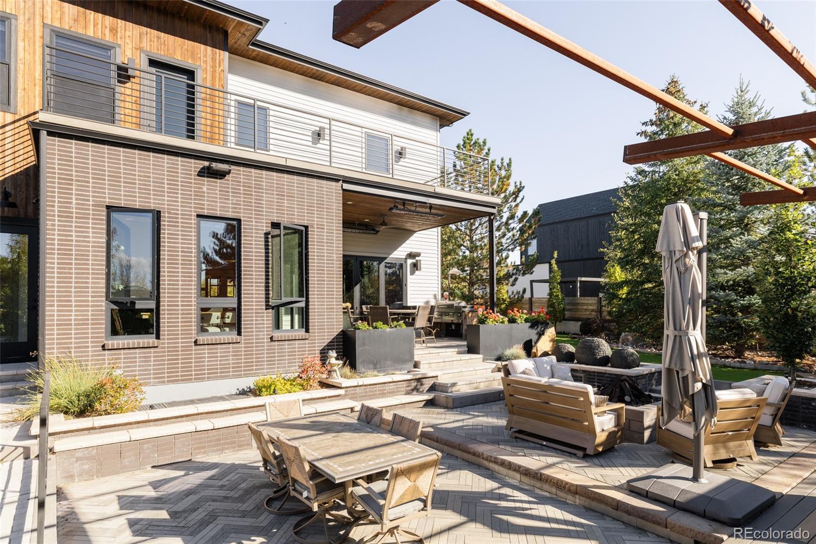 Immaculate in every sense, this full-custom mountain modern masterpiece blends artful design, precision craftsmanship, and effortless livability. Set on a beautifully landscaped lot, the outdoor spaces were created for true Colorado entertaining — a sanctuary of function and beauty. Layered paver patios and decks unfold across the backyard, framed by lush greenery, architectural lighting, and multiple water features that add movement and sound. Up to ten spaded, mature trees were strategically brought in to shape the landscape, creating a private, established setting rarely found in newer construction. Enjoy evenings around the custom Breck Ironworks fire pit, challenge friends on the private putting green, or unwind beneath the stars in the saltwater hot tub. Every outdoor element feels curated — perfectly balanced between luxury and livability. Inside, the home delivers the ultimate open-concept experience, merging steel, glass, wood, and concrete into a cohesive statement of mountain modern design. A striking 11-foot stained wood ceiling warms the space, while steel and glass partition walls add sophistication and transparency. The chef’s kitchen impresses with Wolf and Sub-Zero appliances, built-in Miele coffee system, Sub-Zero wine fridge, and a waterfall island ideal for gatherings. Accordion bifold door systems blur the line between indoor and outdoor living, flooding the home with natural light and energy. Upstairs, three bedrooms and three baths include a breathtaking primary suite—complete with a wet room spa bath, aromatherapy steam shower, and balcony views of glowing mountain sunsets. The lower level is designed purely for enjoyment: a custom golf simulator lounge, theater, guest suite, and designer bath. Fully integrated with Savant home automation, including whole-house audio and indoor/outdoor speakers, this home defines modern Colorado living — bold, elegant, and unforgettable.