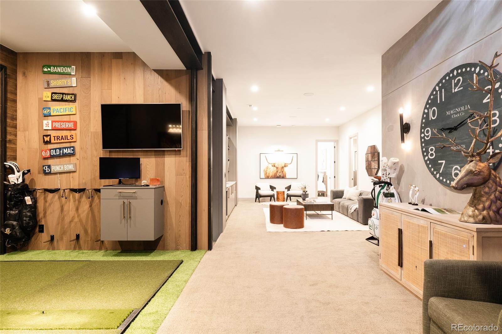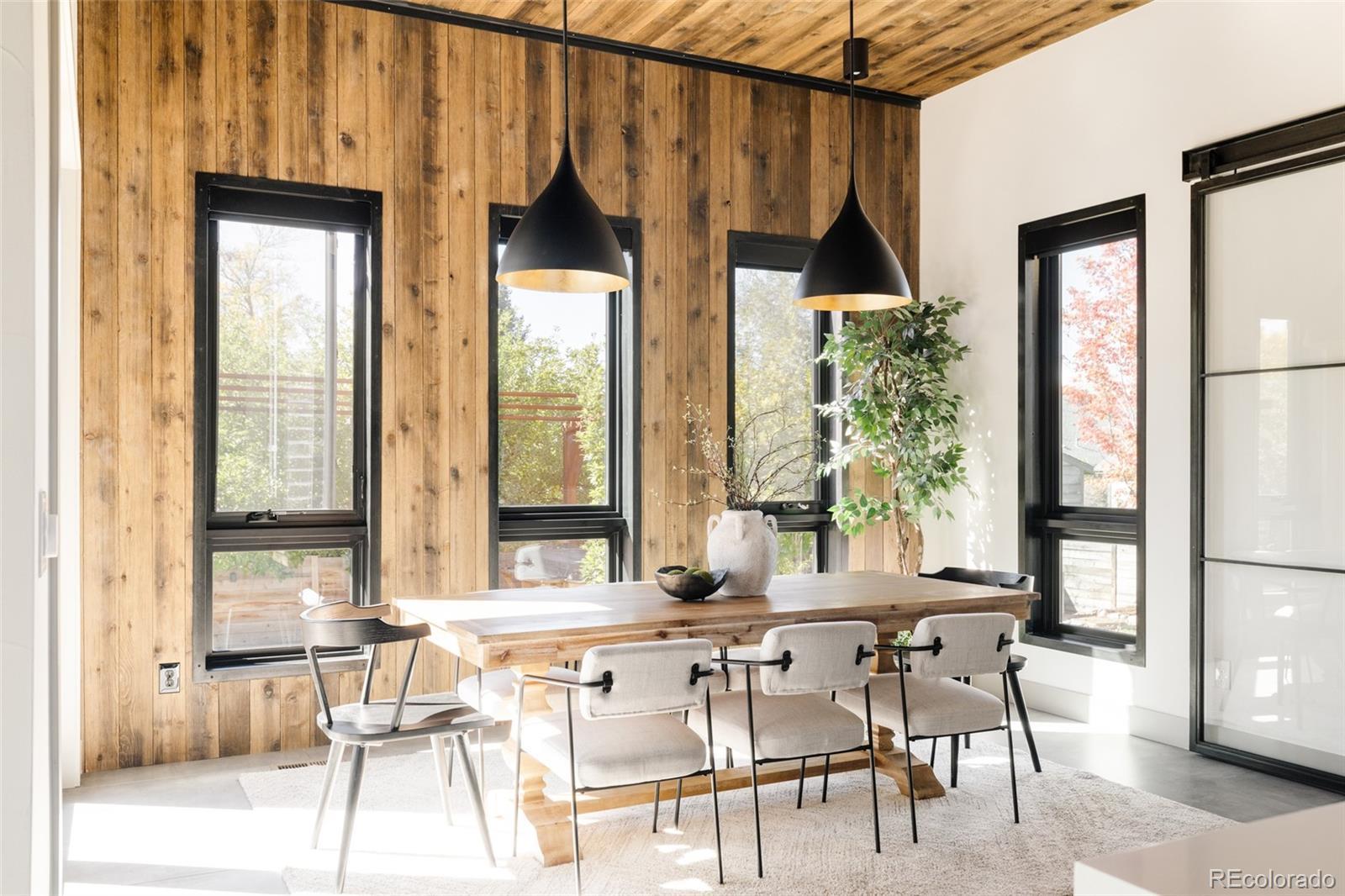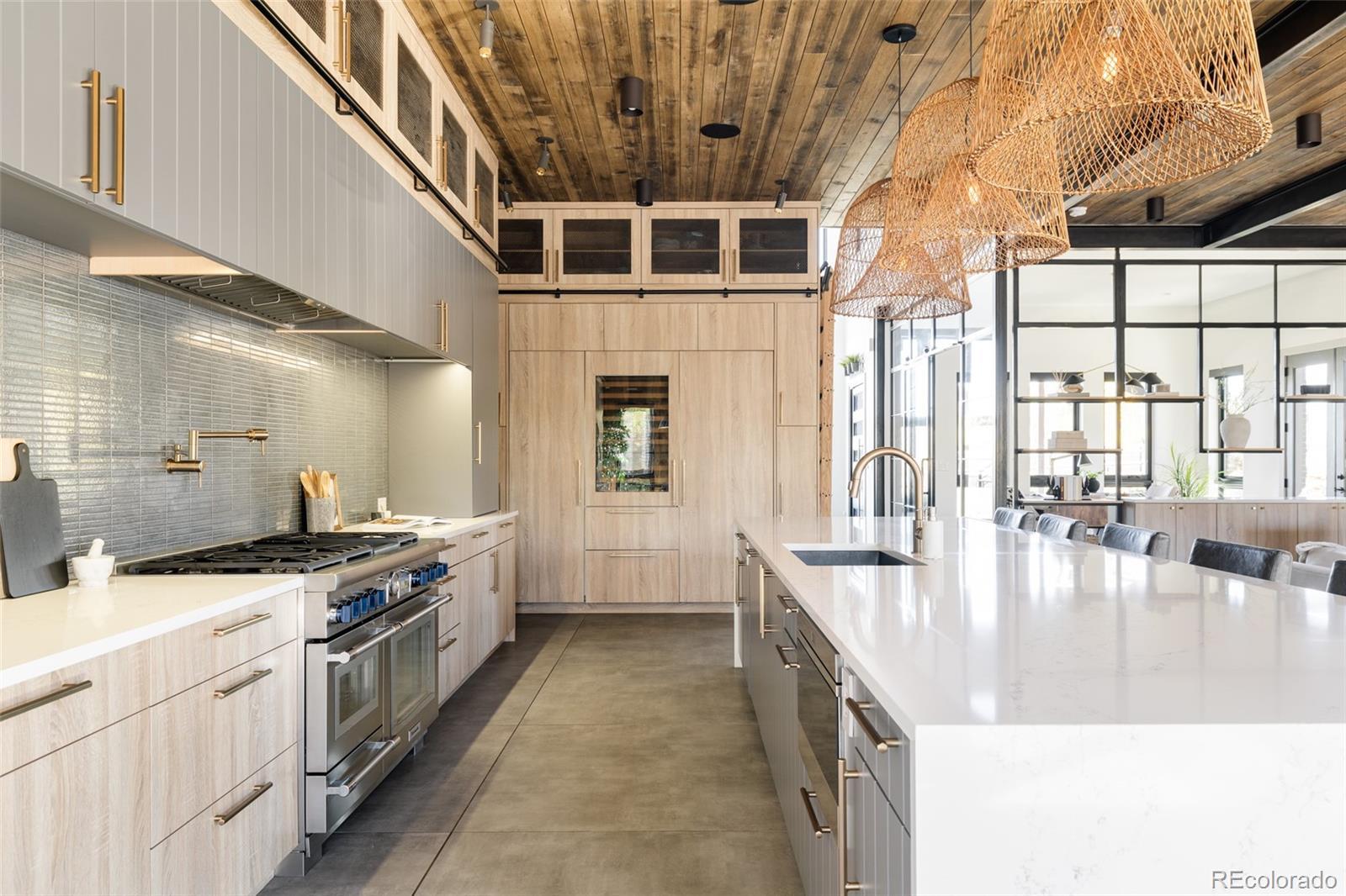 Immaculate in every sense, this full-custom mountain modern masterpiece blends artful design, precision craftsmanship, and effortless livability. Set on a beautifully landscaped lot, the outdoor spaces were created for true Colorado entertaining — a sanctuary of function and beauty. Layered paver patios and decks unfold across the backyard, framed by lush greenery, architectural lighting, and multiple water features that add movement and sound. Up to ten spaded, mature trees were strategically brought in to shape the landscape, creating a private, established setting rarely found in newer construction. Enjoy evenings around the custom Breck Ironworks fire pit, challenge friends on the private putting green, or unwind beneath the stars in the saltwater hot tub. Every outdoor element feels curated — perfectly balanced between luxury and livability. Inside, the home delivers the ultimate open-concept experience, merging steel, glass, wood, and concrete into a cohesive statement of mountain modern design. A striking 11-foot stained wood ceiling warms the space, while steel and glass partition walls add sophistication and transparency. The chef’s kitchen impresses with Wolf and Sub-Zero appliances, built-in Miele coffee system, Sub-Zero wine fridge, and a waterfall island ideal for gatherings. Accordion bifold door systems blur the line between indoor and outdoor living, flooding the home with natural light and energy. Upstairs, three bedrooms and three baths include a breathtaking primary suite—complete with a wet room spa bath, aromatherapy steam shower, and balcony views of glowing mountain sunsets. The lower level is designed purely for enjoyment: a custom golf simulator lounge, theater, guest suite, and designer bath. Fully integrated with Savant home automation, including whole-house audio and indoor/outdoor speakers, this home defines modern Colorado living — bold, elegant, and unforgettable.