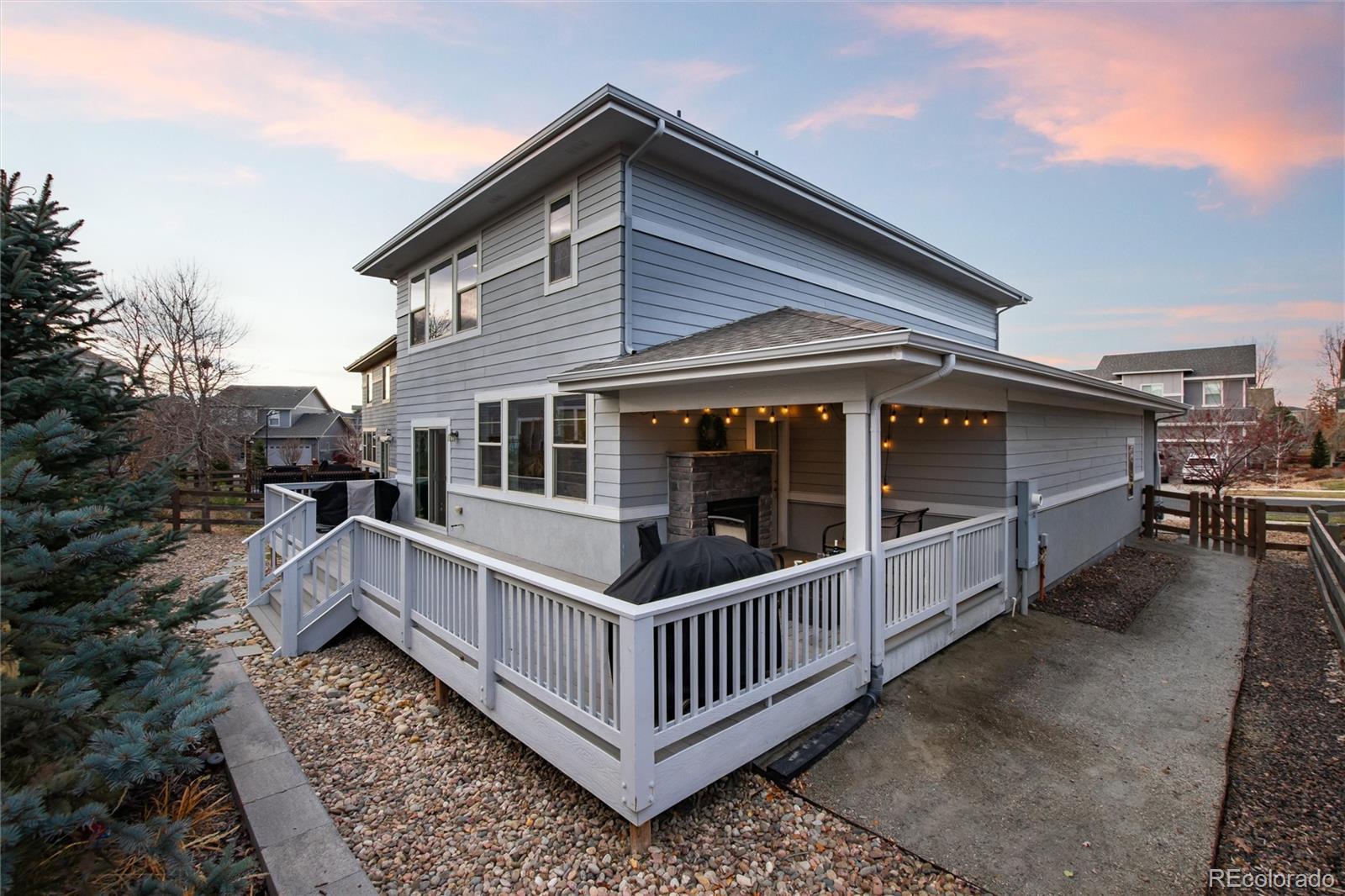 Experience exceptional value and space in this beautiful 5 bedroom, 4 bath home in Southshore, SE Aurora's most desirable residential community, which offers unparalleled private amenities to it's residents. A private home office with dual French doors offers the perfect work-from-home setup right off the entrance. The main floor also features a large living room with surround sound and indoor/outdoor dual-sided gas fireplace that leads guests to the outdoor covered patio that also offers surround sound for those outdoor parties! Enjoy plenty of space to entertain as the deck wraps around the back of the home with another access point in the kitchen! Back inside, the large kitchen showcases quartz countertops, a large center island and stainless steel appliances including a gas range. Upstairs offers four bedrooms and two baths, including the Primary Suite, which is a true retreat, featuring a luxurious ensuite bath and a walk-in closet with custom built-in shelving. Three additional bedrooms upstairs share a secondary bath with dual sinks and tub/shower combo. Downstairs, the finished basement adds even more versatility, perfect for a media room, gym, or extra living space-with built-in cabinetry and bar! With additional flexibility the 5th bedroom, entered by stunning dual sliding barn doors could be used as a second home office, or is the perfect solution for a private guest retreat next to a modern bathroom with large walk-in shower. Additional highlights include a finished, three-car tandem garage with 220V outlet. Southshore offers residents countless amenities including TWO clubhouses-each with their own private fitness center and pools, dog park, a seasonal pond w/paddleboats, free resident access to the Aurora Reservoir as well as miles of trails with countless parks. Situated in a community within walking distance to elementary, middle and high schools in the Cherry Creek School District, this home offers both elegance and practicality for under $700K.