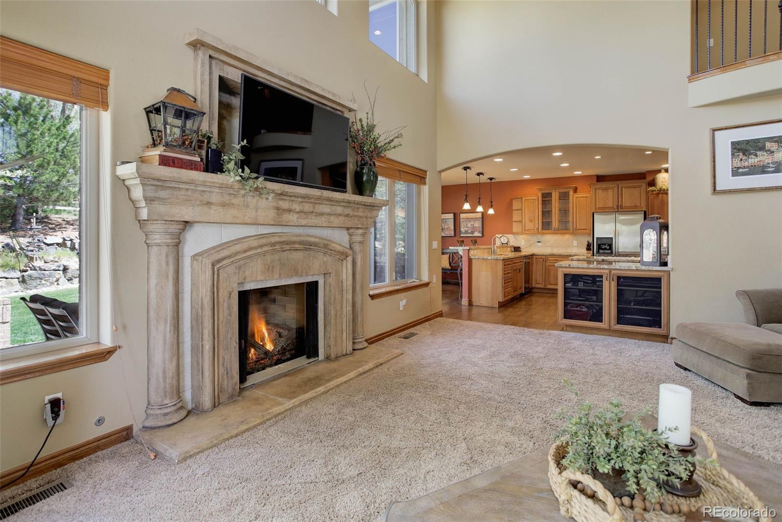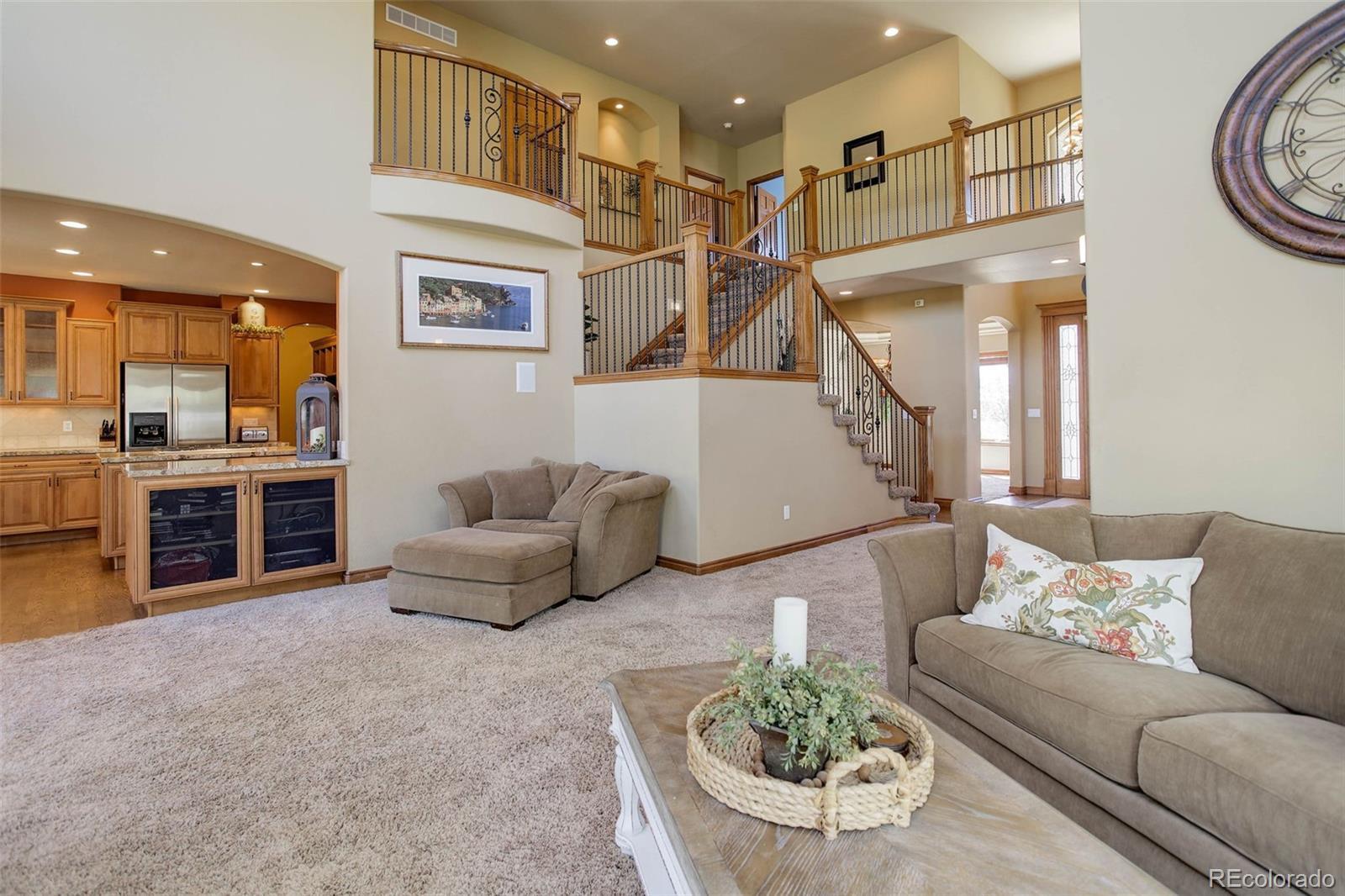 Welcome to an exceptional custom home in the prestigious Alkire Estates Custom homes, where contemporary elegance & a prime location come together seamlessly. Situated on a beautifully landscaped lot within walking distance to Ralston Valley High School, this rare, one-of-a-kind residence offers both sophistication & convenience. Enter through the custom front door into a cozy foyer & on your left is the office with custom built-in cabinetry, paired with a private 3/4 bath & bench seating, making it easily adaptable as a 6th bedroom. An intimate formal dining room sits adjacent to the entryway adorned by a small butler’s pantry, perfect for those elegant gatherings. Stunning wrought iron staircase creates a dramatic focal point as you move toward the heart of the home. The spacious living room with 20ft ceilings, electric blinds, & an ornate fireplace, is ideal for entertaining. The north walls of windows bring in abundant natural light and connect seamlessly to the open-concept family room, breakfast nook, & kitchen. Kitchen features a custom granite eat-in island, stainless steel appliances, luxurious cabinetry, hidden walk-in pantry & gas cooktop. Step out to the back patio overlooking the backyard & play area. Mudroom includes custom cabinetry for coats & shoes, storage closet, & spacious laundry area with sink, folding counters. Ascend the grand staircase to the primary suite, enhanced by crown molding, decorative ceiling & generous walk-in closet. Enjoy a 5 piece bath & elegant soaking tub, expansive glass-enclosed shower & natural light. Upper level includes 3 more large bedrooms, each with own unique private en-suite bathroom, 3 full, 1-3/4. Finished basement features a custom fireplace, wet bar, refrigerator, microwave, dishwasher, wine fridge & abundant cabinetry, full bath, large flex space or 6th bedroom.