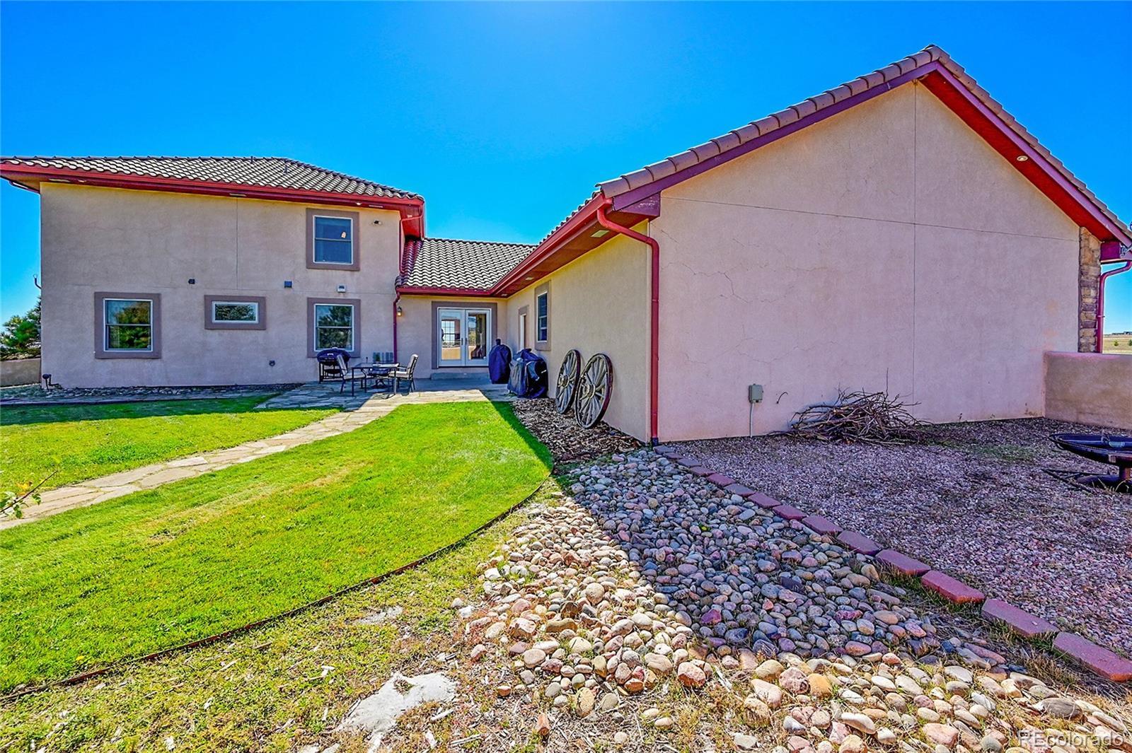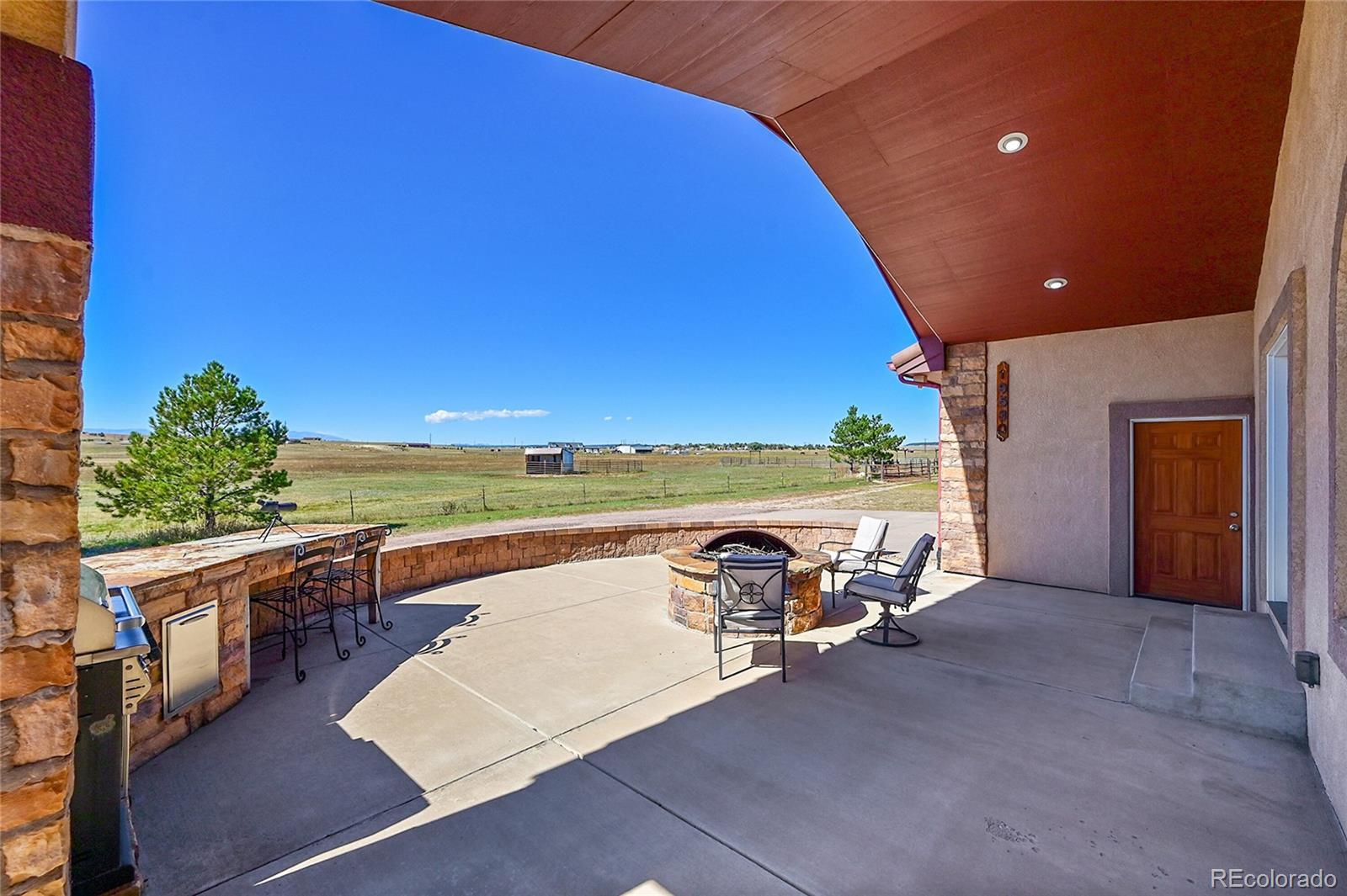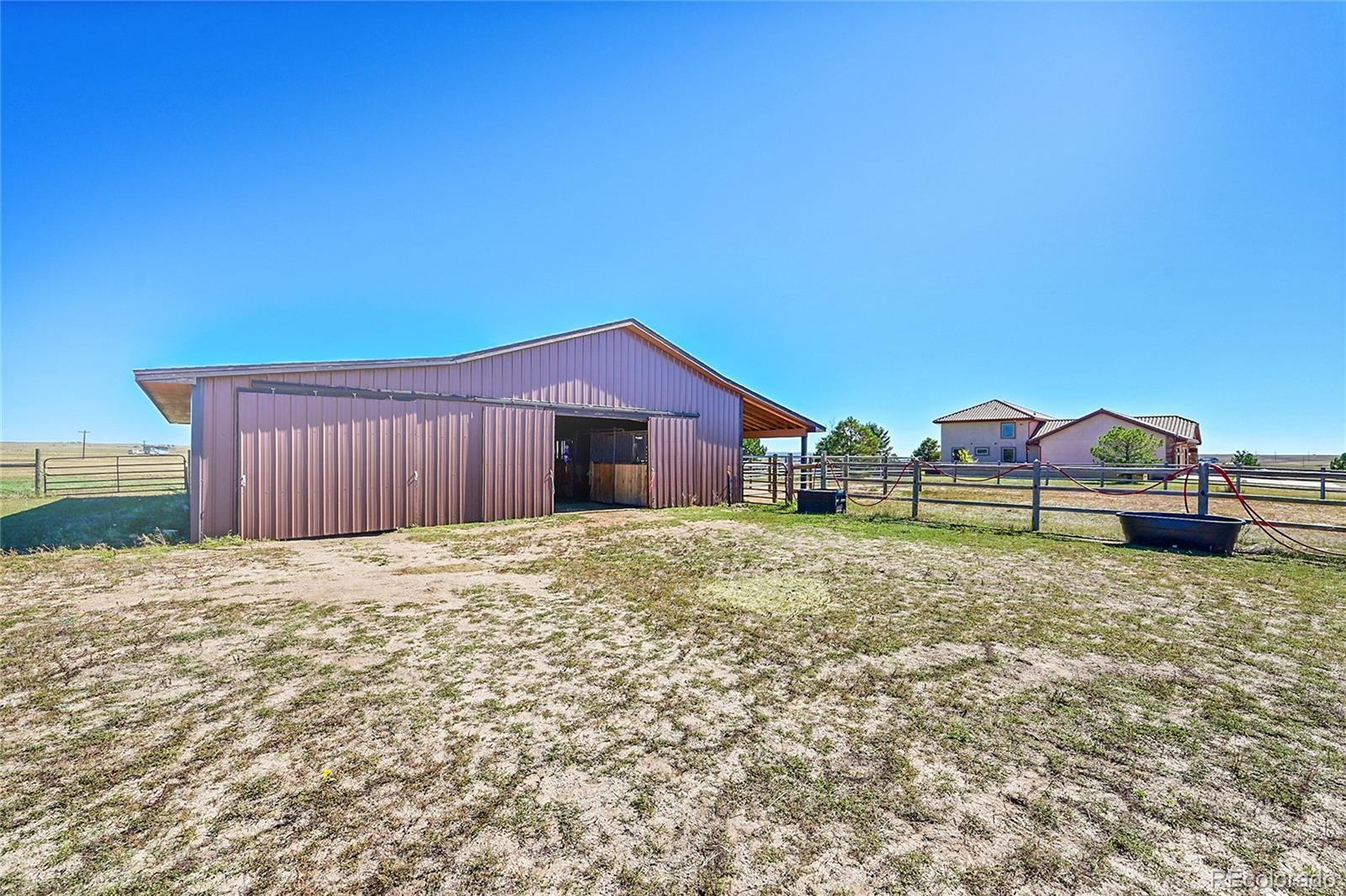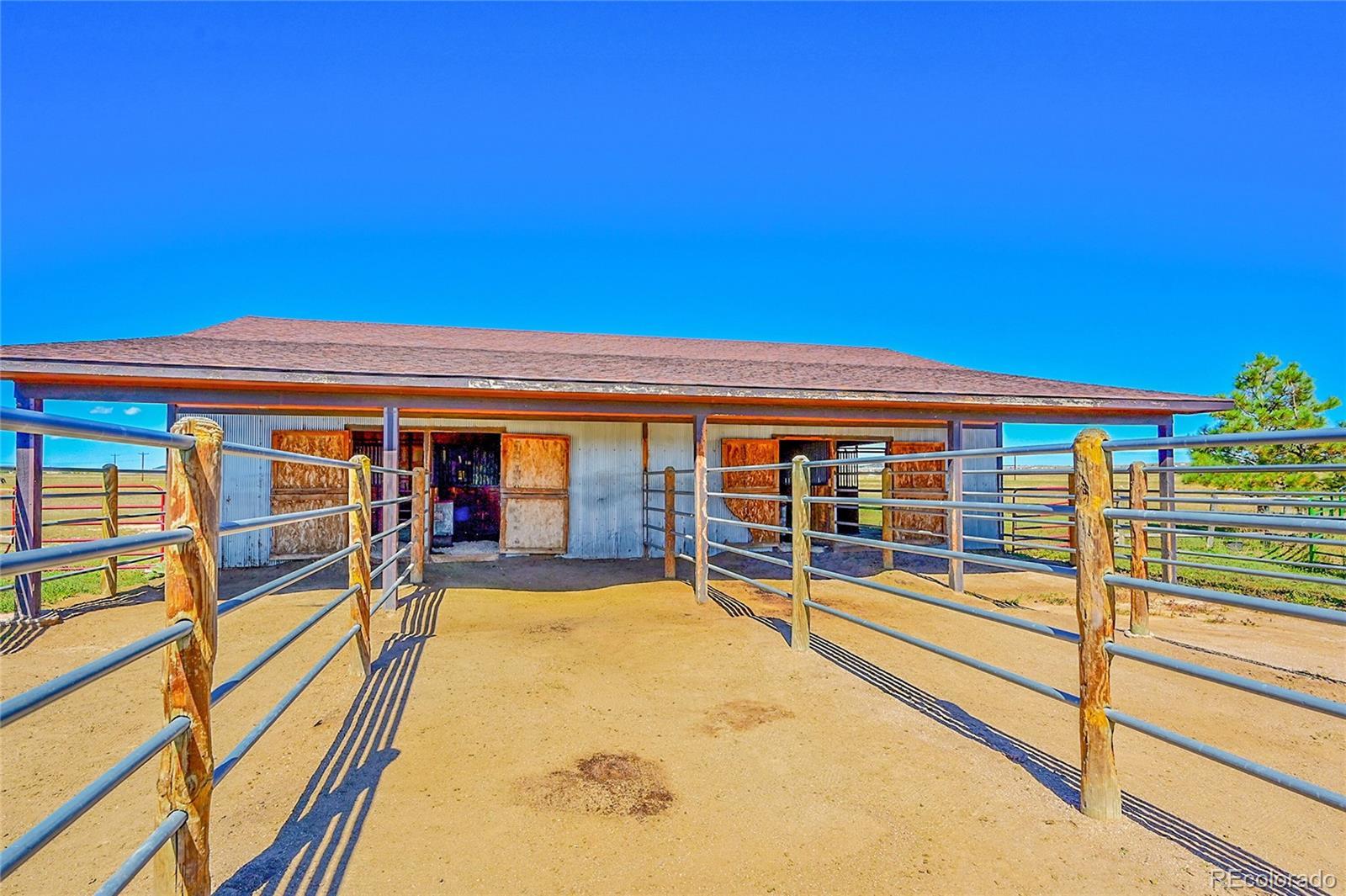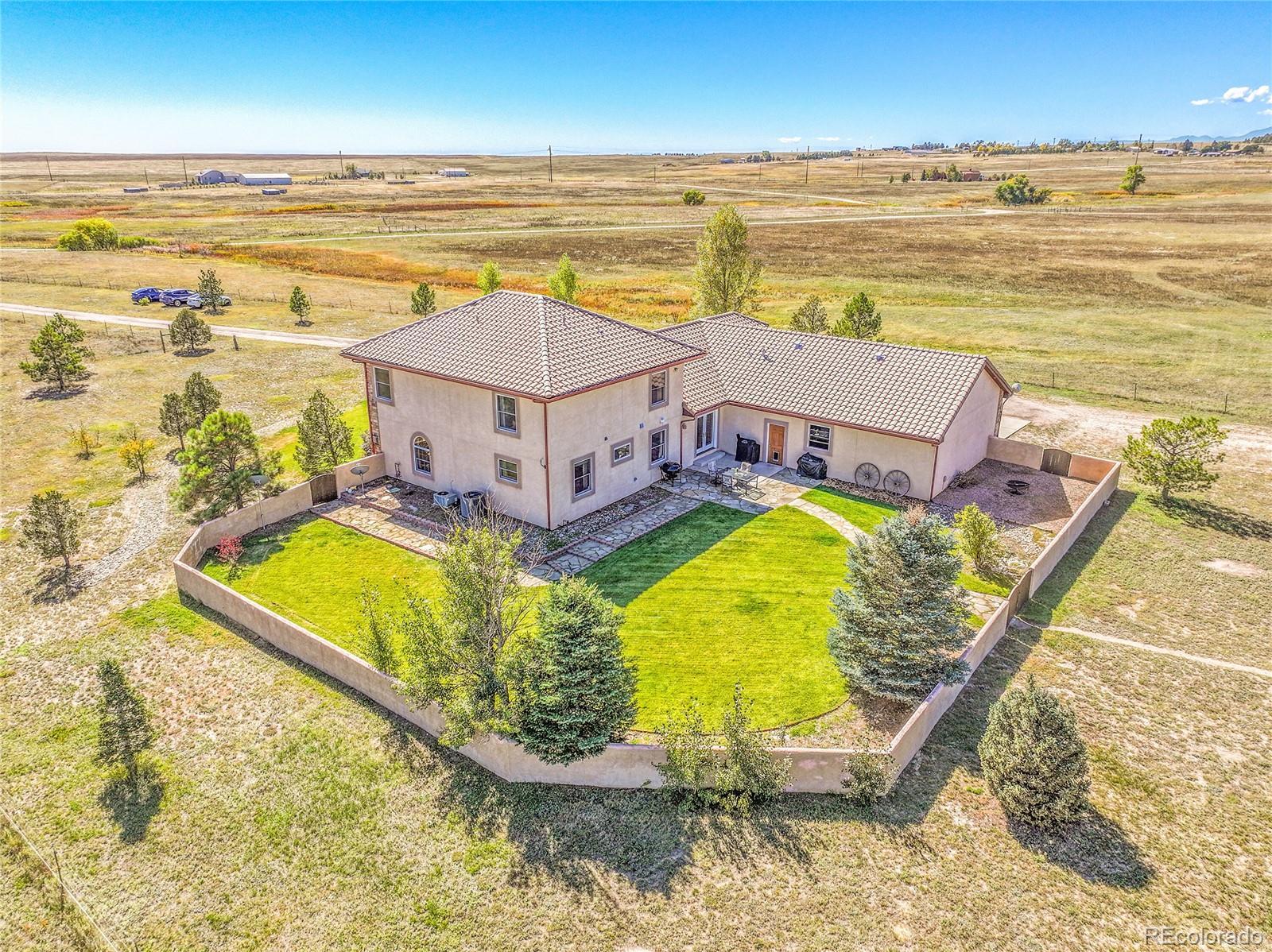 Discover the perfect blend of upscale living and horse-ready amenities in this custom Tuscan-style estate, set on 35 tranquil acres with unobstructed views of Pikes Peak and the Front Range. Topped with a classic tile roof and finished in rich stucco and stone, this home offers timeless elegance, thoughtfully designed for both comfort and country living. Horse lovers will appreciate the south-facing 4-stall barn with automatic waterers and dedicated storage. The land is thoughtfully cross fenced into two 17-acre pastures for rotational grazing. Two south-facing loafing sheds (convertible to four) provide ideal shelter for horses or livestock. A 100x100 outdoor arena with separating pen is ready for training or riding. Inside, the main level features a chef’s kitchen with stainless appliances, a large island, breakfast nook, and formal dining area. The sunlit living room centers around a cozy fireplace. A main-floor suite with attached bath adds flexibility. Upstairs, the primary suite offers a 5-piece luxury bath with jetted tub and dual-head shower, plus two more bedrooms and a full bath. Enjoy outdoor living with a full kitchen, spacious patio, and fire pit, all with stunning mountain views. The fenced backyard features mature trees and lush lawn—perfect for relaxing or entertaining. Other features included: An oversized 3-car finished garage for large vehicles, Central air for year-round comfort, newer water heater and furnace, new carpet, Jen- Air Kitchen Appliances, and so much more. Whether you’re a serious horse enthusiast, a hobby rancher, or simply dream of wide-open space and fresh air, this exceptional property offers a rare opportunity to live the equestrian lifestyle without sacrificing luxury or convenience—all just minutes from modern amenities.