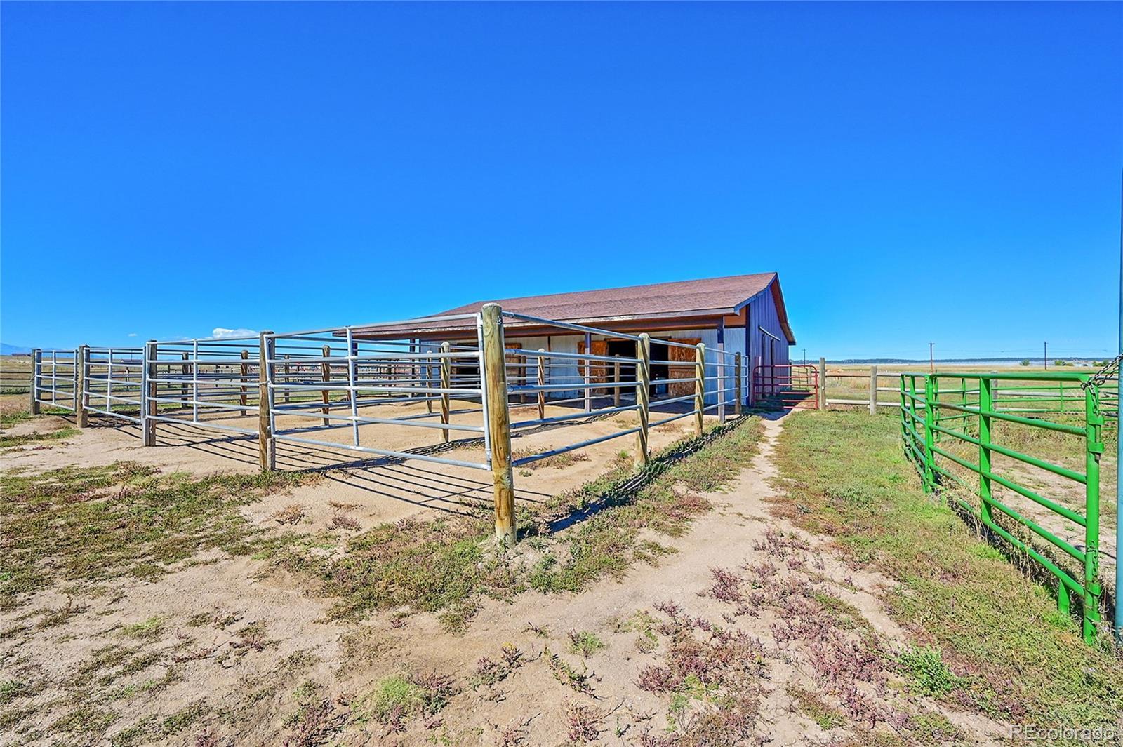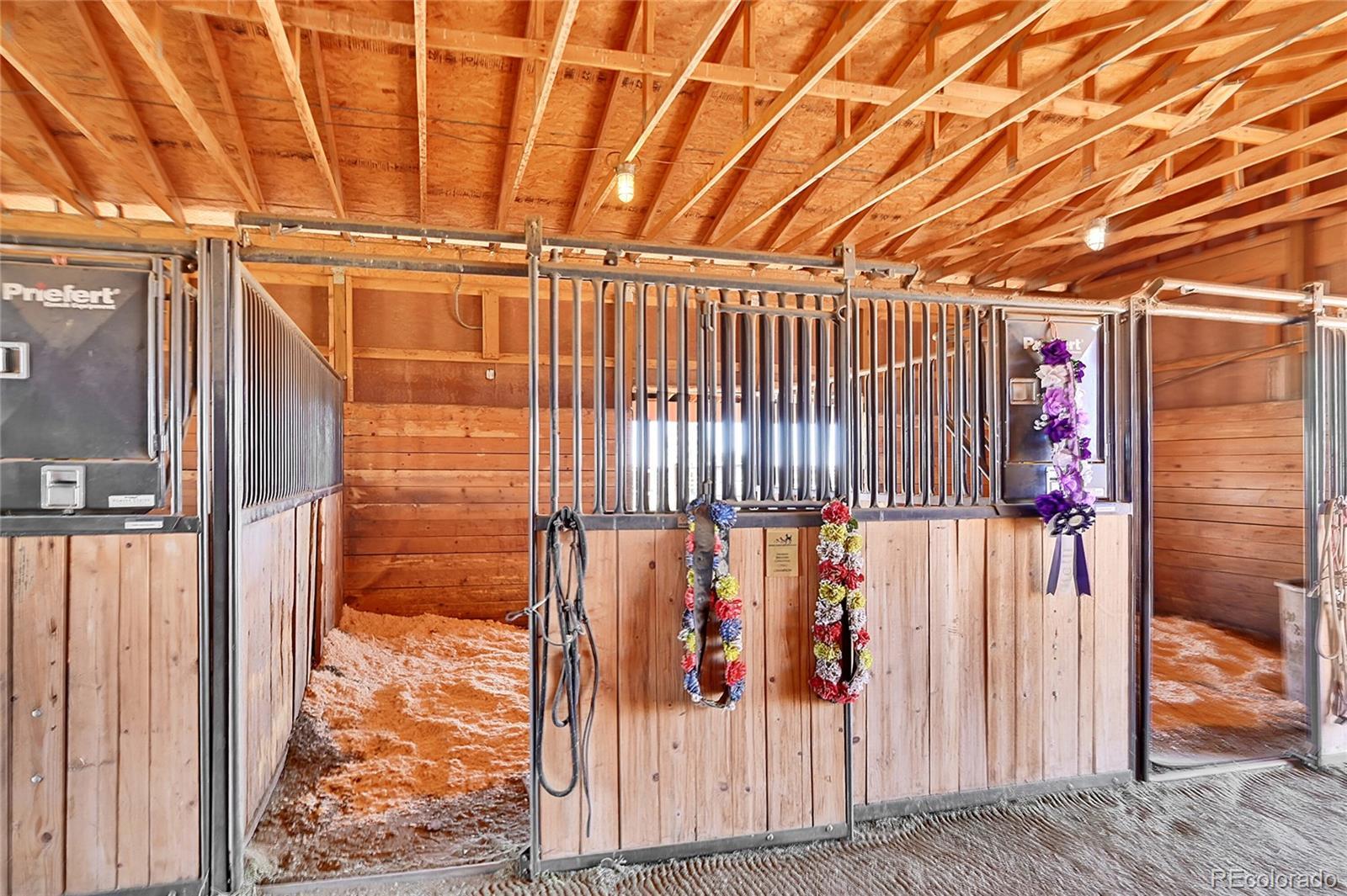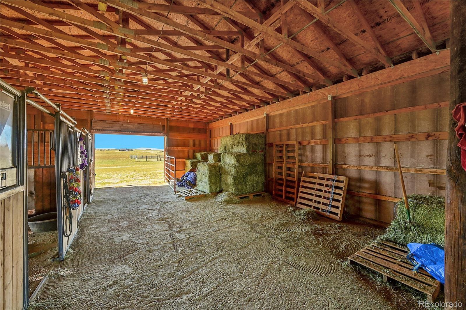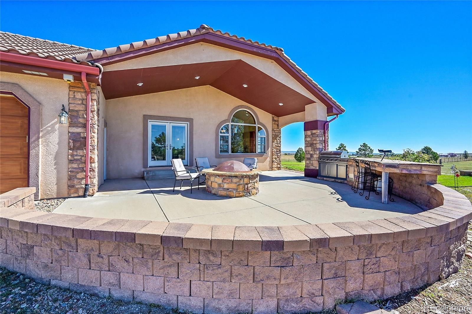Discover the perfect blend of upscale living and horse-ready amenities in this custom Tuscan-style estate, set on 35 tranquil acres with unobstructed views of Pikes Peak and the Front Range. Topped with a classic tile roof and finished in rich stucco and stone, this home offers timeless elegance, thoughtfully designed for both comfort and country living. Horse lovers will appreciate the south-facing 4-stall barn with automatic waterers and dedicated storage. The land is thoughtfully cross fenced into two 17-acre pastures for rotational grazing. Two south-facing loafing sheds (convertible to four) provide ideal shelter for horses or livestock. A 100x100 outdoor arena with separating pen is ready for training or riding. Inside, the main level features a chef’s kitchen with stainless appliances, a large island, breakfast nook, and formal dining area. The sunlit living room centers around a cozy fireplace. A main-floor suite with attached bath adds flexibility. Upstairs, the primary suite offers a 5-piece luxury bath with jetted tub and dual-head shower, plus two more bedrooms and a full bath. Enjoy outdoor living with a full kitchen, spacious patio, and fire pit, all with stunning mountain views. The fenced backyard features mature trees and lush lawn—perfect for relaxing or entertaining. Other features included: An oversized 3-car finished garage for large vehicles, Central air for year-round comfort, newer water heater and furnace, new carpet, Jen- Air Kitchen Appliances, and so much more. Whether you’re a serious horse enthusiast, a hobby rancher, or simply dream of wide-open space and fresh air, this exceptional property offers a rare opportunity to live the equestrian lifestyle without sacrificing luxury or convenience—all just minutes from modern amenities.