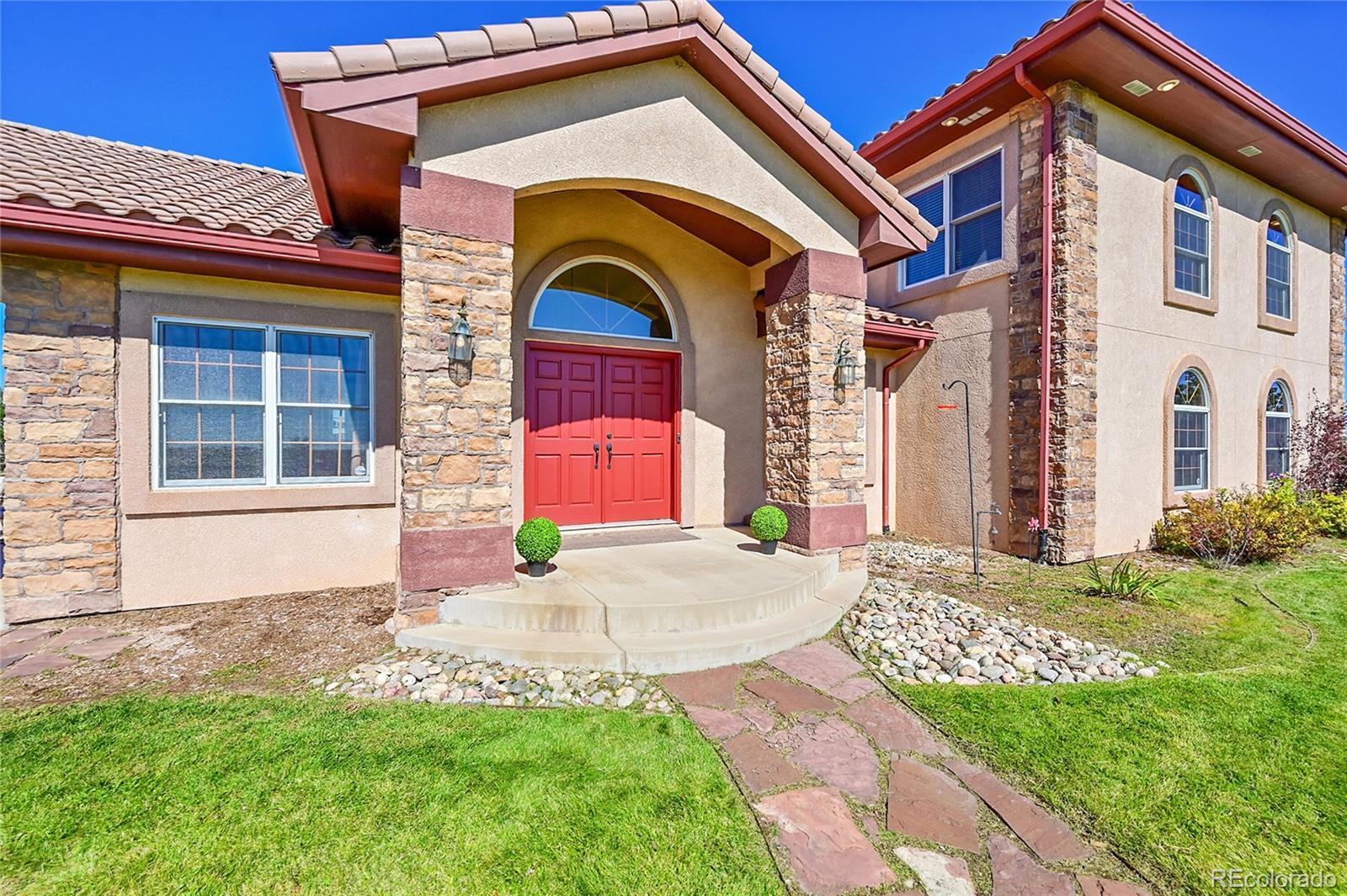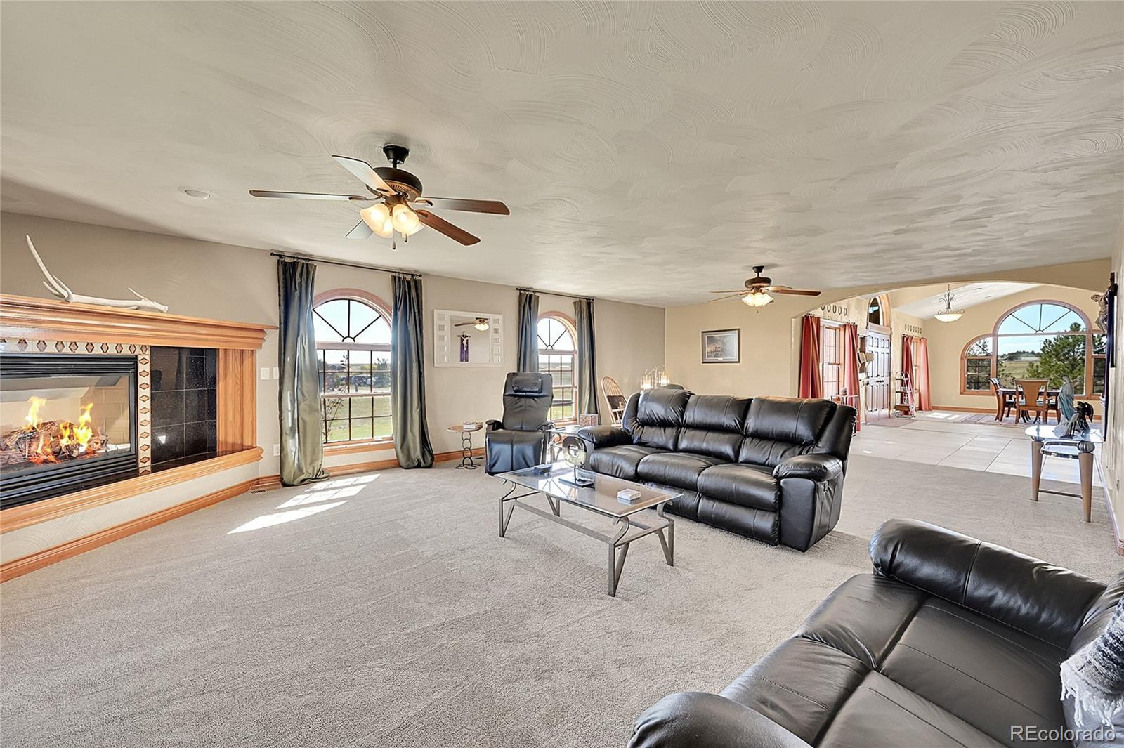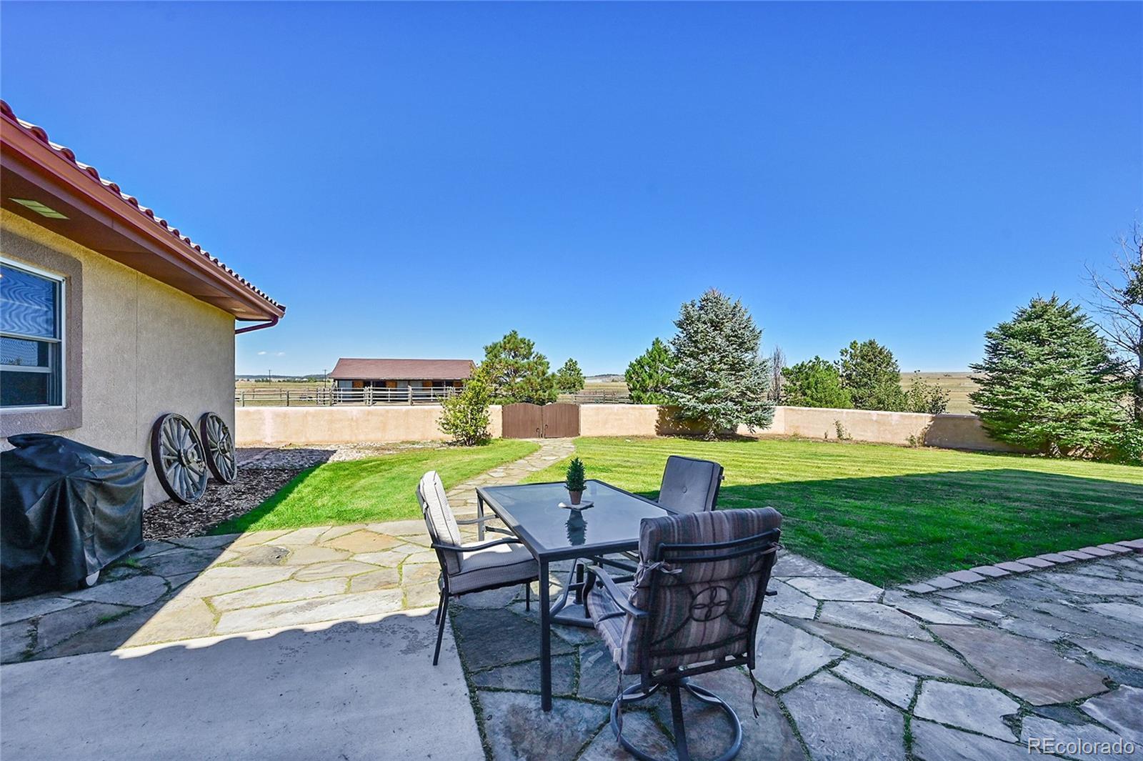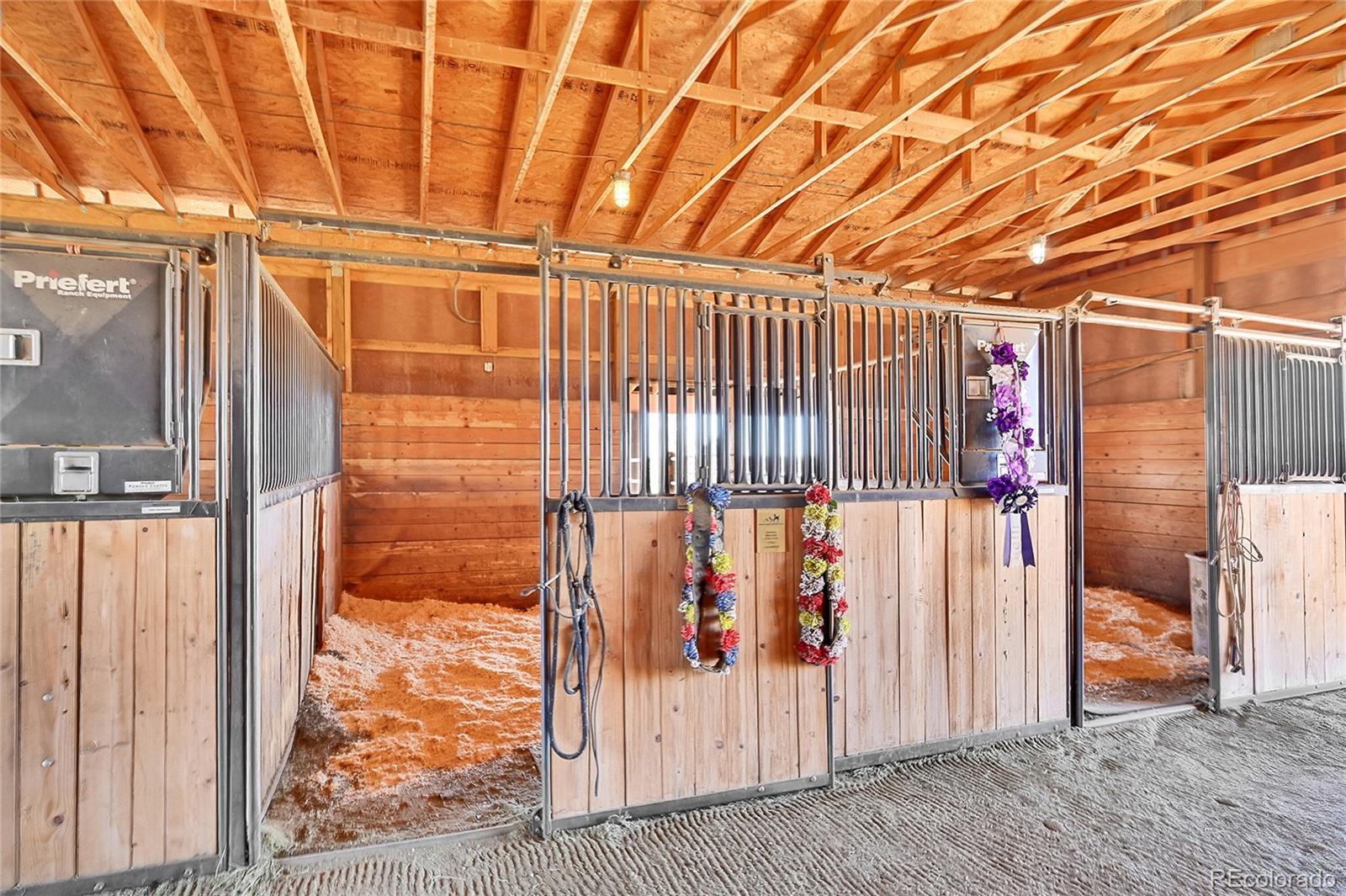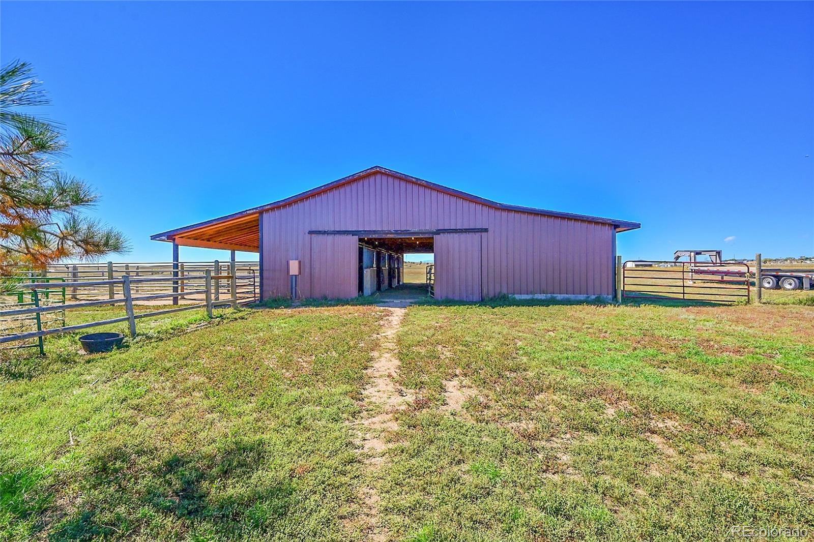 Discover the perfect blend of upscale living and horse-ready amenities in this custom Tuscan-style estate, set on 35 tranquil acres with unobstructed views of Pikes Peak and the Front Range. Topped with a classic tile roof and finished in rich stucco and stone, this home offers timeless elegance, thoughtfully designed for both comfort and country living. Horse lovers will appreciate the south-facing 4-stall barn with automatic waterers and dedicated storage. The land is thoughtfully cross fenced into two 17-acre pastures for rotational grazing. Two south-facing loafing sheds (convertible to four) provide ideal shelter for horses or livestock. A 100x100 outdoor arena with separating pen is ready for training or riding. Inside, the main level features a chef’s kitchen with stainless appliances, a large island, breakfast nook, and formal dining area. The sunlit living room centers around a cozy fireplace. A main-floor suite with attached bath adds flexibility. Upstairs, the primary suite offers a 5-piece luxury bath with jetted tub and dual-head shower, plus two more bedrooms and a full bath. Enjoy outdoor living with a full kitchen, spacious patio, and fire pit, all with stunning mountain views. The fenced backyard features mature trees and lush lawn—perfect for relaxing or entertaining. Other features included: An oversized 3-car finished garage for large vehicles, Central air for year-round comfort, newer water heater and furnace, new carpet, Jen- Air Kitchen Appliances, and so much more. Whether you’re a serious horse enthusiast, a hobby rancher, or simply dream of wide-open space and fresh air, this exceptional property offers a rare opportunity to live the equestrian lifestyle without sacrificing luxury or convenience—all just minutes from modern amenities.