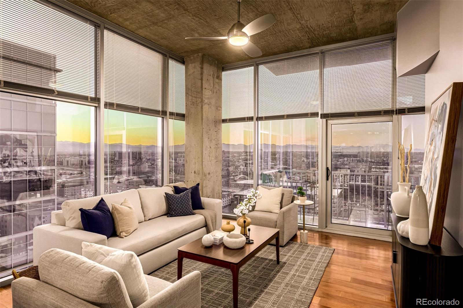 Looking for mountain views? Enjoy the sunset from the 21st floor, corner residence with floor to ceiling windows. This outstanding 2-bedroom condo is a rare find and will leave you breathless! Sheer beauty and meticulous attention to detail shine throughout, showcasing high-end finishes, a blend of wood & tile flooring, and new plush carpets in the bedrooms. Entertain guests in the impressive open floor plan where comfort meets luxury. The gourmet kitchen is a cook's delight with recessed & pendant lighting, subway tile backsplash, abundant cabinetry, sleek granite counters, a two-tier center island with a breakfast bar, and gleaming stainless steel appliances. The romantic primary bedroom retreat won't disappoint, complete with a walk-in closet and an ensuite that adds convenience to your everyday routine. As a bonus, a washer and dryer are included! The cozy balcony captivates mountain silhouettes and sunset vistas. Great location, close to restaurants, shopping spots, and entertainment. The front desk is available 24/7 with concierge and security, they also take care of dry cleaning pick up delivery, door dash, groceries, Amazon...they are awesome! Out the front door you have access into LoDo, LoHi, I25 and very close to I70. The Glass House is Riverfront Park’s only full-amenity building. Highlights include an outdoor lap pool, a club room, two exclusive athletic club memberships, and a front desk. The athletic club is included in the HOA and offers spin, yoga, pilates, and fitness classes for a small fee. The clubhouse level features a large fire pit, barbecue grills, and amazing downtown views (including fireworks from the Rockies games). The condo comes with two parking space and one storage unit. EV Charging can be installed at the parking space for a fee. Minimum rental is 30 days. Riverfront Park Private transfer fee (half of one percent of the sales price) to be paid by buyer.