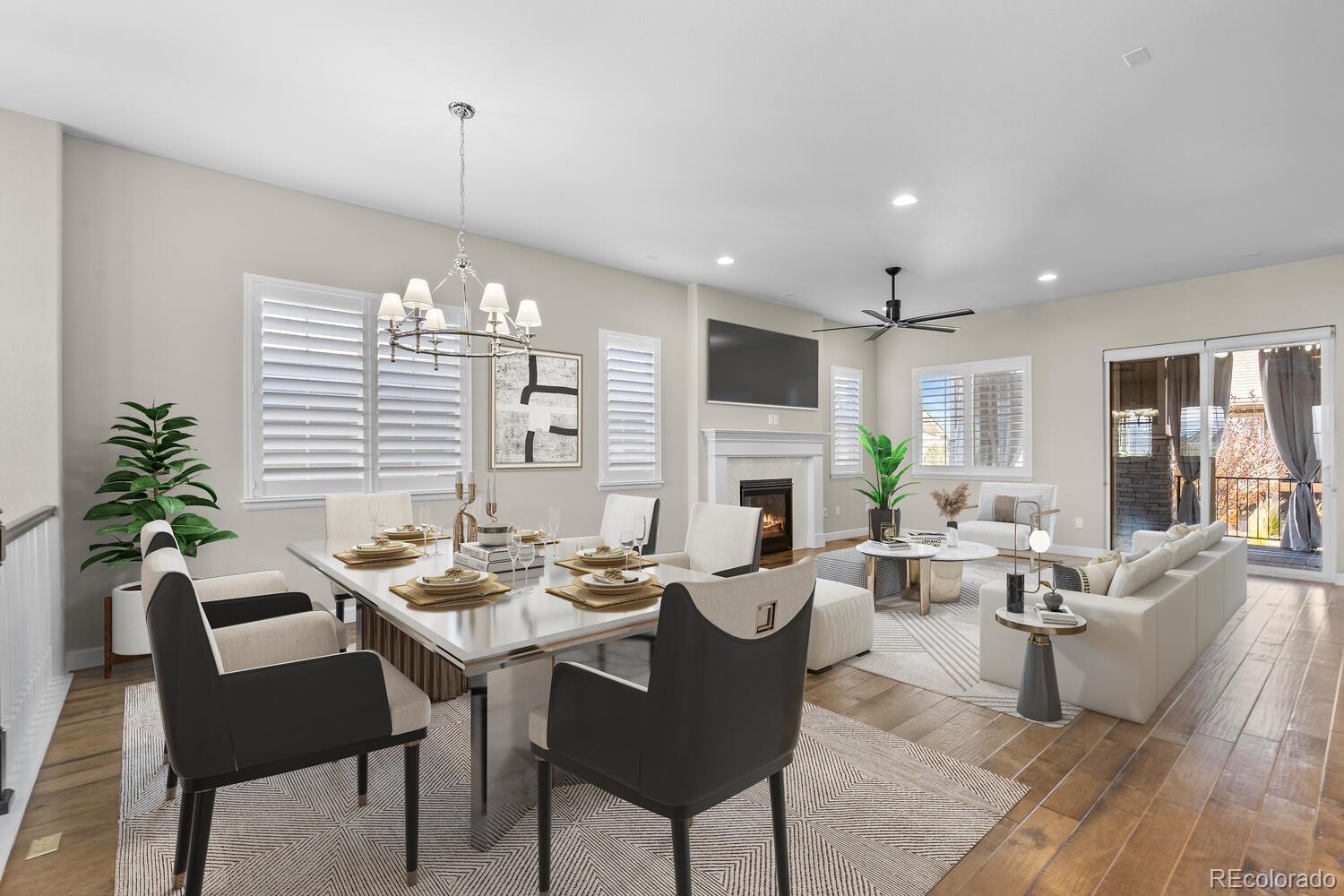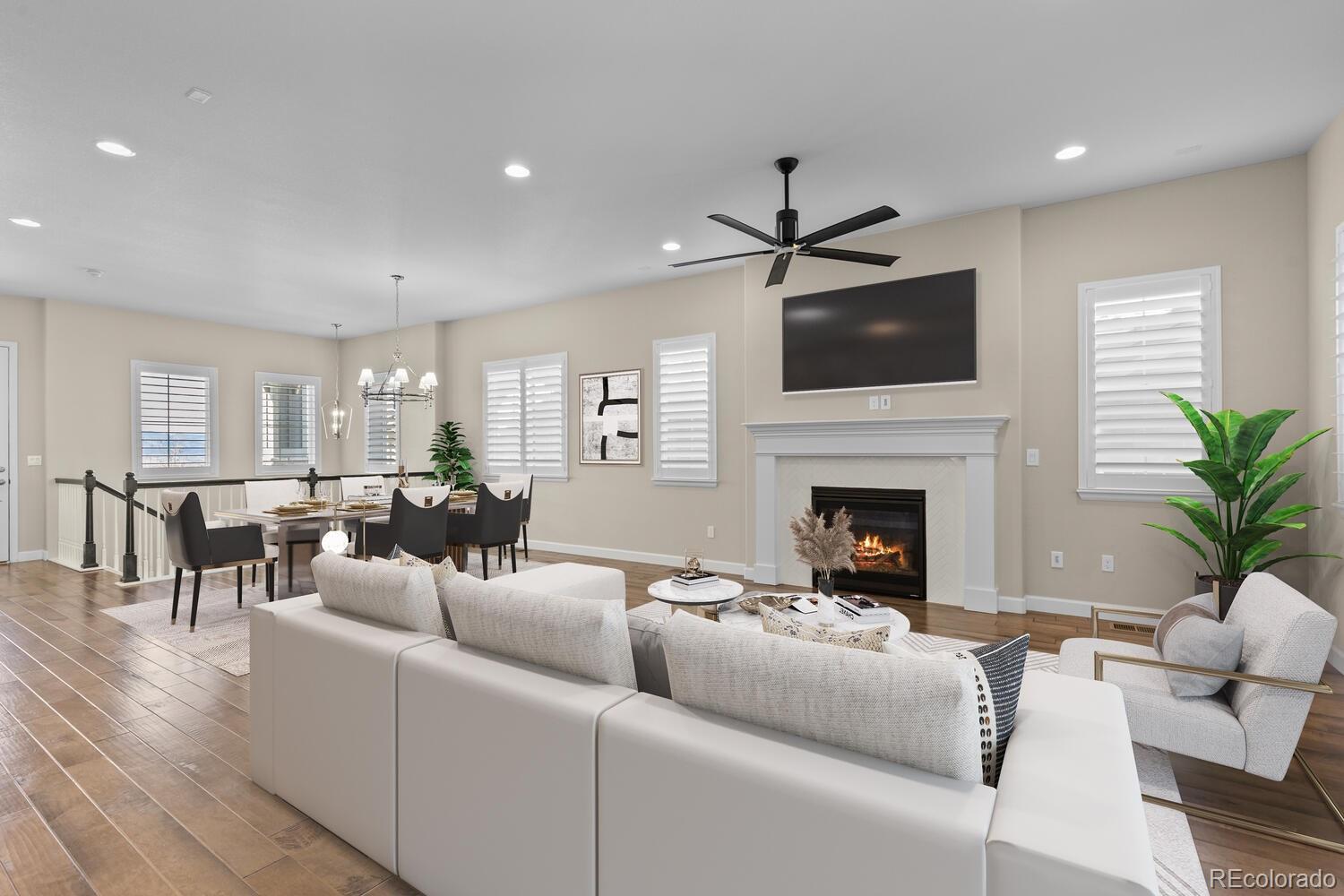 Discover all that the coveted Backcountry community has to offer in this beautifully designed home—Fronting to a pocket park with stunning MOUNTAIN VIEWS! Step inside and fall in love with the hand-scraped hardwood floors, which flow into an open dining area illuminated by a striking modern chandelier, with plantation shutters adorning the windows throughout the main level. The airy layout and impressive 10-foot ceilings create a seamless transition into the welcoming Great Room, where a sleek gas fireplace with a herringbone-tiled surround adds warmth and style. Through the sliding glass doors, enjoy a peaceful covered deck perfect for outdoor relaxation, or step into the gourmet kitchen, where design and functionality meet. Lighted cabinetry with crown molding extending to the ceiling, stainless steel appliances—including a 36-inch gas cooktop and double ovens—and rich black granite countertops make this kitchen a true showpiece for both chefs and entertainers. The main-level primary suite offers a serene retreat with a spacious double-sink vanity and a glass-enclosed shower with built-in bench seating. A versatile office or guest bedroom, along with a powder bath and convenient laundry room, complete this level. Downstairs, the expansive finished basement opens endless possibilities for recreation, entertainment, or additional workspace. Two generous bedrooms share a beautifully appointed ¾ bath with a large vanity, providing comfort and flexibility for family or guests. Outside, take advantage of the Backcountry lifestyle—just a short stroll or drive to the Sundial House featuring Fitness, resort style pools, workout happy Hour at the Sundial House lounge, trails, parks, ponds and events for all. With landscape maintenance and snow removal included, this home offers true lock-and-leave convenience.