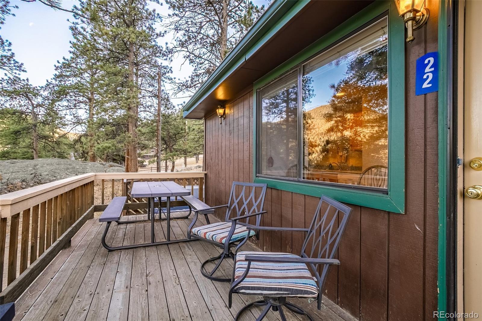 Charming two-bedroom, two-bath cabin in the woods bordering the Rocky Mountain National Park! Main-level living, with a private hot tub. Available for immediate occupancy. All furnishings are included in this beautifully adorned, adorable cabin. A cozy wood-burning fireplace for you and your guests to cuddle up to while enjoying the wildlife around you. You will love this location, only a couple of miles from the YMCA of the Rockies, and you can walk directly into Rocky Mountain National Park on marked trails, and it is less than 2 miles from the Beaver Meadows entrance to RMNP. Plenty of hiking and rock climbing in close proximity. This property has an abundance of wildlife wandering through for you and your guests to enjoy. Buyer or buyer's agent to confirm house and room measurements. For STR licenses, buyers should check with Larimer County before considering short-term rentals. The property is not located inside the City of Estes Park, so you will only need to apply through Larimer County. Danette Barrett is a Colorado-licensed real estate broker and also a principal of Seller.