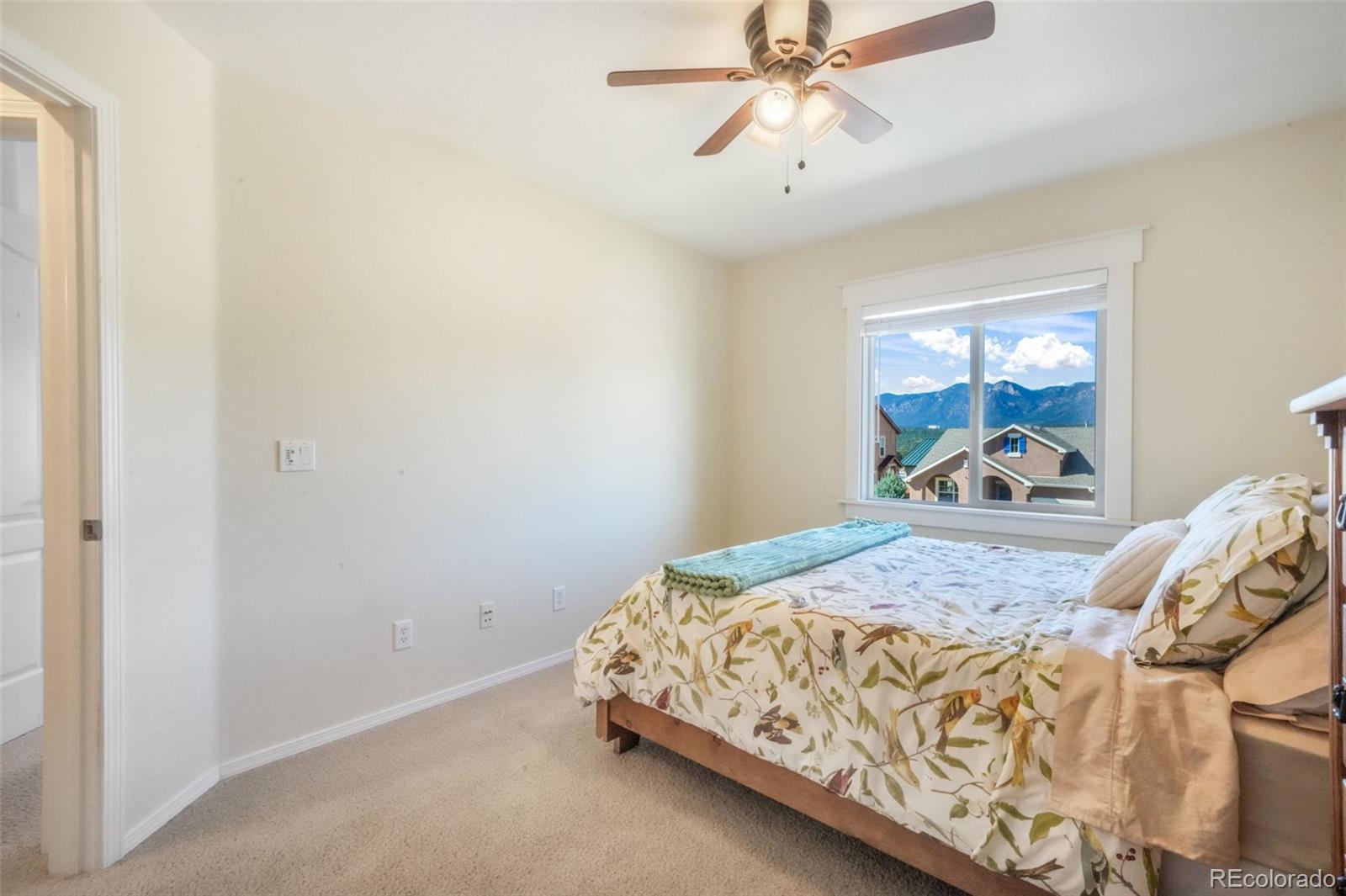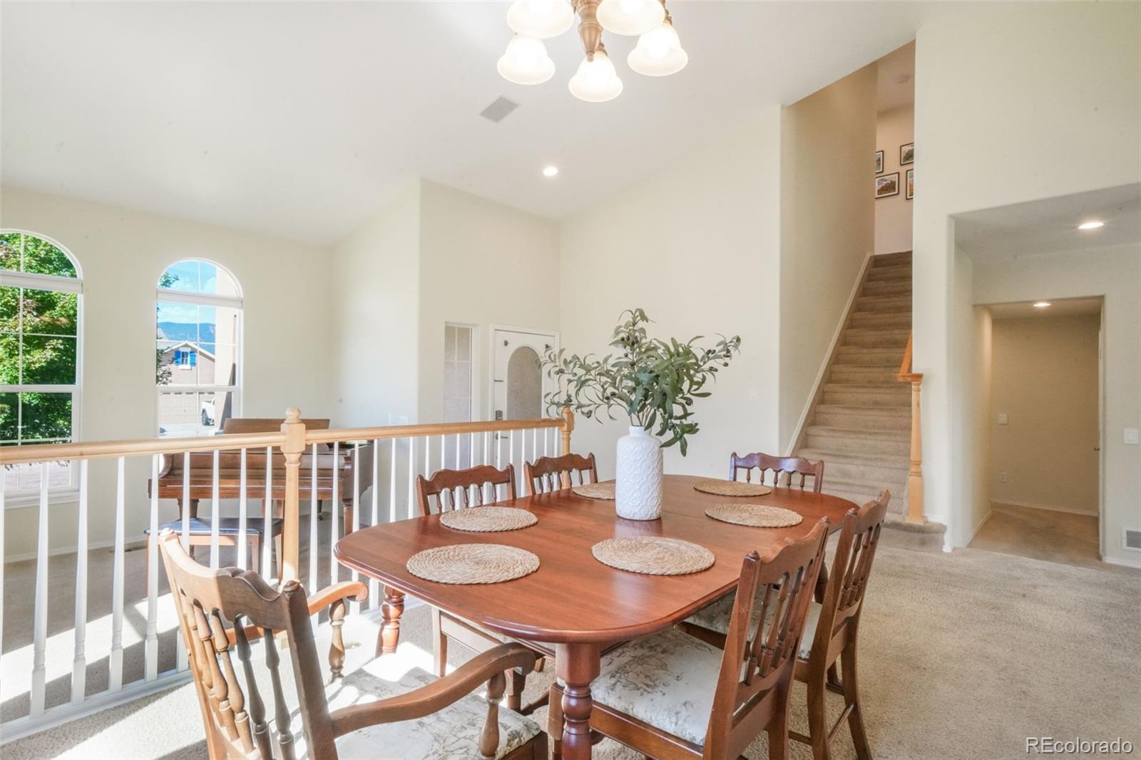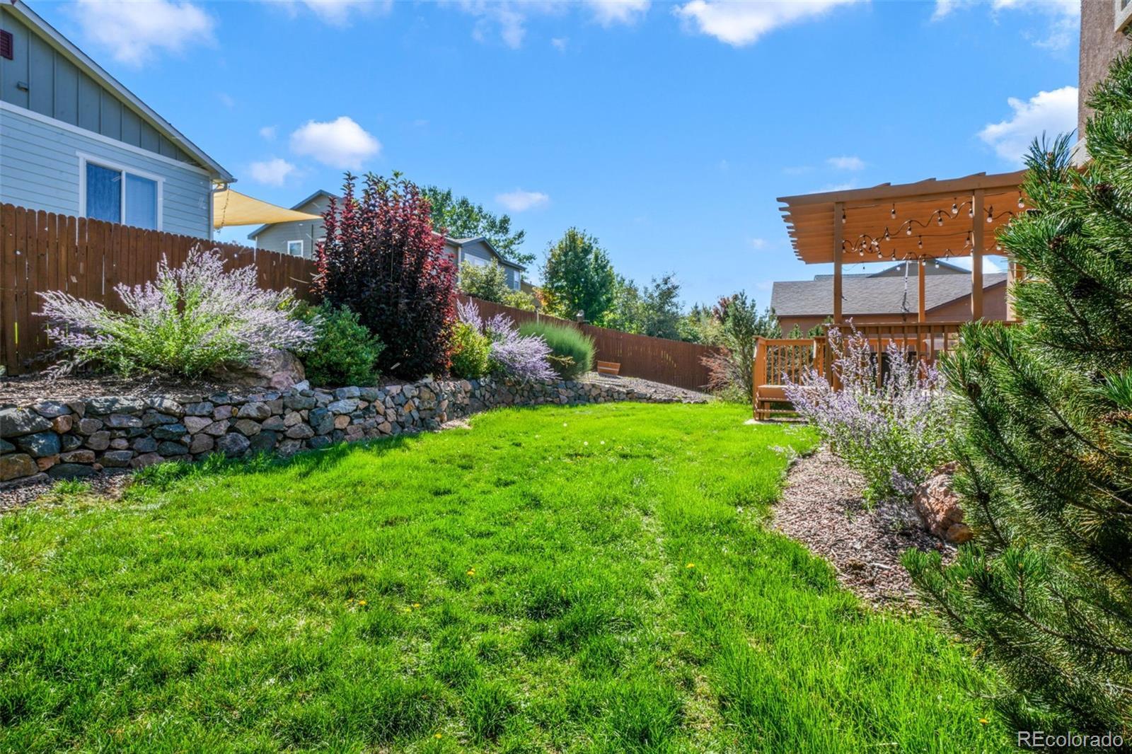 Welcome to this spacious two-story stucco home in the desirable Struthers Ranch community, offering 5 bedrooms, 4 bathrooms, central A/C, and a finished basement. The home includes a two-car garage and is designed for both comfort and functionality. Step inside to a formal living room with soaring ceilings and an elevated dining area that flows seamlessly into the open-concept kitchen. The kitchen features Corian countertops, rich wood cabinetry, stainless steel appliances, a gas range, and a charming window over the sink. An adjoining eat-in nook opens through sliding glass doors to the backyard retreat. The family room, just two steps down from the eat-in kitchen space, boasts a cozy brick gas fireplace with a wood mantle—perfect for gathering. A convenient powder bath and laundry room complete this level. Upstairs, the private primary suite includes an expansive five-piece bath while two additional bedrooms share a full bathroom, with the two front bedrooms showcasing stunning views. The finished basement offers exceptional versatility with a large recreation room, two more bedrooms, a full bath, and a generous storage room. Enjoy outdoor living in the beautifully landscaped backyard, complete with a pergola-topped wood deck, rock retaining wall, lush grass, mature landscaping, and full privacy fencing. Located in Northgate, this home offers easy access to Colorado Springs and Denver. Close to shopping, dining, entertainment, hospitals, schools, and more.