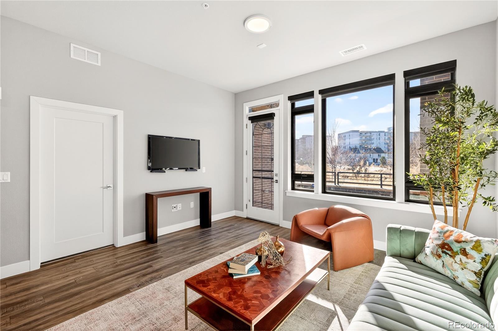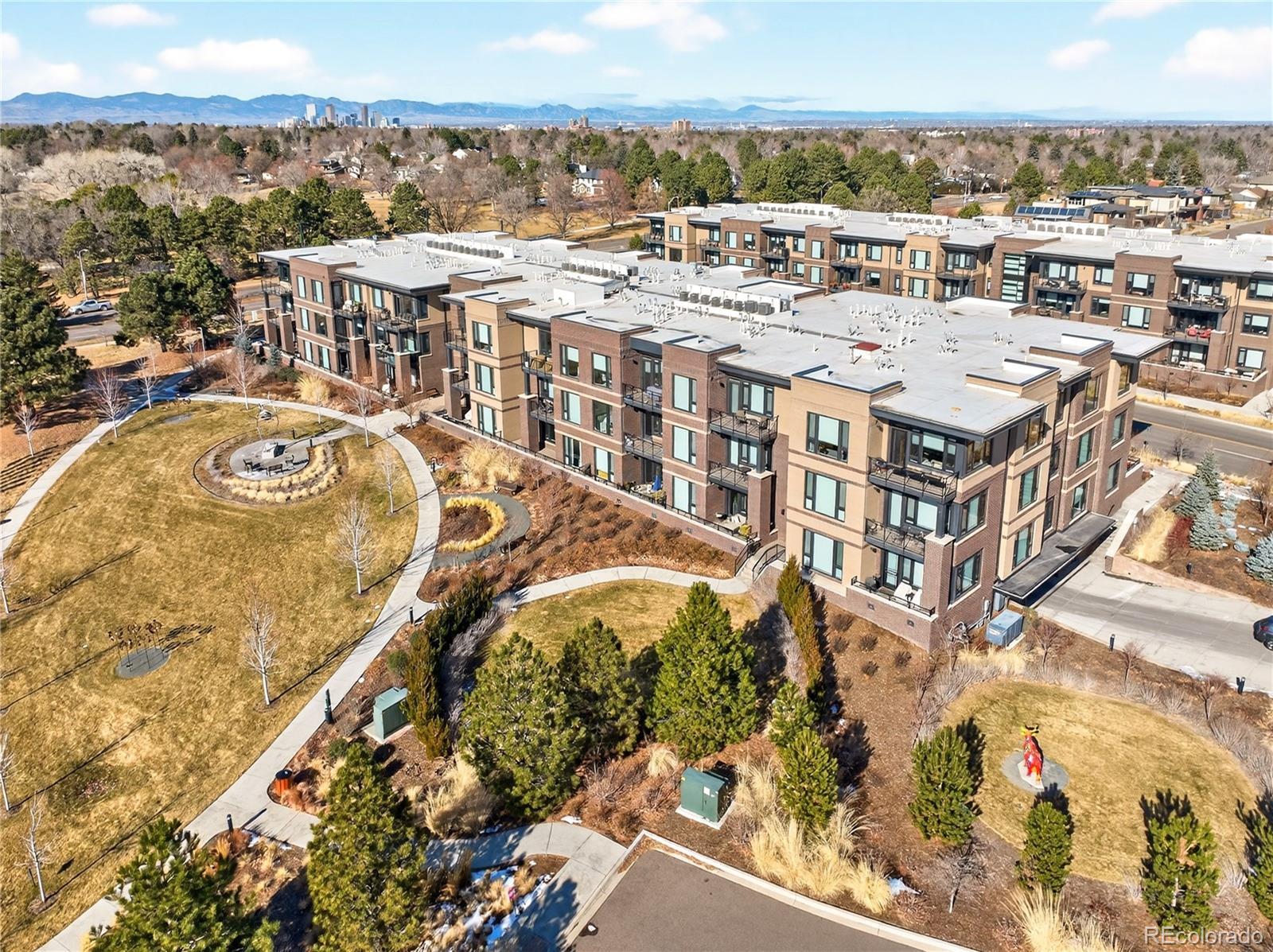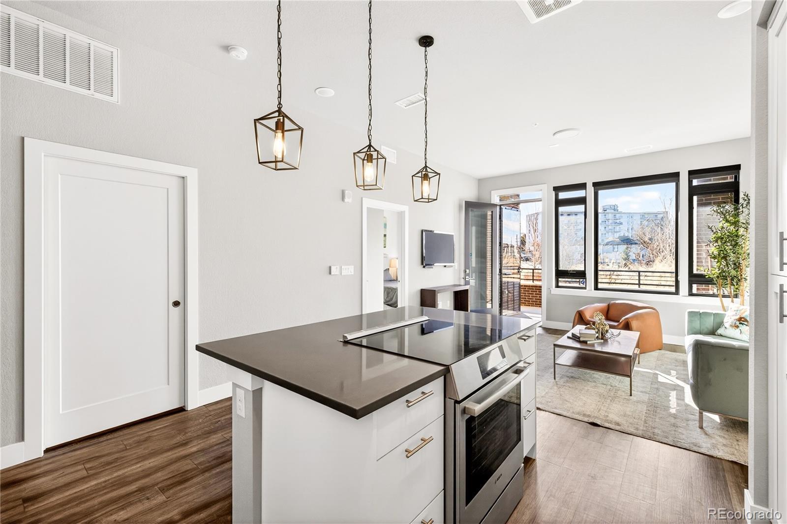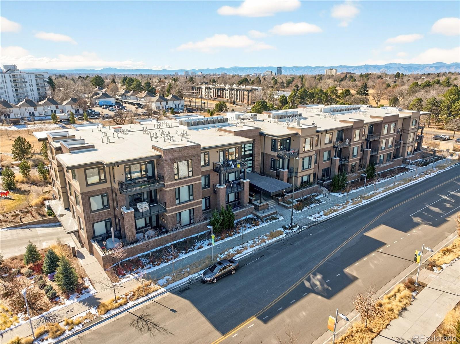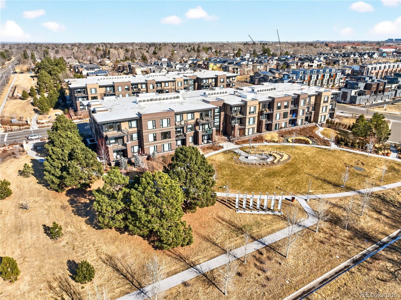 Modern Lowry living at Boulevard One. This light-filled 1-bedroom + den, 2-bath condominium offers nearly 1,000 square feet of thoughtfully designed, single-level living in one of Denver’s most sought-after neighborhoods. Built in 2020, the home features 10’ ceilings, floor-to-ceiling windows, and a desirable southern exposure that fills the space with natural light throughout the day with expansive views. The open kitchen is finished with sleek quartz countertops, contemporary tile backsplash, soft-close cabinetry, and a full Bosch appliance package including induction cooking—perfect for both everyday living and entertaining. Premium slide out shelves added in the kitchen. The spacious primary suite includes a walk-in closet and a beautifully appointed bath, while the additional den and second bathroom provide flexible space for guests, a home office, or media room. Enjoy indoor-outdoor living with a covered patio, one of the largest in the building with unobstructed views of the community park. The patio features an added, upgraded storm and security door. Additional highlights include central A/C, smart thermostat, in-unit washer and dryer, double-pane windows, elevator access, and underground, tandem parking space with your own EV charger. The HOA is professionally managed and comprehensive, covering building insurance, exterior maintenance, elevator service, landscaped grounds, secure access, and long-term capital reserves—reducing unpredictable ownership costs and eliminating major future expenses. The HOA is financially strong and secure with significant reserves. Ideally located between Crestmoor Park and the shops and restaurants of Boulevard One, with easy access to Cherry Creek, and downtown Denver. A rare opportunity for modern design, convenience, and low-maintenance living in the heart of Lowry.
