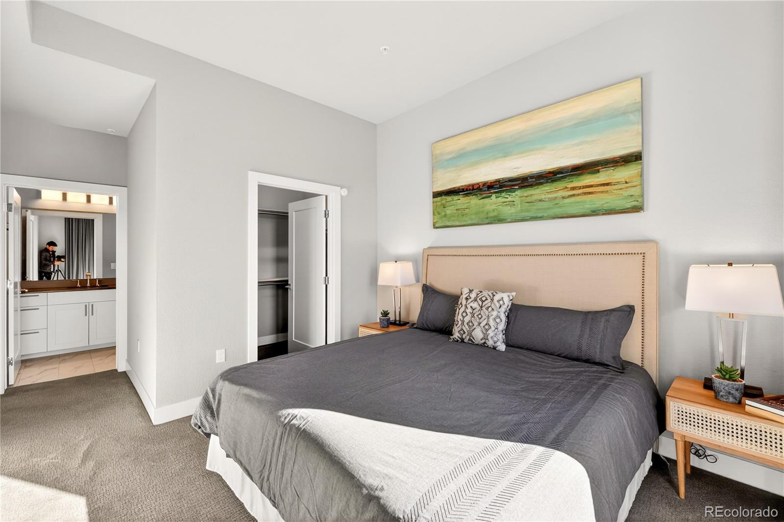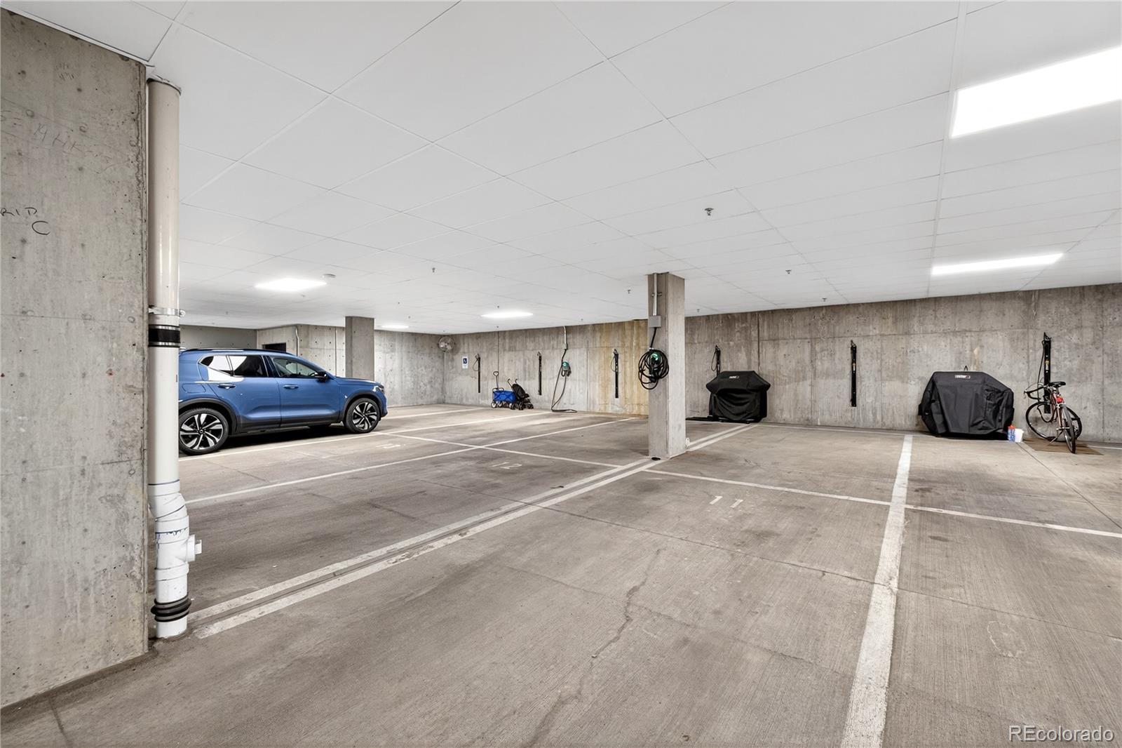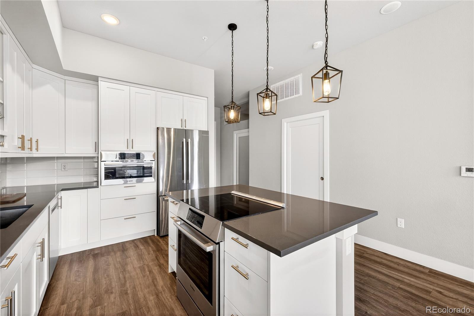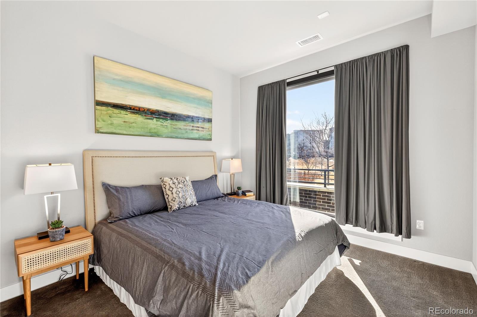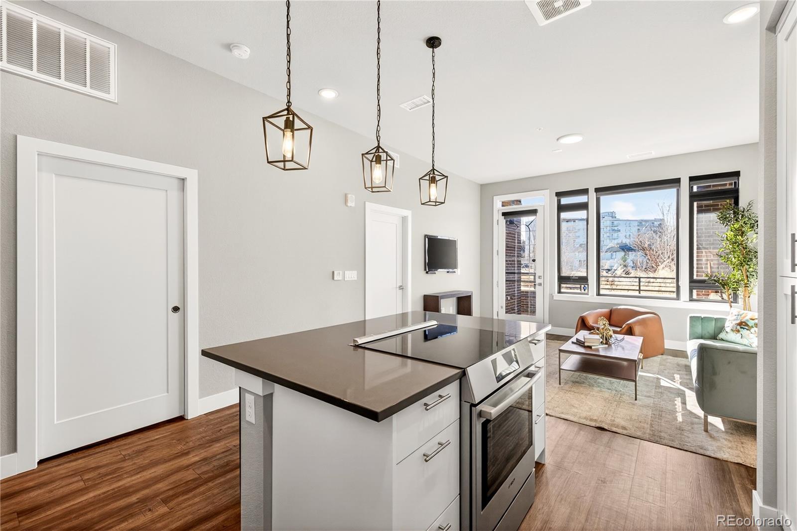 Modern Lowry living at Boulevard One. This light-filled 1-bedroom + den, 2-bath condominium offers nearly 1,000 square feet of thoughtfully designed, single-level living in one of Denver’s most sought-after neighborhoods. Built in 2020, the home features 10’ ceilings, floor-to-ceiling windows, and a desirable southern exposure that fills the space with natural light throughout the day with expansive views. The open kitchen is finished with sleek quartz countertops, contemporary tile backsplash, soft-close cabinetry, and a full Bosch appliance package including induction cooking—perfect for both everyday living and entertaining. Premium slide out shelves added in the kitchen. The spacious primary suite includes a walk-in closet and a beautifully appointed bath, while the additional den and second bathroom provide flexible space for guests, a home office, or media room. Enjoy indoor-outdoor living with a covered patio, one of the largest in the building with unobstructed views of the community park. The patio features an added, upgraded storm and security door. Additional highlights include central A/C, smart thermostat, in-unit washer and dryer, double-pane windows, elevator access, and underground, tandem parking space with your own EV charger. The HOA is professionally managed and comprehensive, covering building insurance, exterior maintenance, elevator service, landscaped grounds, secure access, and long-term capital reserves—reducing unpredictable ownership costs and eliminating major future expenses. The HOA is financially strong and secure with significant reserves. Ideally located between Crestmoor Park and the shops and restaurants of Boulevard One, with easy access to Cherry Creek, and downtown Denver. A rare opportunity for modern design, convenience, and low-maintenance living in the heart of Lowry.