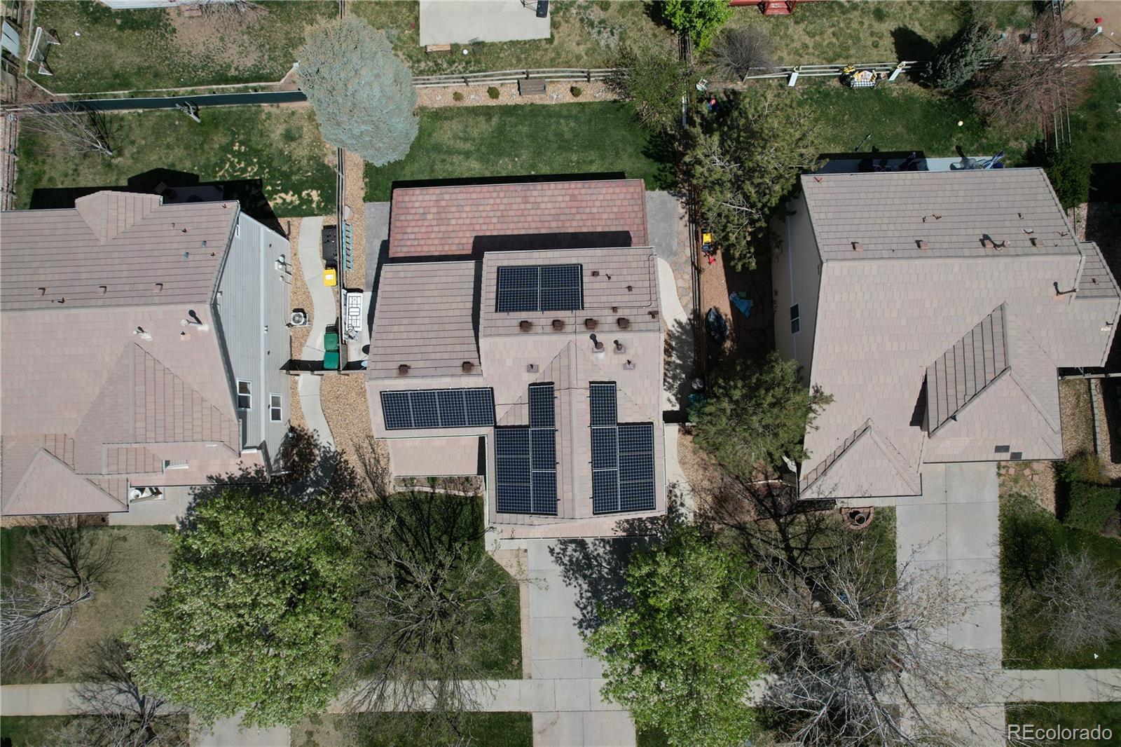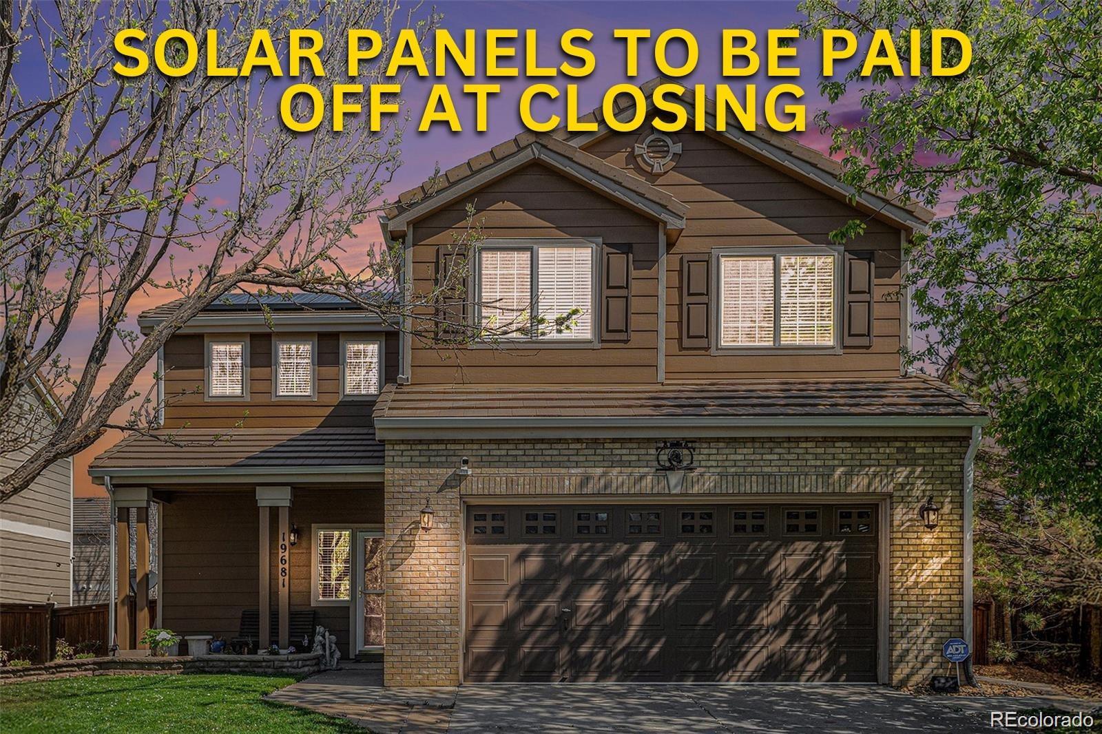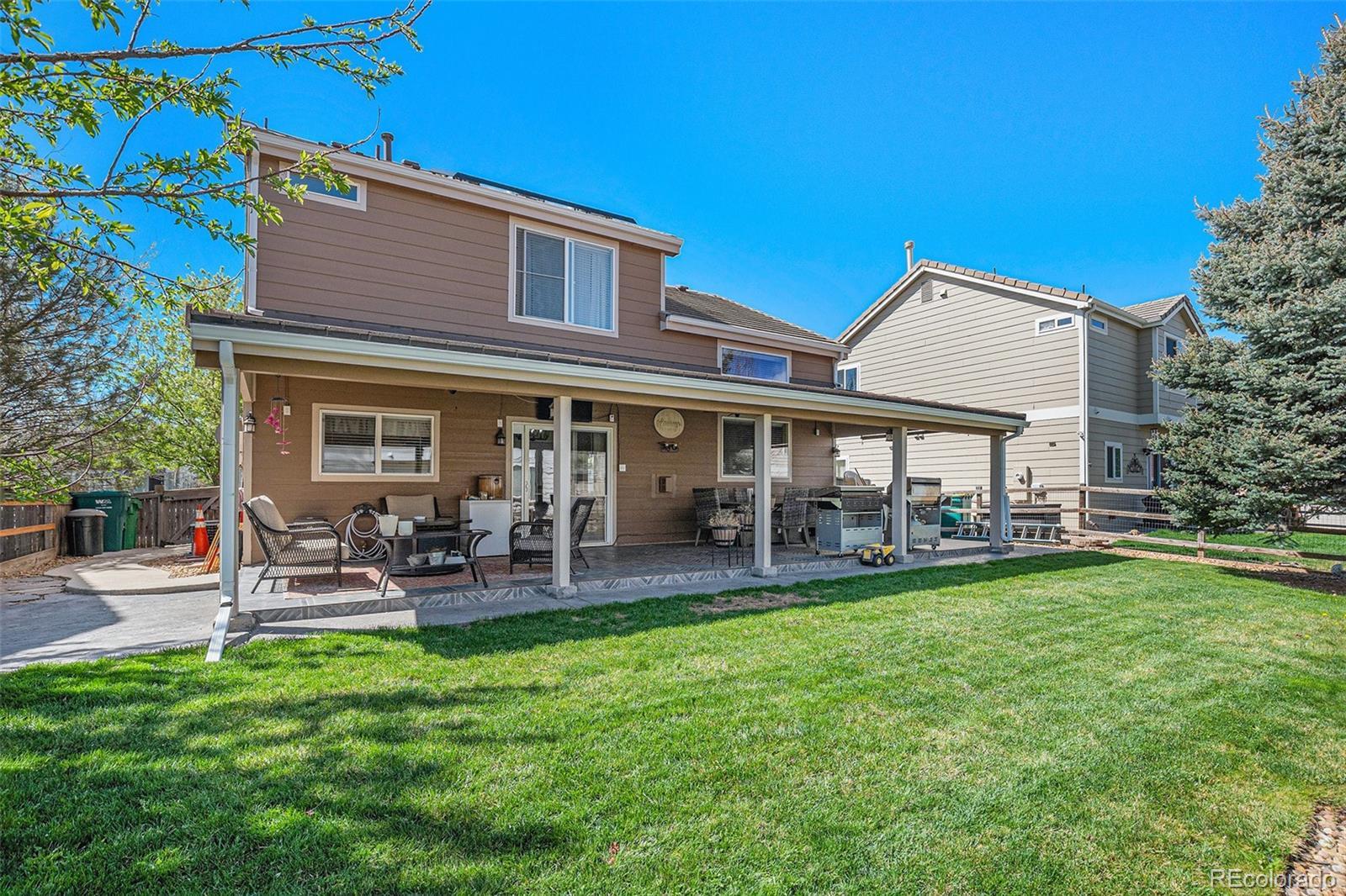 SOLAR PANELS PAID OFF AT CLOSING. Welcome home, beautifully maintained two-story home in the highly sought-after Singletree neighborhood of Aurora. Just minutes from Denver International Airport and with easy access to I-70 and E-470, this residence perfectly blends comfort, space, and thoughtful design in one of Aurora’s most convenient locations. Step inside and you’ll immediately notice the soaring vaulted ceilings and abundant natural light that give the home a bright, airy feel. The open-concept main level offers seamless flow between the living room, dining area, and kitchen, anchored by a stunning fireplace that adds warmth and character to the space. The kitchen features granite countertops, a large center island with seating, a custom tile backsplash, and an abundance of cabinetry — ideal for both entertaining and everyday living. Upstairs, you’ll find a flexible loft space perfect for a home office or creative nook, along with three spacious bedrooms. The primary suite is a true retreat, complete with a sliding barn door entry, a walk-in closet, and a fully renovated en-suite bathroom that boasts dual vanities, a granite countertop, updated lighting, and a spa-style walk-in shower with river rock flooring and bench seating. Two additional bedrooms and an updated full bathroom complete the upper level, providing comfortable accommodations. What truly sets this home apart is its covered front porch and unique expansive covered back patio — both ideal for year-round enjoyment. The backyard is fully fenced, and offers plenty of space for relaxing, grilling, or hosting summer gatherings. Dual ceiling fans and stamped concrete add both comfort and style to the outdoor space. Additional features include a vivint security cameras, a two-car garage and pride of ownership throughout. From the thoughtful layout to the stylish updates and unbeatable location, this is a home that checks all the boxes.
