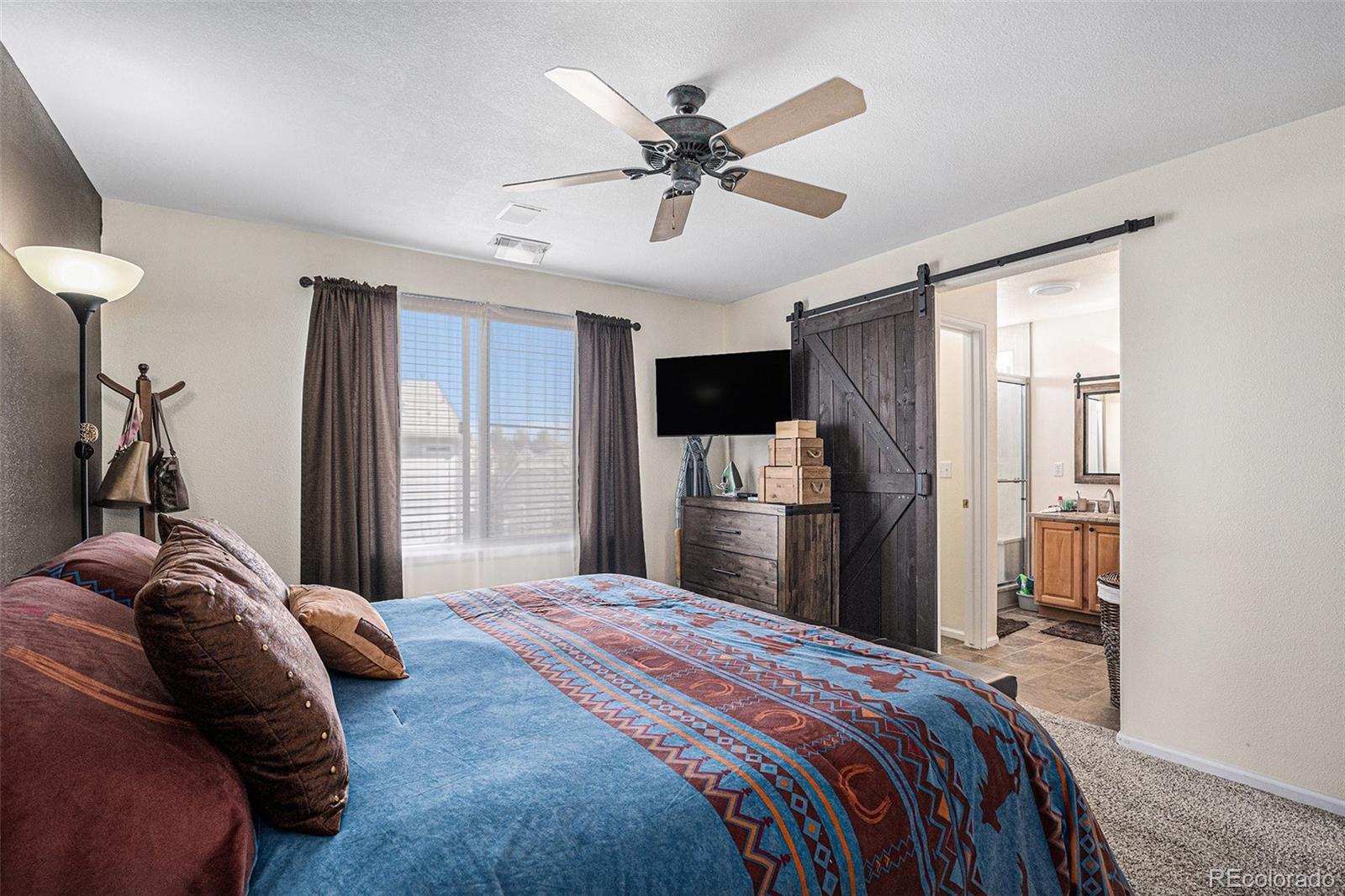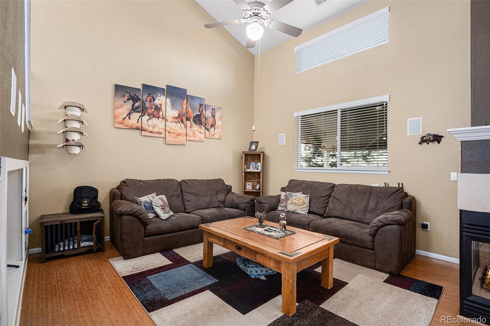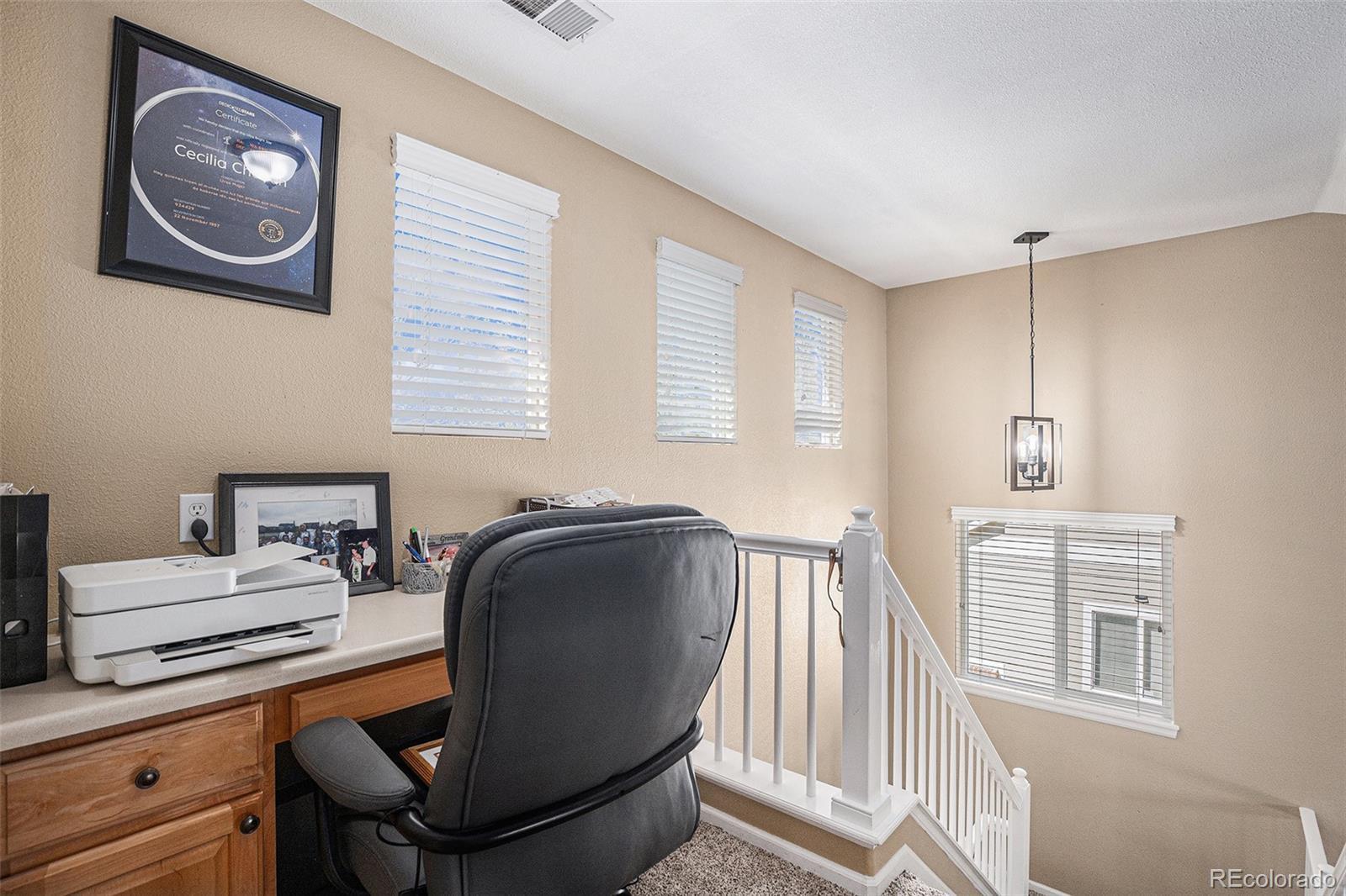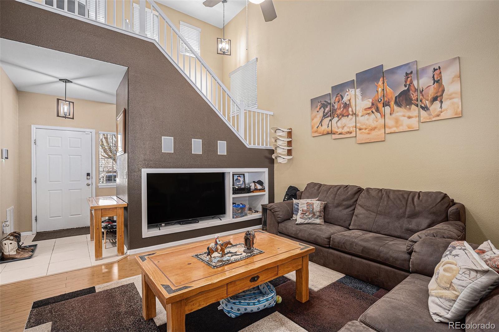 SOLAR PANELS PAID OFF AT CLOSING. Welcome home, beautifully maintained two-story home in the highly sought-after Singletree neighborhood of Aurora. Just minutes from Denver International Airport and with easy access to I-70 and E-470, this residence perfectly blends comfort, space, and thoughtful design in one of Aurora’s most convenient locations. Step inside and you’ll immediately notice the soaring vaulted ceilings and abundant natural light that give the home a bright, airy feel. The open-concept main level offers seamless flow between the living room, dining area, and kitchen, anchored by a stunning fireplace that adds warmth and character to the space. The kitchen features granite countertops, a large center island with seating, a custom tile backsplash, and an abundance of cabinetry — ideal for both entertaining and everyday living. Upstairs, you’ll find a flexible loft space perfect for a home office or creative nook, along with three spacious bedrooms. The primary suite is a true retreat, complete with a sliding barn door entry, a walk-in closet, and a fully renovated en-suite bathroom that boasts dual vanities, a granite countertop, updated lighting, and a spa-style walk-in shower with river rock flooring and bench seating. Two additional bedrooms and an updated full bathroom complete the upper level, providing comfortable accommodations. What truly sets this home apart is its covered front porch and unique expansive covered back patio — both ideal for year-round enjoyment. The backyard is fully fenced, and offers plenty of space for relaxing, grilling, or hosting summer gatherings. Dual ceiling fans and stamped concrete add both comfort and style to the outdoor space. Additional features include a vivint security cameras, a two-car garage and pride of ownership throughout. From the thoughtful layout to the stylish updates and unbeatable location, this is a home that checks all the boxes.