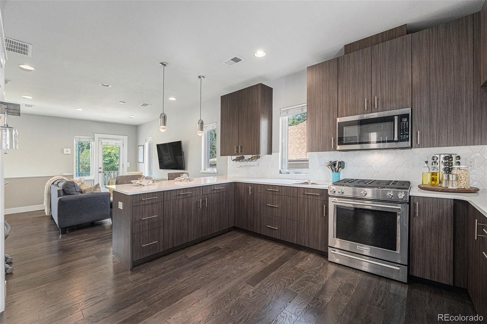Imagine sipping coffee as the sun rises or unwinding under the stars on your private rooftop deck. This inviting outdoor retreat offers mountain views, fresh air, and the perfect setting to relax or entertain. Inside, the home is thoughtfully designed with modern finishes, soaring ceilings, and an open-concept layout that blends style, comfort, and functionality. The gourmet kitchen shines with stainless steel appliances, a gas range, quartz countertops, and a spacious eat-in island—perfect for casual meals or lively dinner parties. A convenient half-bath is tucked just off the kitchen. The inviting family room is the perfect spot to unwind, whether you’re catching up on your favorite show or curling up with a good book. Upstairs, the serene primary suite features dual sinks, an oversized walk-in shower, and a generous walk-in closet, while a second bedroom provides flexibility for guests, a home office, or a nursery. On the ground floor, a custom desk area creates the perfect setup for working from home or gaming, or additional storage. Additional highlights include a one-car garage with a private driveway and ample storage. Forget about high HOA fees—your party wall agreement takes care of snow removal, trash, and landscaping. Perfectly located, this stunning townhome is a short walk from the grocery store, boutique shops, and some of the neighborhood’s best dining and coffee spots. With easy access to Jefferson Park, Downtown Denver, I-25, and I-70, it delivers connection, convenience, and a vibrant urban lifestyle in one exceptional package. Welcome home!