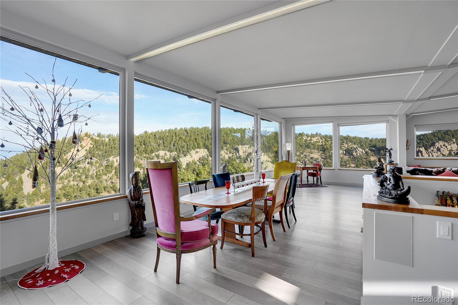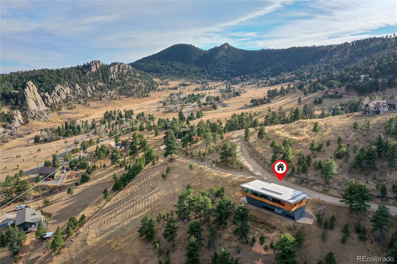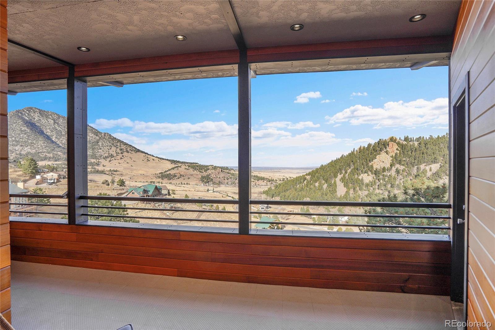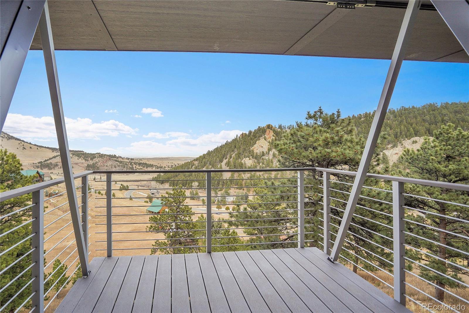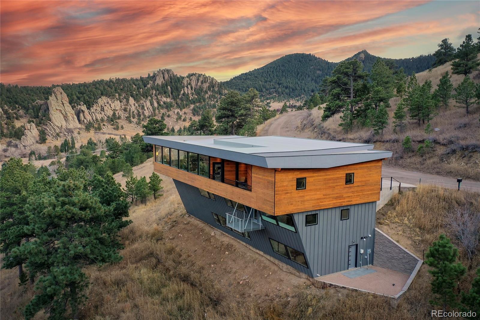 SPECTACULAR - Located 15 minutes from Boulder and Golden and just 25 minutes to Denver, CLOUD NINE is a mid-century modern inspired architectural marvel. Set into a mountainside, a commanding pedestal supports a cantilevered upper level that rises above the surrounding forest. Wall to wall and floor to ceiling windows provide panoramic views extending from the monumental Fountain and Lyons rock formations out to the eastern plains. The upper level great room seamlessly connects an entry foyer with elevator access, monolithic gourmet kitchen, formal living, dining, and media spaces wrapped around a central stairwell with display cabinetry. The stairwell descends alongside a 21ft tall sunlit atrium to a private middle level including a sanctuary master bedroom with a hanging deck, two spacious secondary bedrooms, laundry, cozy mezzanine library, elevator and an adjacent dog/play yard. All bedrooms have expansive sloped windows with stunning views. Continuing down to the modern industrial lower level, which introduces the home's steel and concrete structure, there is a fabulous two-story atrium/gallery/game space with an unexpected sloped wall featuring modern gilt paneling and a large sheltered patio for epic outdoor entertaining. This level also has a sprawling flex area suitable for exercise, office and studio, a finished utility room, an extra-large storage room and a generous sequestered guest suite with ensuite bath and private patio. All rooms have expansive stunning views. Additional features include in-floor and in-ceiling radiant heating and cooling, an oversized 3+ vehicle garage with oversized doors, RV storage and workshop. Street level parking, walkout patios, and a 3-story elevator provide easy ADA access to the entire home. This home is a rare find - a foothills gem with south facing, street level access -NO steep ice-covered driveway or entry!
