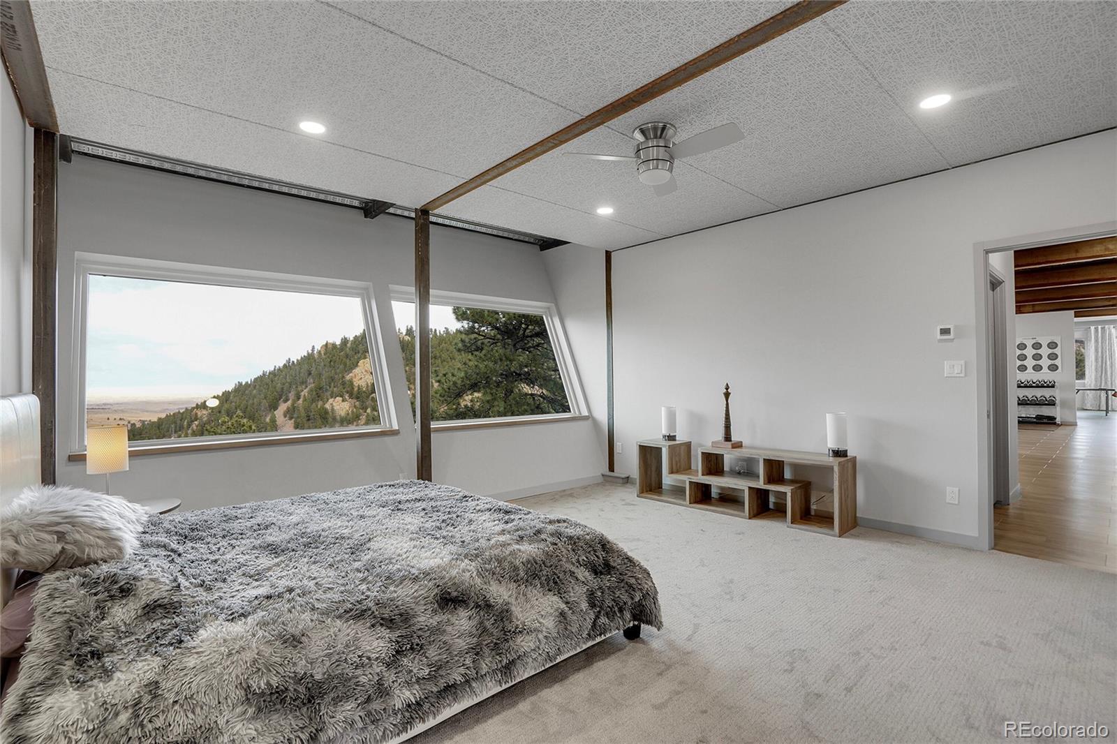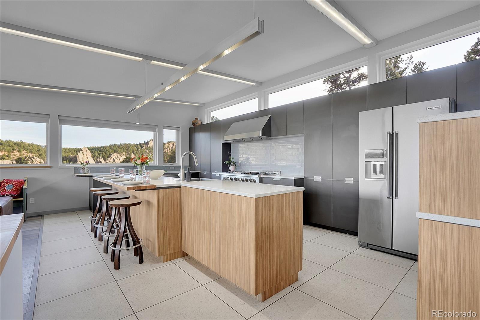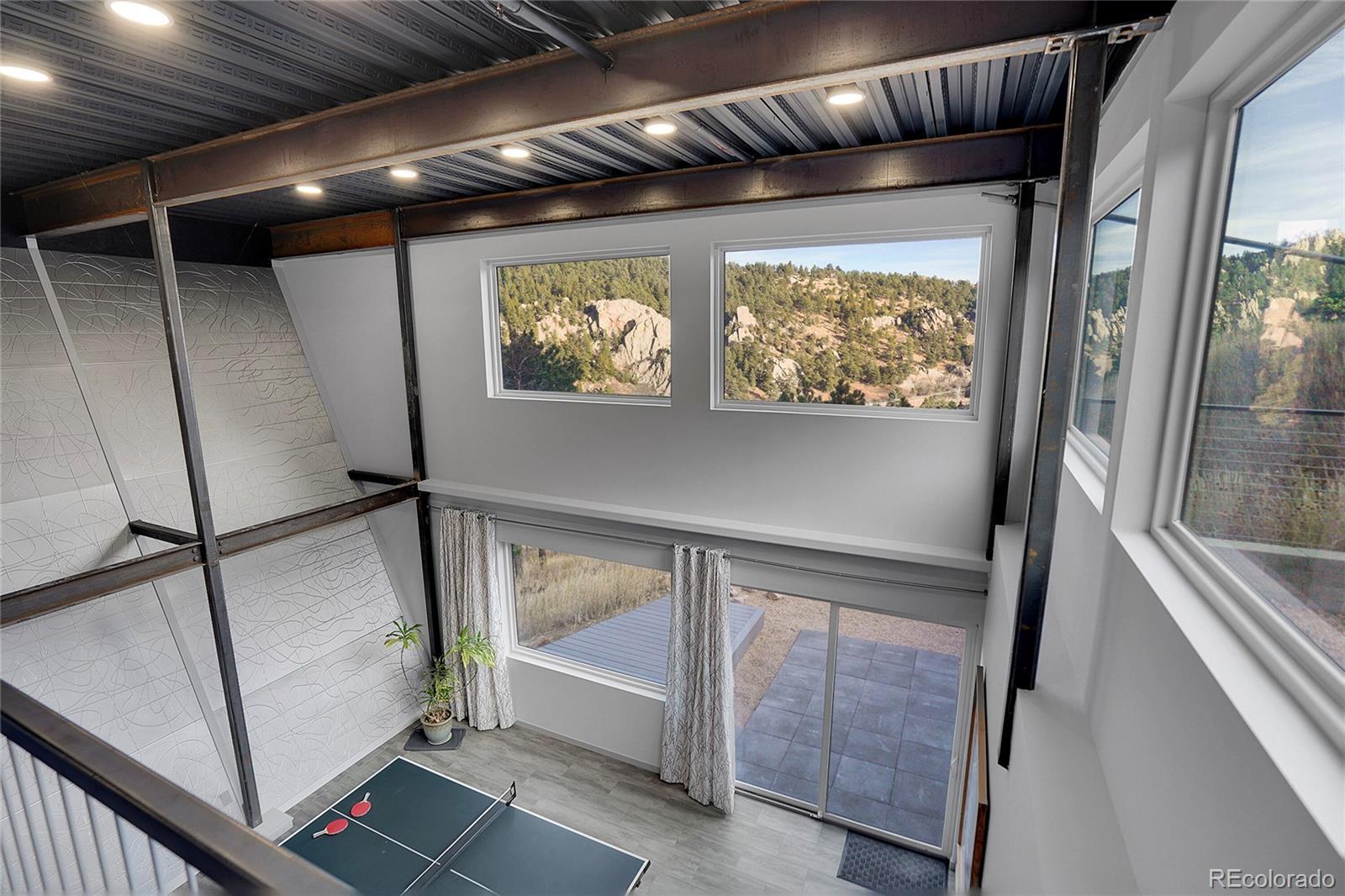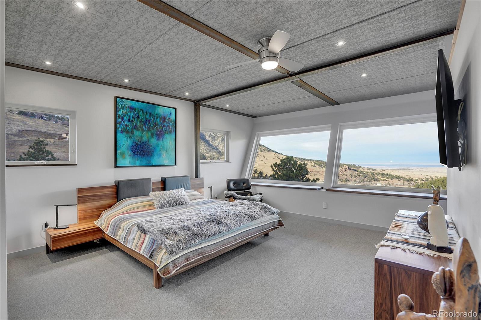 SPECTACULAR - Located 15 minutes from Boulder and Golden and just 25 minutes to Denver, CLOUD NINE is a mid-century modern inspired architectural marvel. Set into a mountainside, a commanding pedestal supports a cantilevered upper level that rises above the surrounding forest. Wall to wall and floor to ceiling windows provide panoramic views extending from the monumental Fountain and Lyons rock formations out to the eastern plains. The upper level great room seamlessly connects an entry foyer with elevator access, monolithic gourmet kitchen, formal living, dining, and media spaces wrapped around a central stairwell with display cabinetry. The stairwell descends alongside a 21ft tall sunlit atrium to a private middle level including a sanctuary master bedroom with a hanging deck, two spacious secondary bedrooms, laundry, cozy mezzanine library, elevator and an adjacent dog/play yard. All bedrooms have expansive sloped windows with stunning views. Continuing down to the modern industrial lower level, which introduces the home's steel and concrete structure, there is a fabulous two-story atrium/gallery/game space with an unexpected sloped wall featuring modern gilt paneling and a large sheltered patio for epic outdoor entertaining. This level also has a sprawling flex area suitable for exercise, office and studio, a finished utility room, an extra-large storage room and a generous sequestered guest suite with ensuite bath and private patio. All rooms have expansive stunning views. Additional features include in-floor and in-ceiling radiant heating and cooling, an oversized 3+ vehicle garage with oversized doors, RV storage and workshop. Street level parking, walkout patios, and a 3-story elevator provide easy ADA access to the entire home. This home is a rare find - a foothills gem with south facing, street level access -NO steep ice-covered driveway or entry!