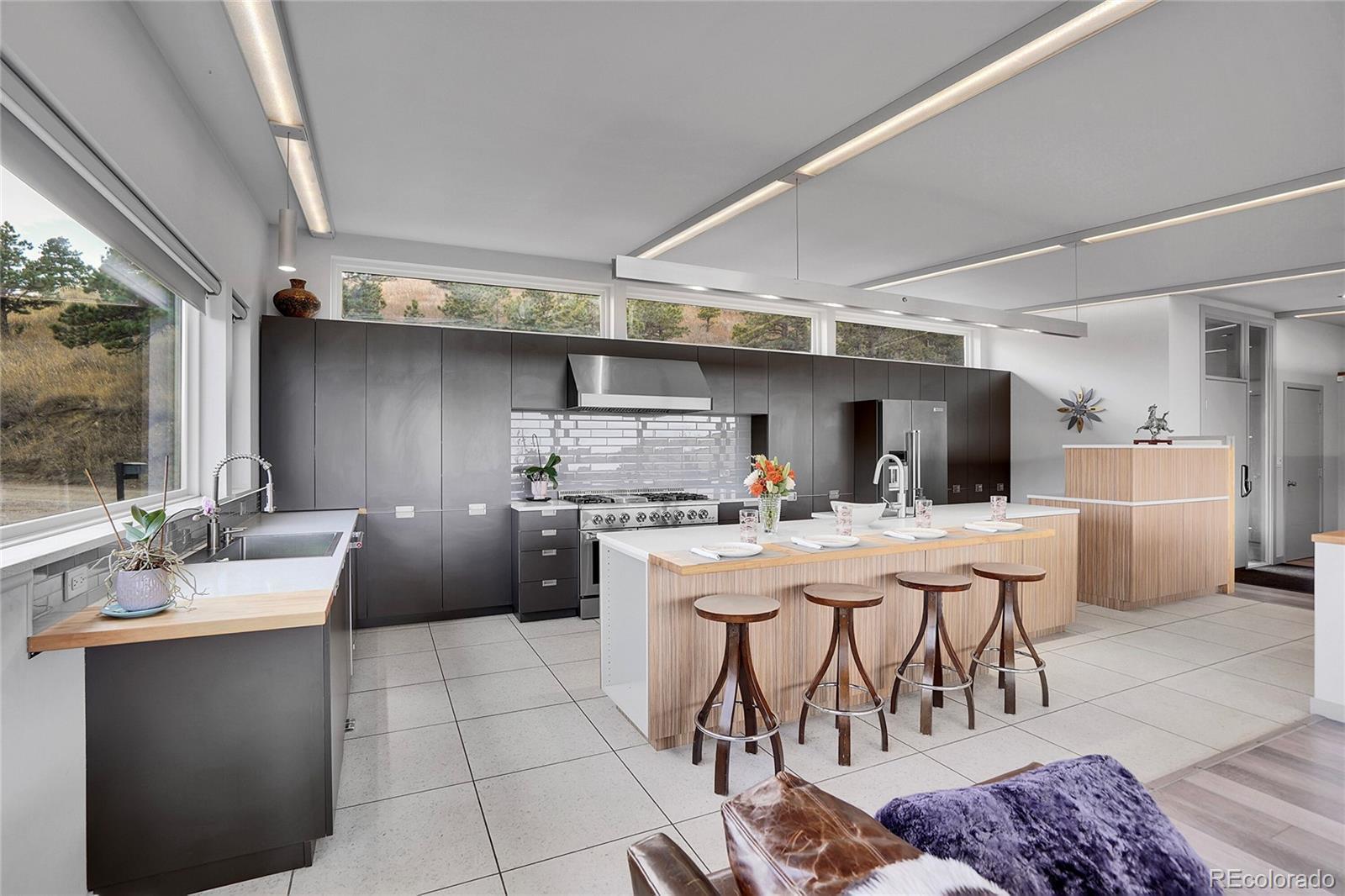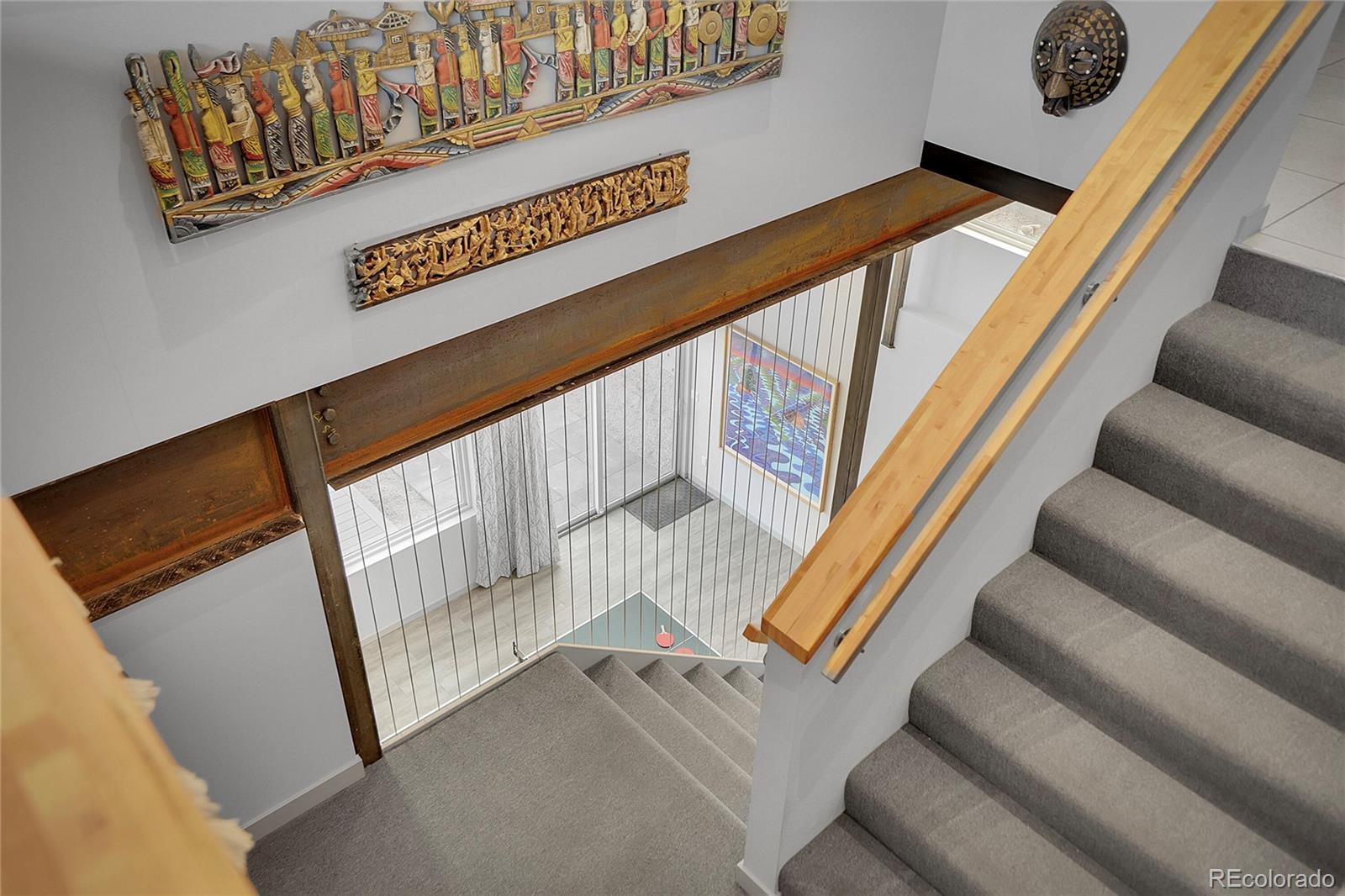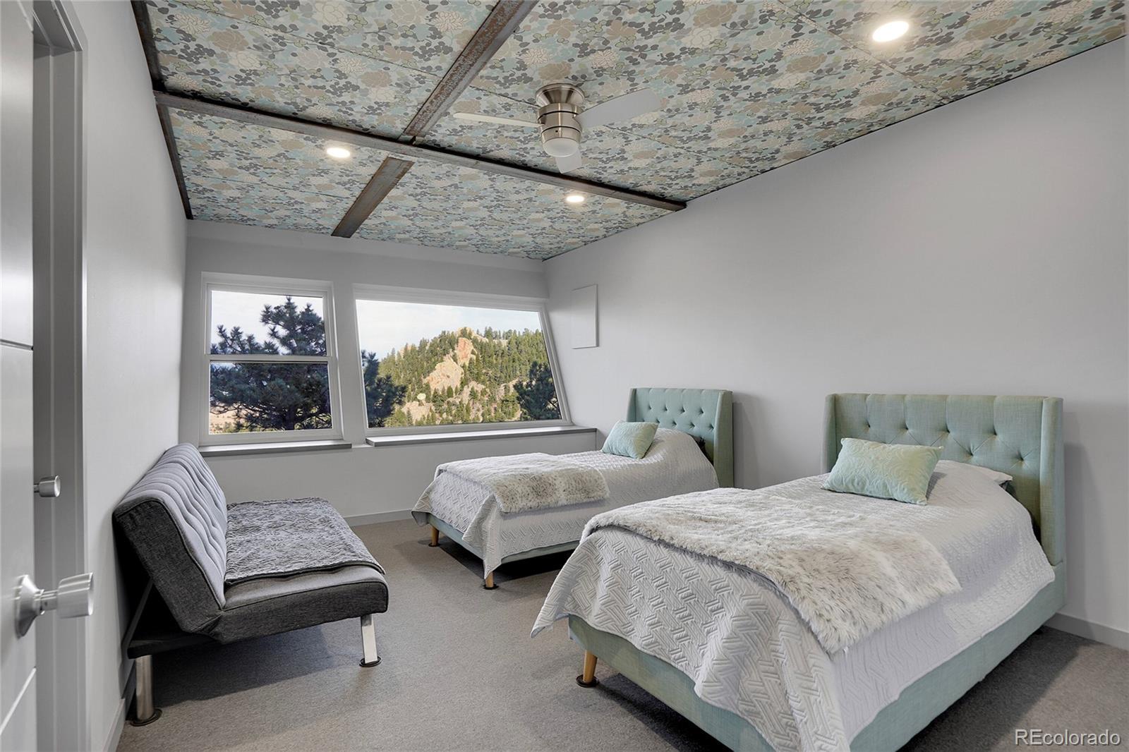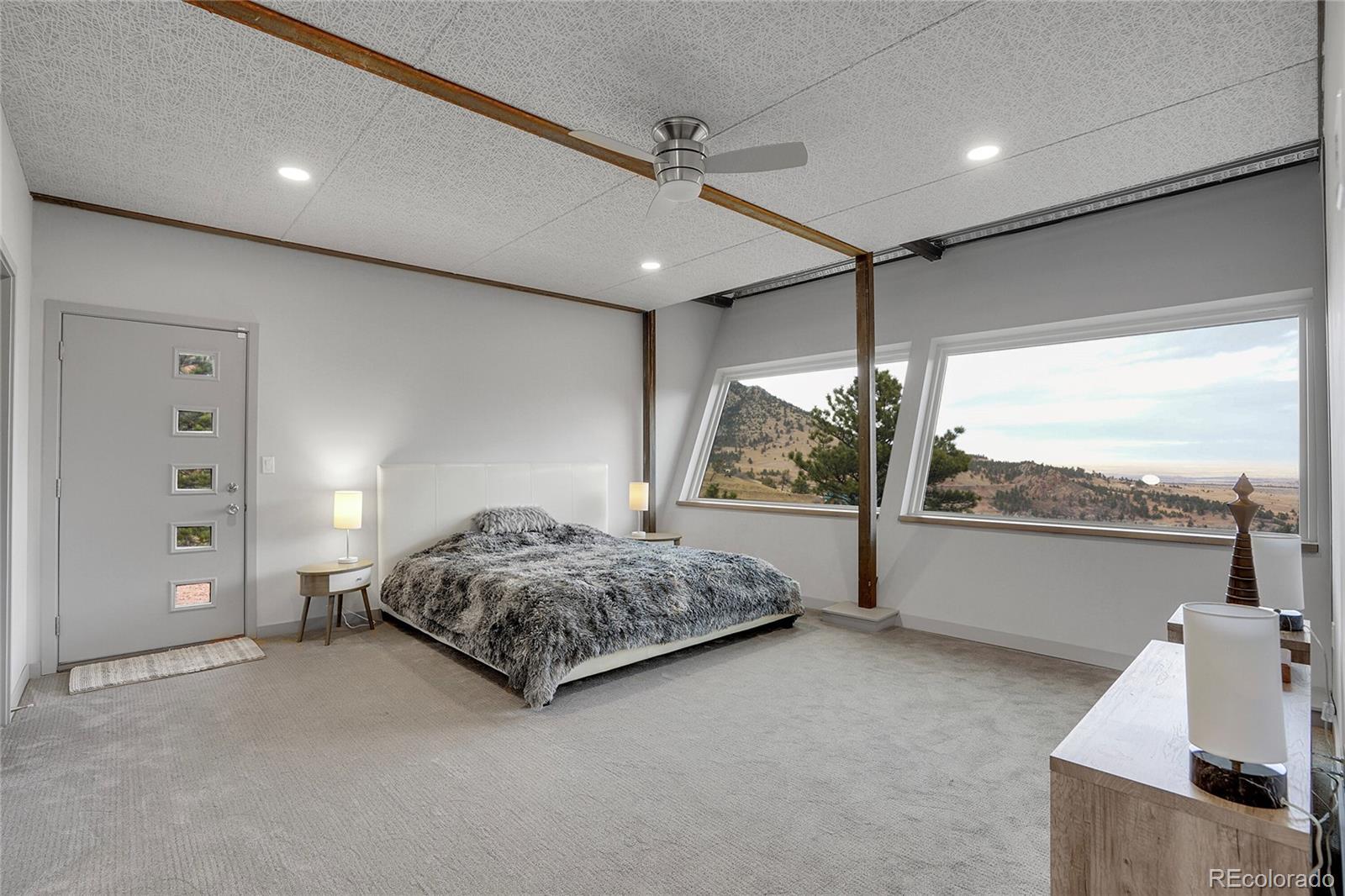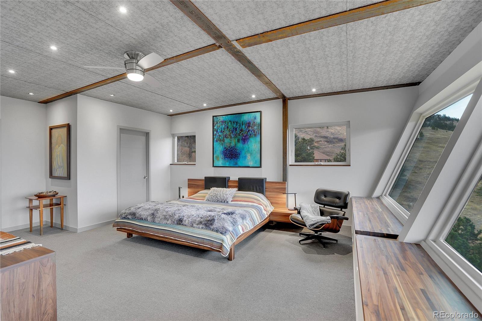 SPECTACULAR - Located 15 minutes from Boulder and Golden and just 25 minutes to Denver, CLOUD NINE is a mid-century modern inspired architectural marvel. Set into a mountainside, a commanding pedestal supports a cantilevered upper level that rises above the surrounding forest. Wall to wall and floor to ceiling windows provide panoramic views extending from the monumental Fountain and Lyons rock formations out to the eastern plains. The upper level great room seamlessly connects an entry foyer with elevator access, monolithic gourmet kitchen, formal living, dining, and media spaces wrapped around a central stairwell with display cabinetry. The stairwell descends alongside a 21ft tall sunlit atrium to a private middle level including a sanctuary master bedroom with a hanging deck, two spacious secondary bedrooms, laundry, cozy mezzanine library, elevator and an adjacent dog/play yard. All bedrooms have expansive sloped windows with stunning views. Continuing down to the modern industrial lower level, which introduces the home's steel and concrete structure, there is a fabulous two-story atrium/gallery/game space with an unexpected sloped wall featuring modern gilt paneling and a large sheltered patio for epic outdoor entertaining. This level also has a sprawling flex area suitable for exercise, office and studio, a finished utility room, an extra-large storage room and a generous sequestered guest suite with ensuite bath and private patio. All rooms have expansive stunning views. Additional features include in-floor and in-ceiling radiant heating and cooling, an oversized 3+ vehicle garage with oversized doors, RV storage and workshop. Street level parking, walkout patios, and a 3-story elevator provide easy ADA access to the entire home. This home is a rare find - a foothills gem with south facing, street level access -NO steep ice-covered driveway or entry!