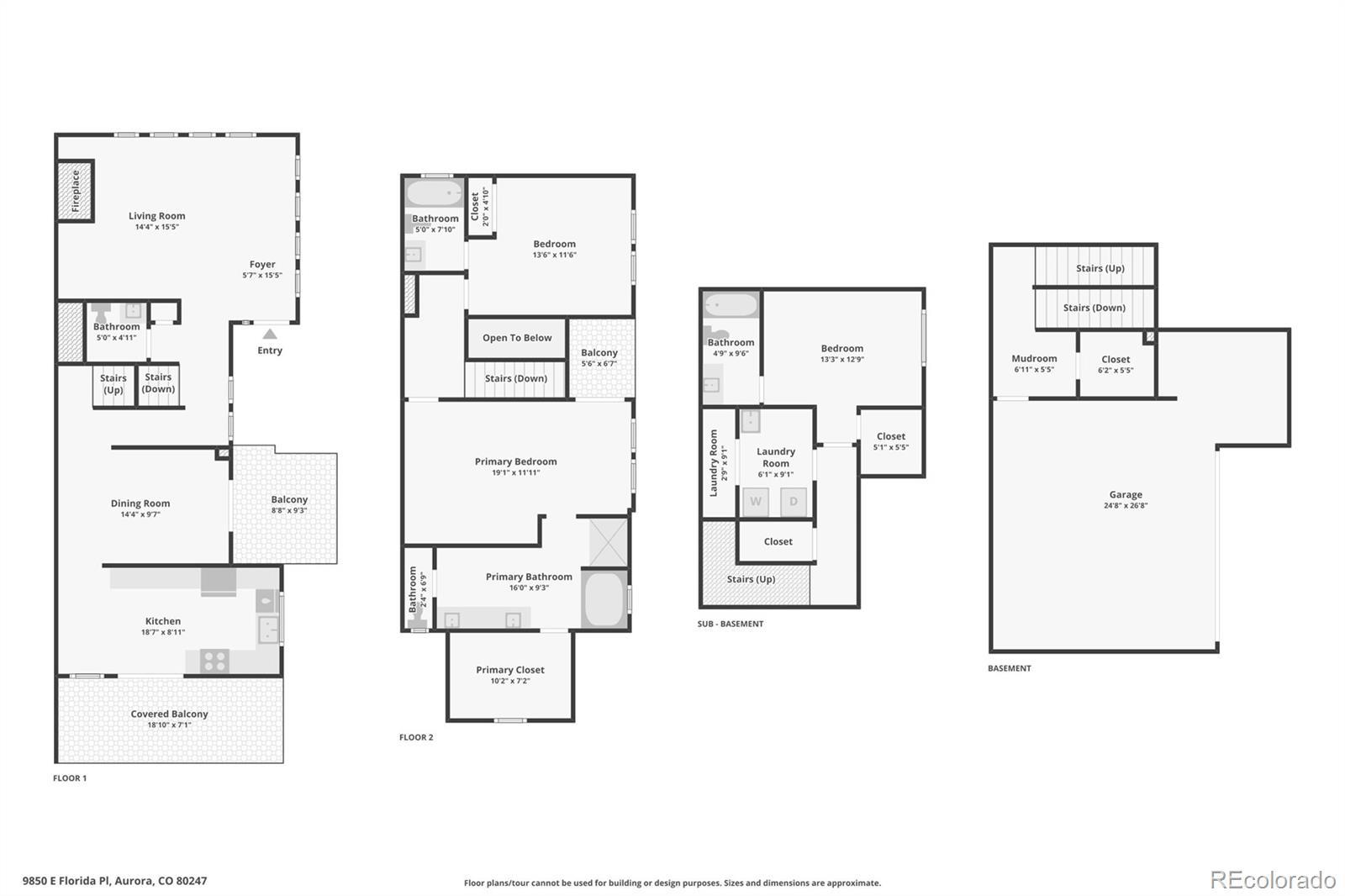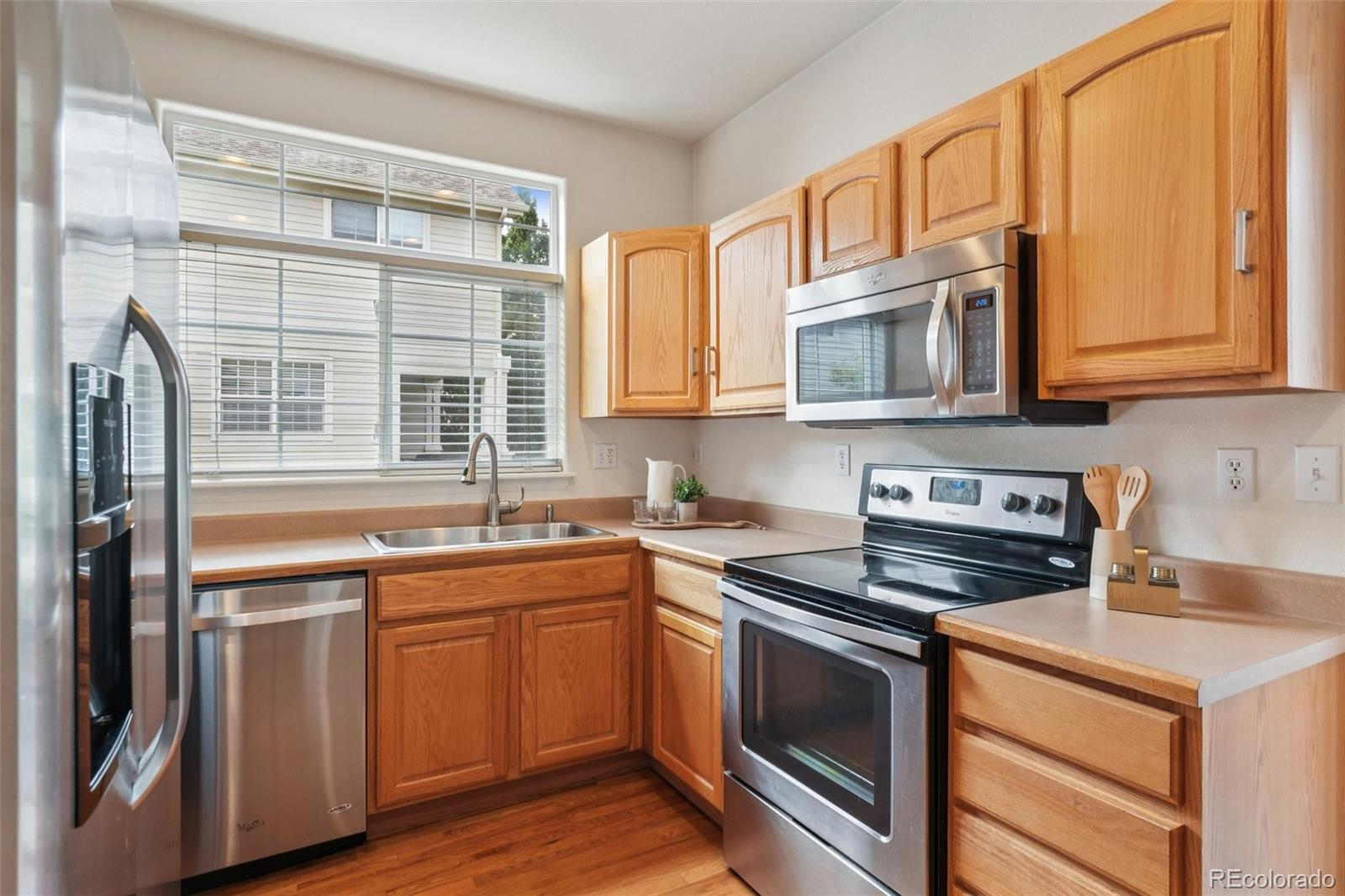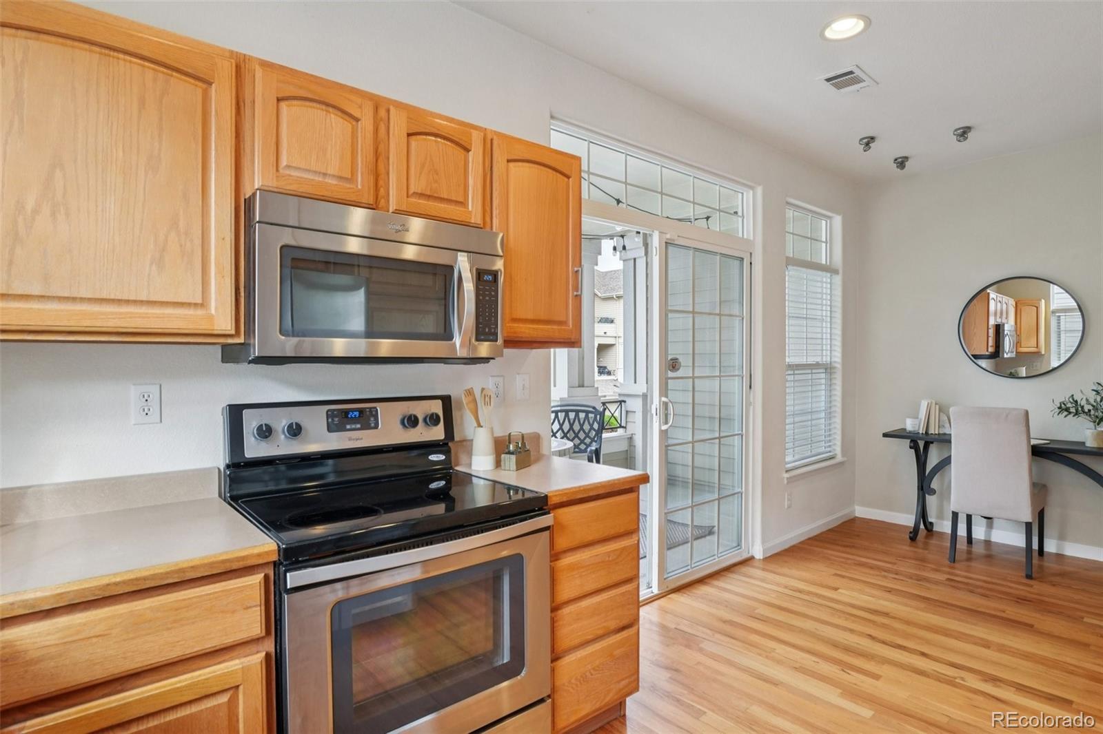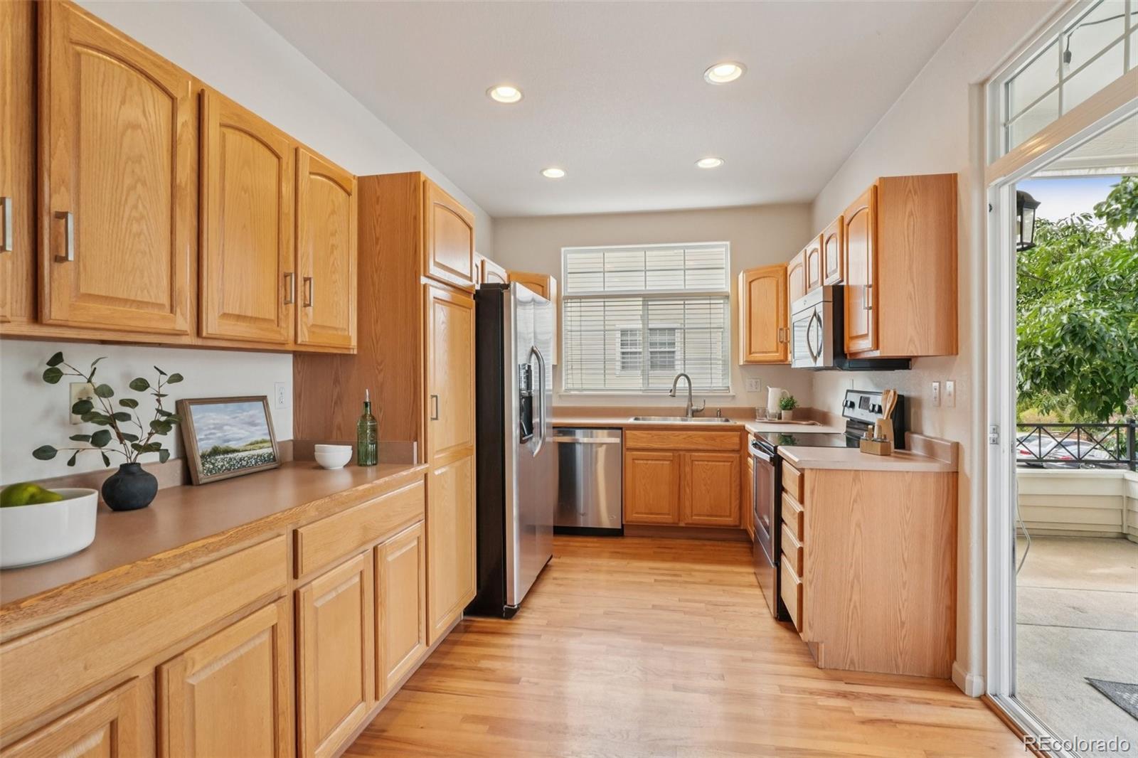End unit, multiple balconies, resort-style pool, and private fully enclosed dog park — this Kensington townhome and community is an exceptional opportunity in value, living space, and location! Boasting the largest floorplan in the neighborhood, this home lives like a single-family residence and is ideal for flexible living, roommates (house hack!), or anyone craving room to spread out. The thoughtful split-level layout provides functional separation and privacy across every floor. Entering through the extended two-car garage with a dedicated driveway and storage bump-out, an oversized storage/coat closet awaits and is the perfect catch-all. The lower level lives like its own suite, with laundry, storage, a garden-level bedroom, and attached full bath—great for guests, roommates, or a private workspace. The main levels provide generous living and dining spaces for both everyday routines and special gatherings. A dedicated entertainment wall grounds the airy living room, and a convenient powder bath is tucked nearby. The dedicated dining area opens to its own private balcony, while the kitchen impresses with ample cabinetry, eat-in potential, and direct access to a large outdoor space perfect for grilling and al fresco dining. Upstairs, the primary suite is spacious and serene with vaulted ceilings, a cozy reading nook, private balcony, five-piece en-suite bath, and a huge walk-in closet you will love! A secondary bedroom, with it's own full bath, complete the upper level. Recent updates include: ROOF (2024), kitchen sink/faucet/disposal (2023), two upstairs toilets (2023), carpet (2022), furnace/AC with whole house humidifier (2019), washer and dryer (2018), and select light fixtures (newer). Conveniently located near Gardens on Havana, Costco, and countless restaurants and amenities, 9850 E Florida Place offers space, comfort, and an unbeatable lifestyle.