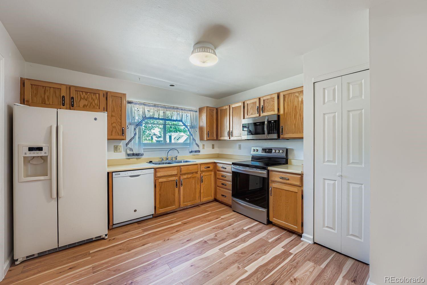 Welcome to this charming 2-bedroom, 1-bathroom end-unit townhome with no HOA! Situated on a spacious corner lot, this home offers a fully fenced backyard with a concrete patio and wood deck—ideal for entertaining or weekend BBQs. The low-maintenance xeriscaped yard includes planter boxes that can easily be converted into a garden space. Enjoy the convenience of an attached one-car garage, plus plenty of on-street parking for guests. Inside, you'll find an open living and dining area with vaulted ceilings, fresh paint, and updated flooring—truly move-in ready! The eat-in kitchen offers a small pantry, generous cabinet and counter space, and includes all appliances. A dedicated laundry room comes complete with a washer and dryer. The versatile second bedroom can be used as a home office, playroom, or flex space to suit your needs. Additional highlights include: Air Conditioning (2019), furnace (2019), roof (circa 2023), newer stove and microwave, interior paint (8/2025), flooring (8/2025), double pane windows (2023) electrical panel (8/2025), newer garage door opener, and a newer backyard fence. Come see it for yourself!