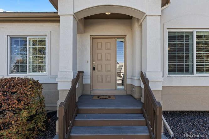 Fresh, light, and low-maintenance—this updated Heritage Greens at Legacy Ridge duplex-style ranch blends privacy, convenience, and charm. One of the only two-unit homes in the community, it offers gorgeous hardwood floors, vaulted ceilings, fresh paint, and plantation shutters throughout the main level. The open living area feels bright and inviting, while the dedicated office features French doors and built-in desk and shelving—perfect for remote work or reading. The spacious primary suite includes brand-new carpet and an updated five-piece ensuite bath with double vanity and walk-in shower. Enjoy a truly easy lifestyle in Heritage Greens at Legacy Ridge—where all exterior and roof maintenance is handled by the HOA, giving you more time to relax and enjoy the community amenities. The beautifully maintained grounds provide easy access to the clubhouse, pool, tennis, and pickleball courts, creating an active and social neighborhood atmosphere. Close to the Legacy Ridge Golf Course, one of Westminster’s most beloved public courses, offering scenic views and a convenient way to enjoy Colorado’s outdoors. This rare duplex-style ranch offers a perfect lock-and-leave option with low-maintenance living, resort-style amenities, and a prime location near shopping, dining, and everyday conveniences. Move-in ready, freshly staged, and full of natural light—this Heritage Greens at Legacy Ridge home is ready to welcome you!
