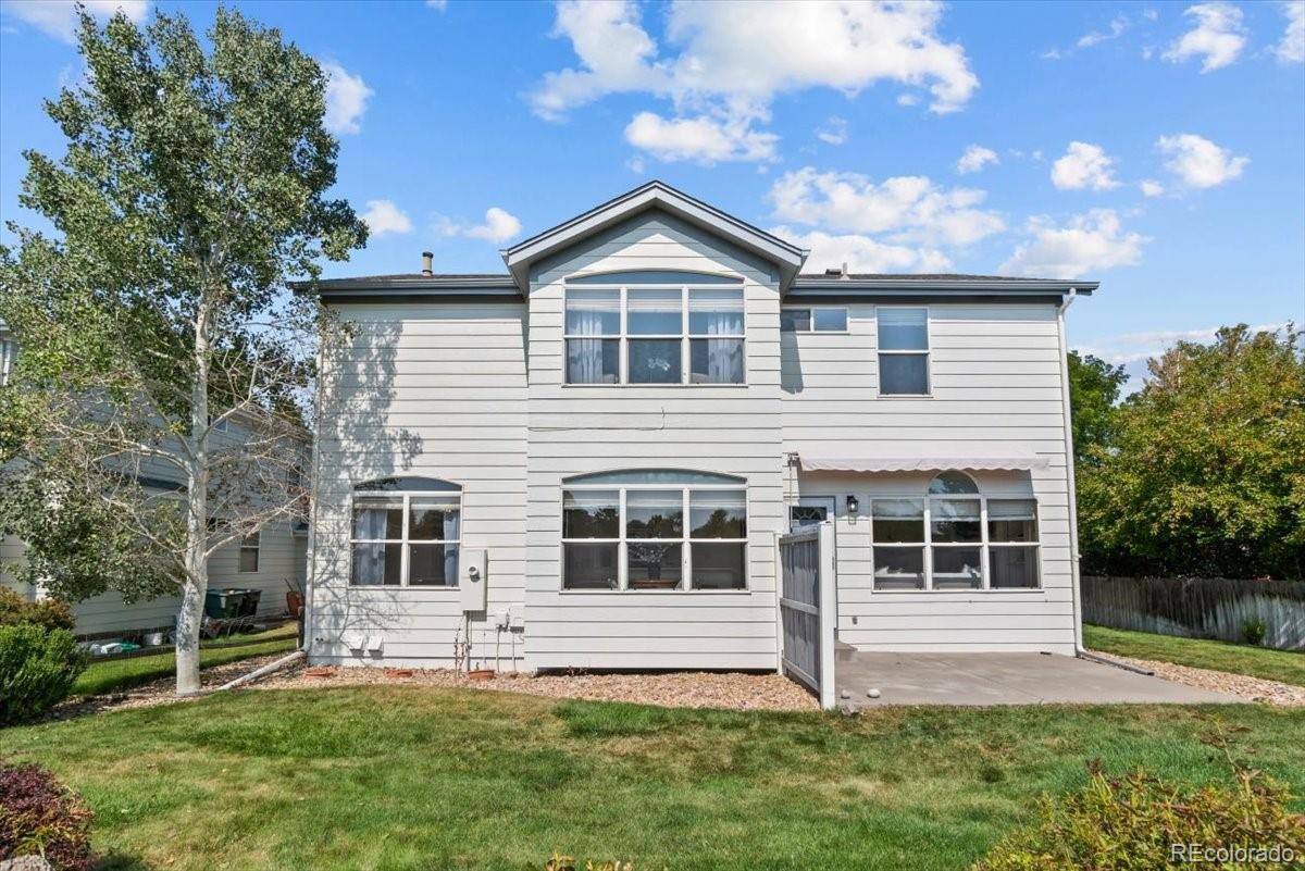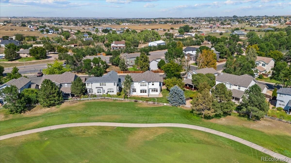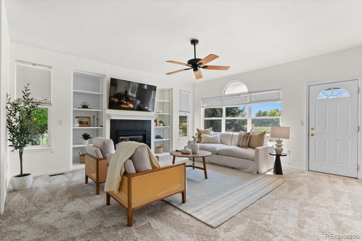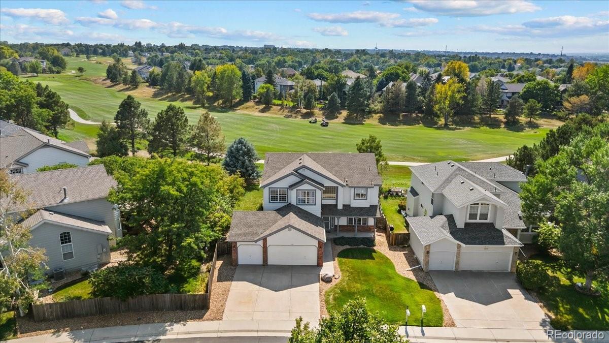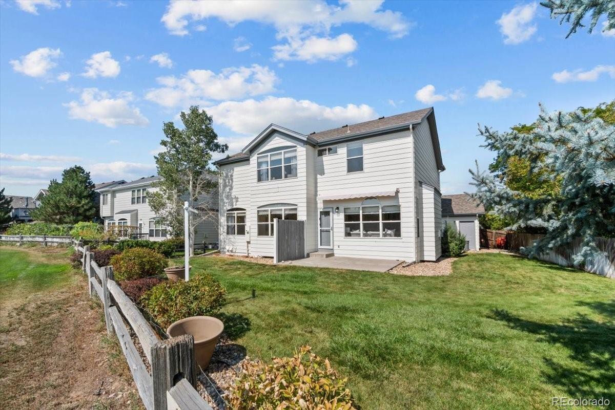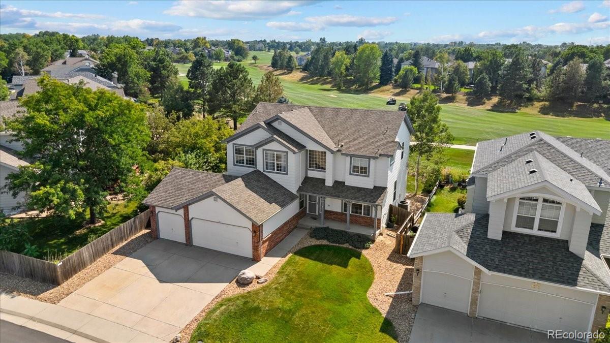 Perfectly situated on the 11th hole of Thorncreek Golf Course, this beautiful two-story home offers stunning views and a lifestyle filled with comfort and convenience in the highly desirable Hunters Glen neighborhood. Step inside and immediately feel at home as natural light pours through the windows, highlighting the warmth of real hardwood floors and a thoughtful, flexible layout. The main floor features two spacious living areas—one with a cozy gas fireplace and custom built-in bookshelves—perfect for both relaxing evenings and lively gatherings. The bright, white eat-in kitchen has been tastefully updated with gorgeous quartz countertops, providing plenty of space for cooking, dining, and connecting with loved ones. A formal dining room adds a touch of elegance, making holiday meals and dinner parties extra special. On the main level, you’ll also find a bedroom that can easily double as a private home office, located conveniently near a full bathroom and laundry area. It’s an ideal setup for overnight guests or as a potential main-level primary suite. Upstairs, a generous loft offers even more versatile living space, along with a spacious primary suite featuring a luxurious 5-piece bath and walk-in closet. Two additional bedrooms and another full bathroom complete the upper level. The unfinished basement provides endless potential for future customization, whether you envision a home theater, gym, or game room. Outside, enjoy breathtaking views of the golf course right from your backyard. A SunSetter retractable awning adds comfort and shade, making warm summer days even more enjoyable. Hunters Glen residents enjoy access to fantastic neighborhood amenities, including a seasonal outdoor pool, a scenic lake perfect for walking or paddle boarding, a playground, and a splash pad for the kids. With quick access to I-25, commuting is a breeze while still enjoying the peaceful charm of this vibrant community.