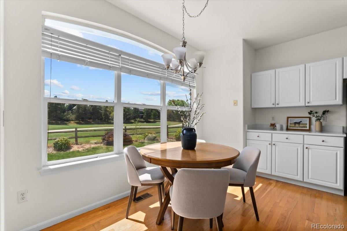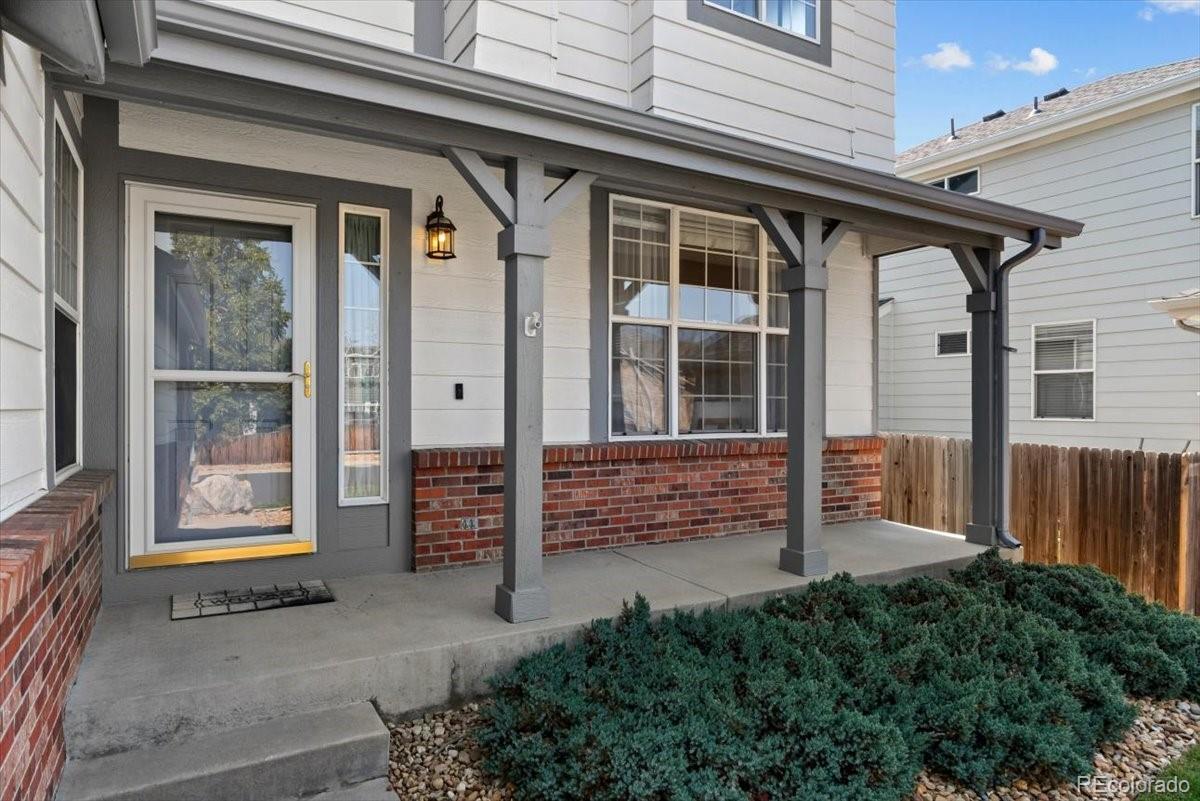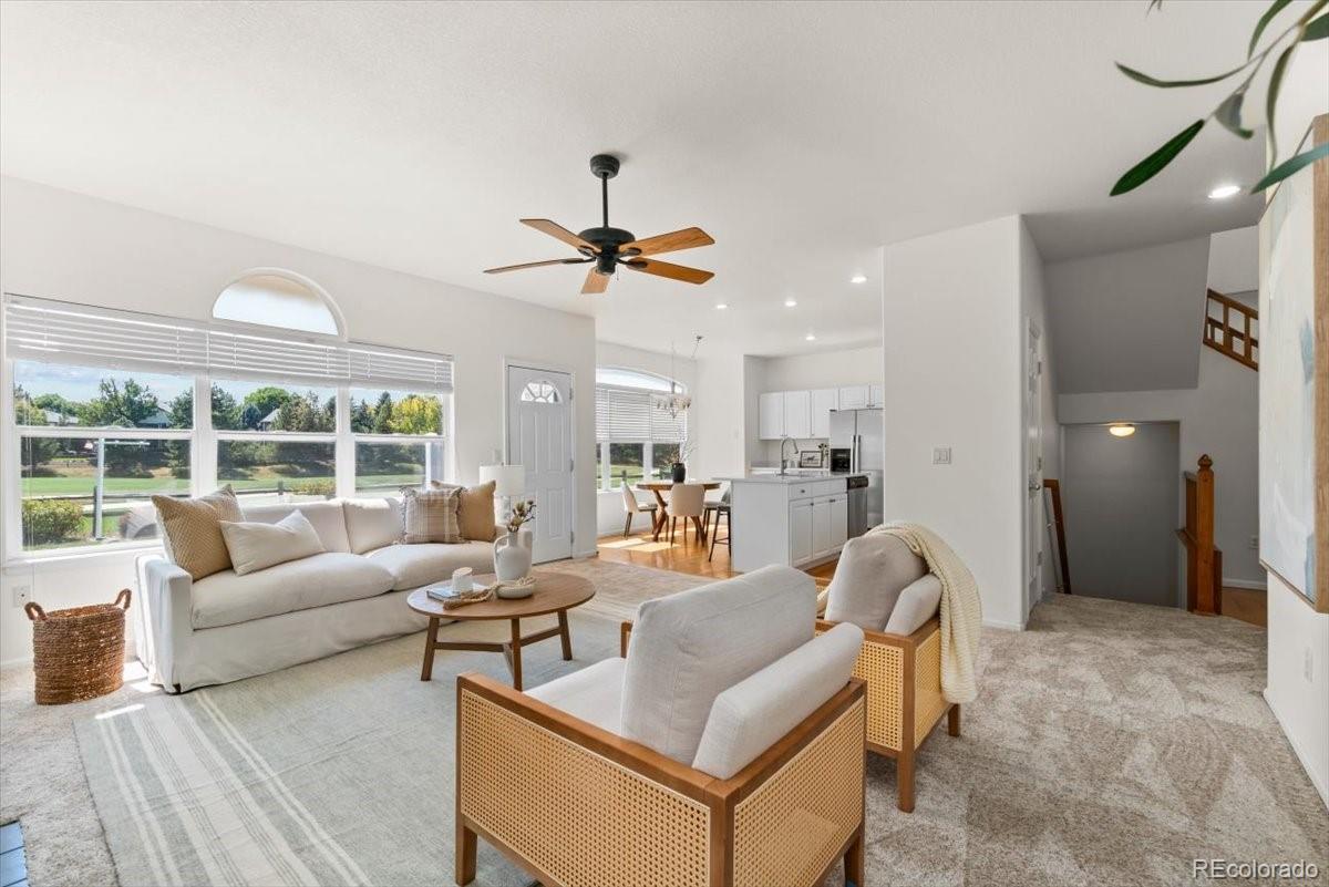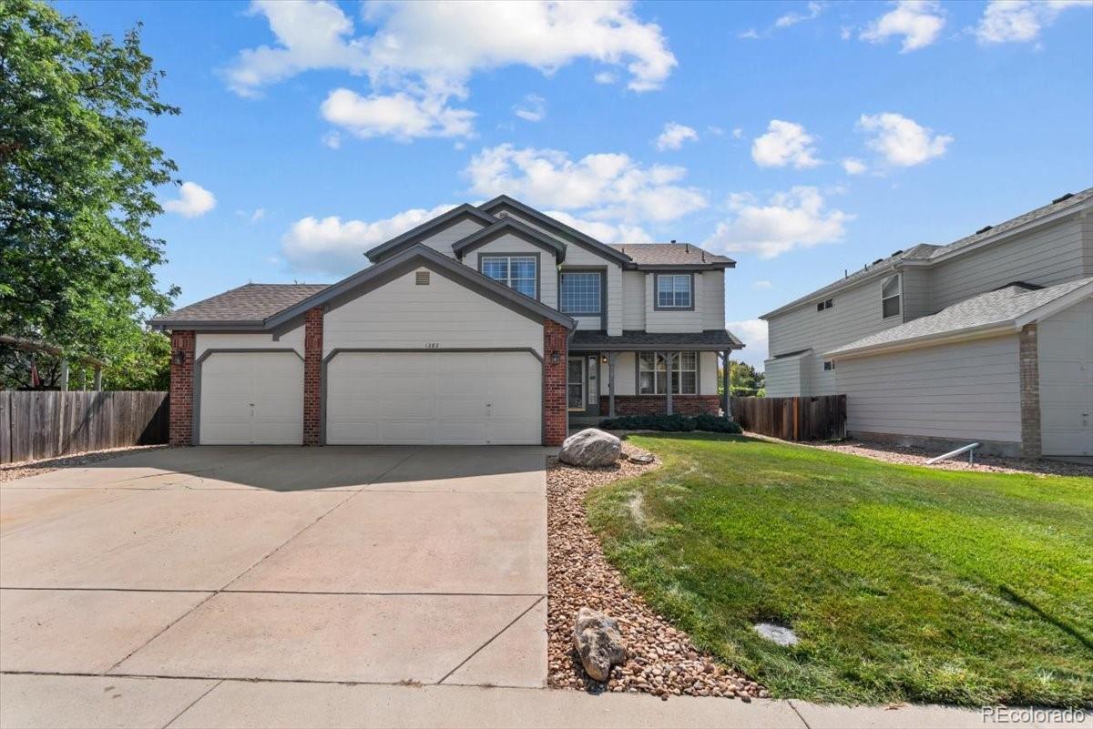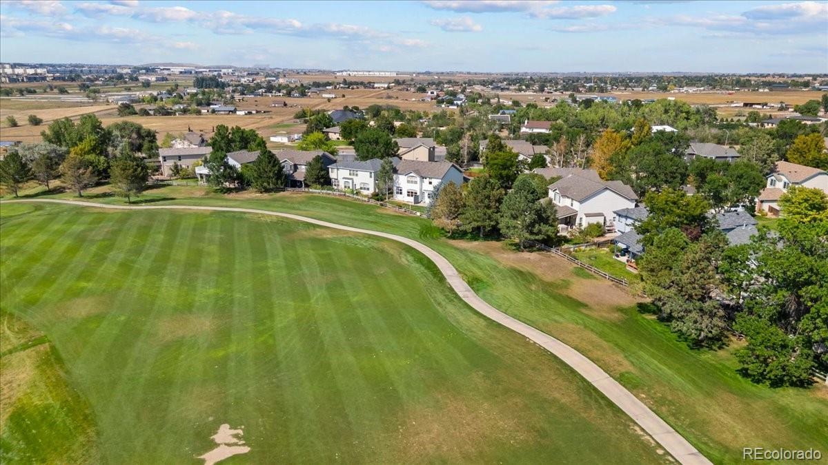 Perfectly situated on the 11th hole of Thorncreek Golf Course, this beautiful two-story home offers stunning views and a lifestyle filled with comfort and convenience in the highly desirable Hunters Glen neighborhood. Step inside and immediately feel at home as natural light pours through the windows, highlighting the warmth of real hardwood floors and a thoughtful, flexible layout. The main floor features two spacious living areas—one with a cozy gas fireplace and custom built-in bookshelves—perfect for both relaxing evenings and lively gatherings. The bright, white eat-in kitchen has been tastefully updated with gorgeous quartz countertops, providing plenty of space for cooking, dining, and connecting with loved ones. A formal dining room adds a touch of elegance, making holiday meals and dinner parties extra special. On the main level, you’ll also find a bedroom that can easily double as a private home office, located conveniently near a full bathroom and laundry area. It’s an ideal setup for overnight guests or as a potential main-level primary suite. Upstairs, a generous loft offers even more versatile living space, along with a spacious primary suite featuring a luxurious 5-piece bath and walk-in closet. Two additional bedrooms and another full bathroom complete the upper level. The unfinished basement provides endless potential for future customization, whether you envision a home theater, gym, or game room. Outside, enjoy breathtaking views of the golf course right from your backyard. A SunSetter retractable awning adds comfort and shade, making warm summer days even more enjoyable. Hunters Glen residents enjoy access to fantastic neighborhood amenities, including a seasonal outdoor pool, a scenic lake perfect for walking or paddle boarding, a playground, and a splash pad for the kids. With quick access to I-25, commuting is a breeze while still enjoying the peaceful charm of this vibrant community.