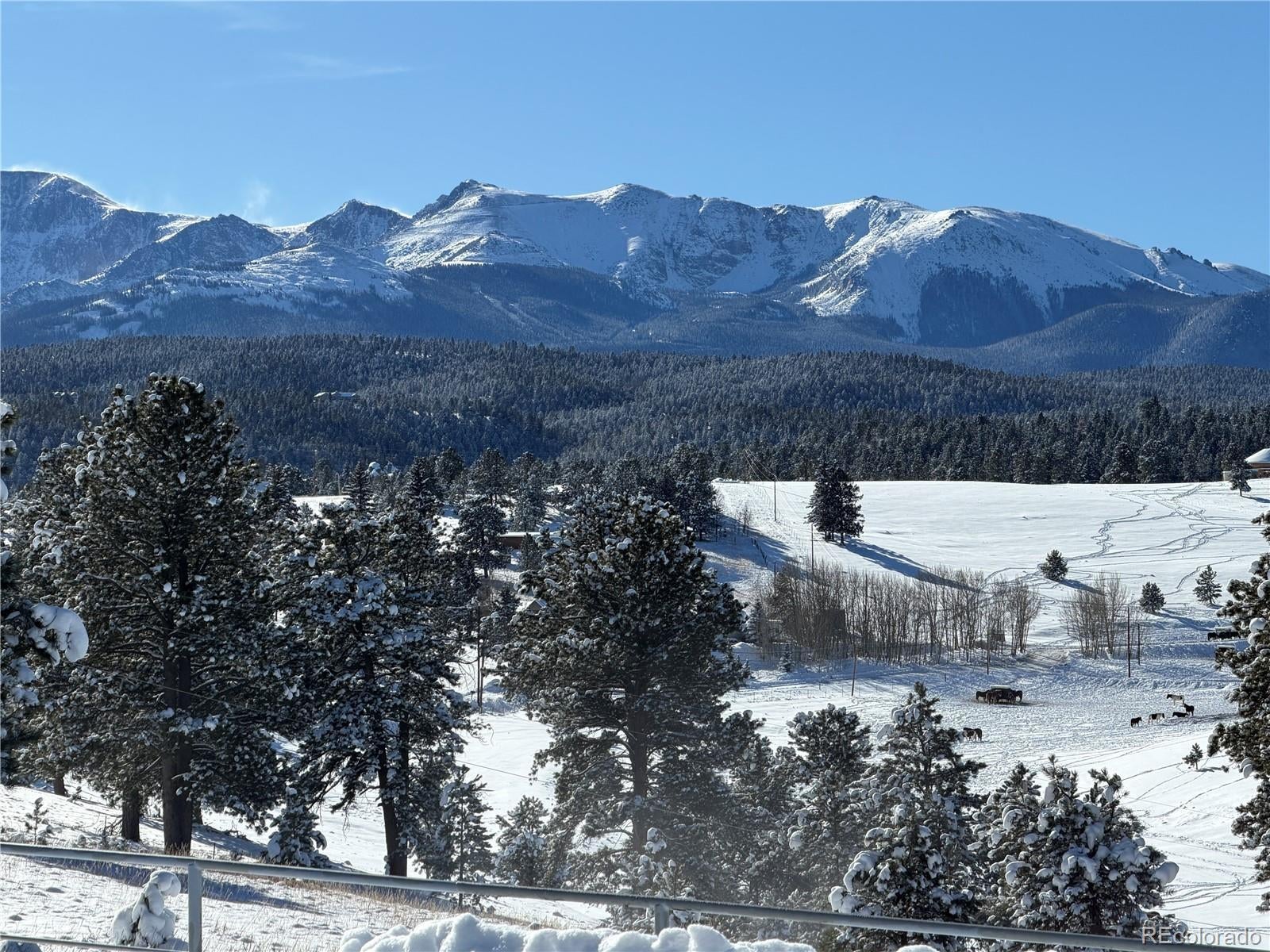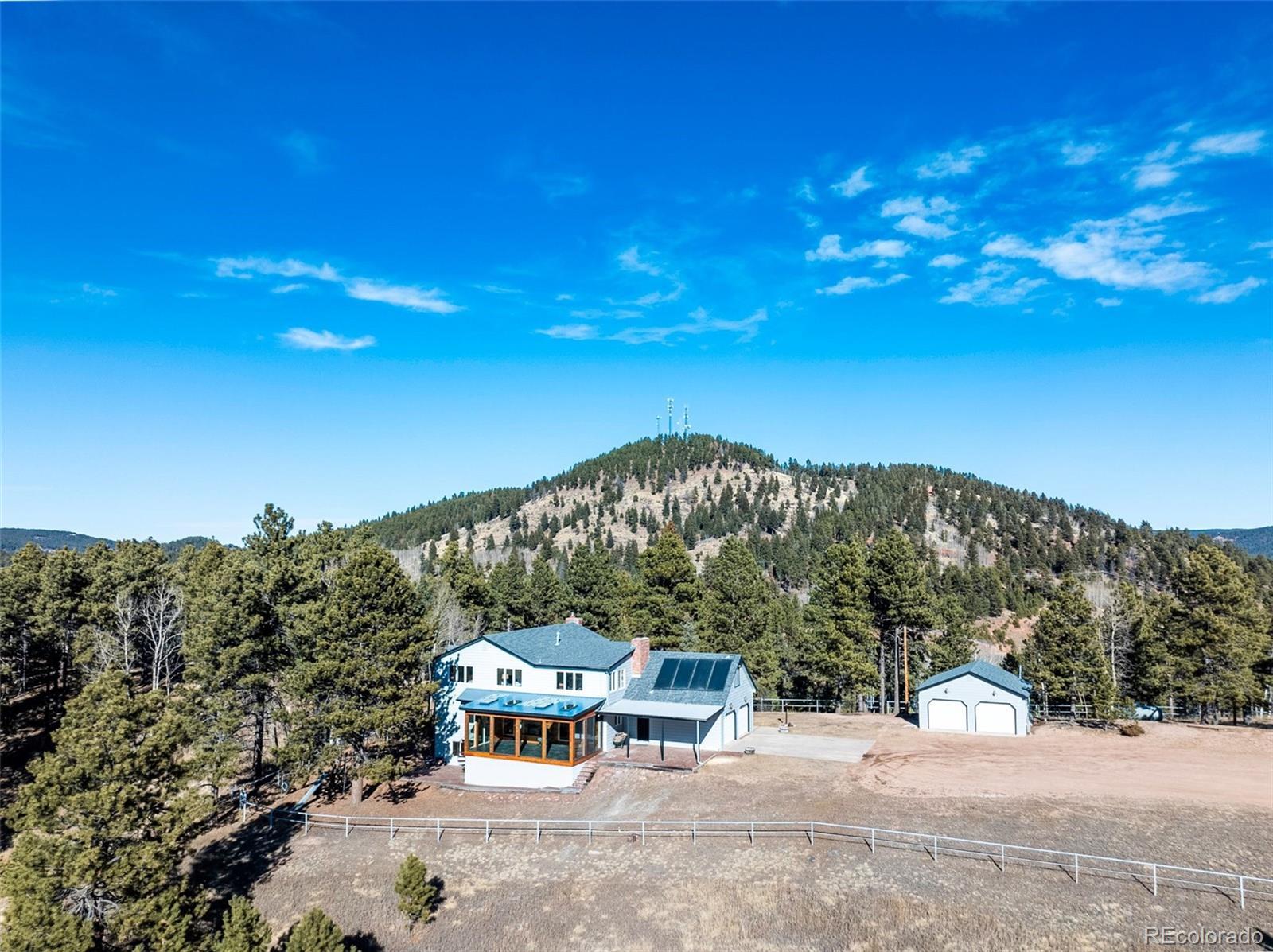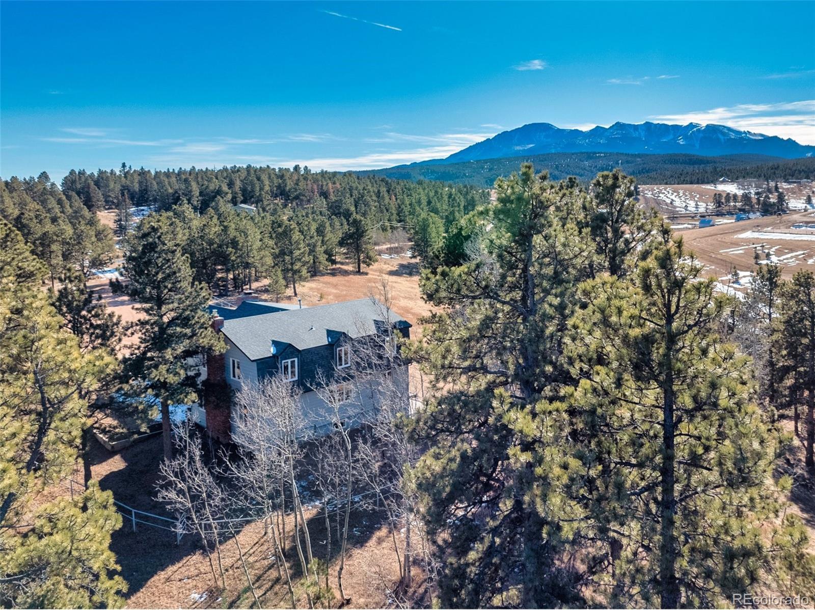 This stunning property showcases breathtaking unobstructed Pikes Peak views & offers the perfect blend of luxury living & exceptional equestrian amenities! Situated on 23.73 agricultural acres, the property features a 6-stall barn, 2 loafing sheds with separate corrals, & an additional outbuilding with 3 stalls & 2 private rooms ideal for an office & additional tack room. The barns have their own well & electric with a private gated entrance off of Hwy 24, creating the potential for a boarding facility or rental income opportunity. The home has been extensively updated, beginning with the beautiful new sunroom. This inviting space features a new electric fireplace, new vinyl windows, tile flooring, stucco, custom log accents, & an active solar temperature control which helps regulate temperature. The Family room has been refreshed with new LVP flooring, paint, & a 3-panel sliding door which opens up to the sunroom. The welcoming living room features a new gas insert fireplace with battery backup providing warmth even during a power outage. The kitchen has been beautifully updated with a new refrigerator, dishwasher, trach compactor, quartz countertop, backsplash, & newly painted cabinetry with new hardware. The primary bath features dual vanities with granite counters & new flooring. The basement has all new carpet & paint. It would make a great game room. Additional improvements include new electrical panels, GFCIs, 220V service to detached garage, & a new main sewer line. This Home is sold mostly furnished with beautiful furnishings. The home is on city water plus there are 2 wells (one is domestic). It offers 3 fireplaces, one is electric, one is gas & one is wood burning . There ae 2 family rooms, a formal living room, a loft with Pikes Peak views, attached 2-car garage & oversized detached 2- car garage. Fully fenced & walking distance to Woodland Park! This property would make a great wedding venue or vacation rental. Unique and Beautiful!