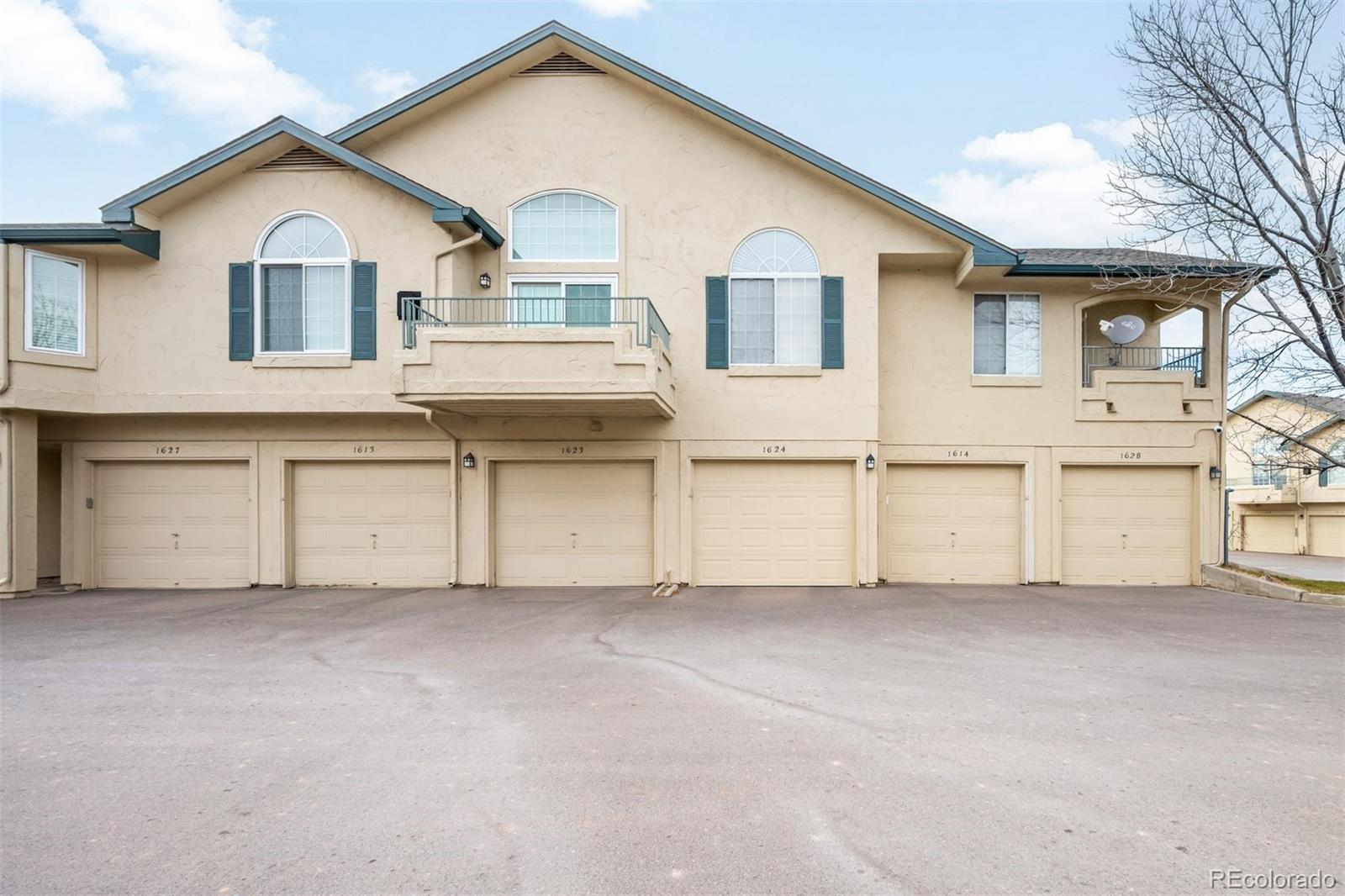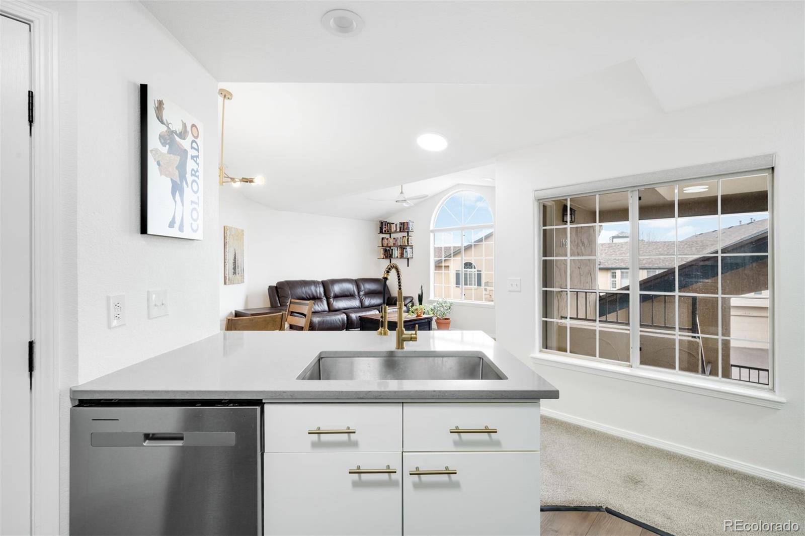 Located in the desirable Saddle Ridge community, this rare, fully updated one-bedroom condominium features vaulted ceilings and an open floor plan that fills the home with natural light and an airy sense of space. The living room is anchored by a gas fireplace and an oversized arched window, flowing seamlessly into the dining area and kitchen. The kitchen is thoughtfully appointed with white cabinetry, stainless steel appliances, new flooring, and functional bar seating. The primary bedroom offers a generous 7' x 6' walk-in closet and direct access to a private balcony, while the full bathroom has been refreshed with a contemporary vanity and modern finishes. Additional conveniences include in-unit laundry, central air conditioning, and an oversized attached one-car garage with extra storage. Recent updates include a new washer and dryer, water heater, garage door and opener, and updated window coverings. The well-maintained community features a clubhouse, swimming pool, and hot tub, all just minutes from the DTC, Park Meadows Mall, dining, I-25, and the RTD light rail.