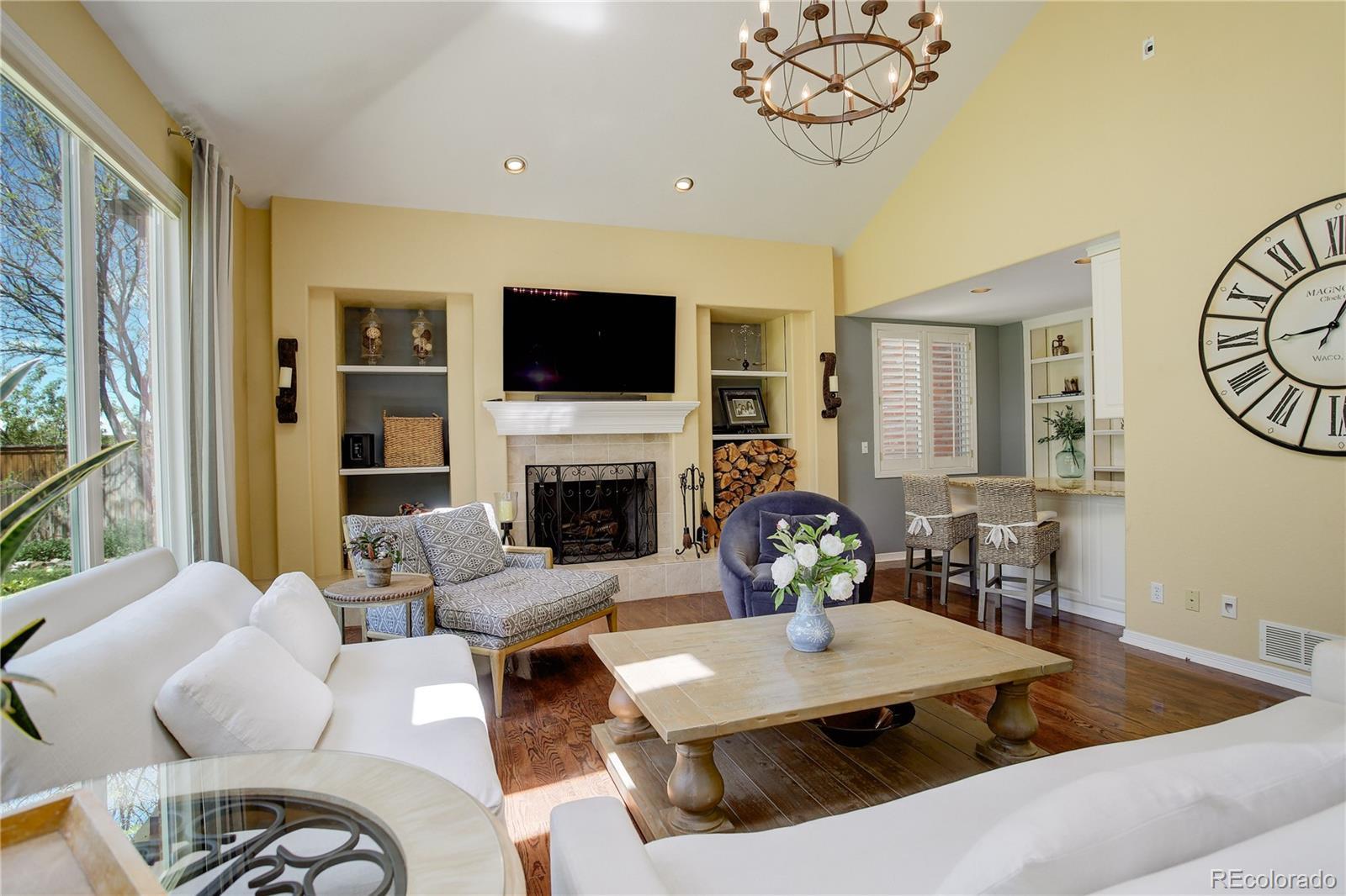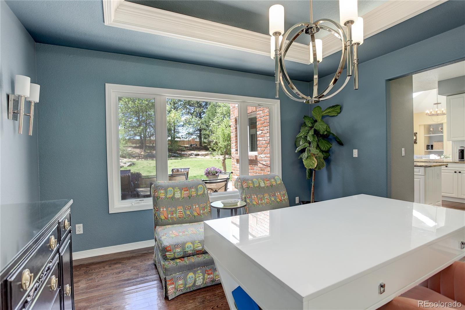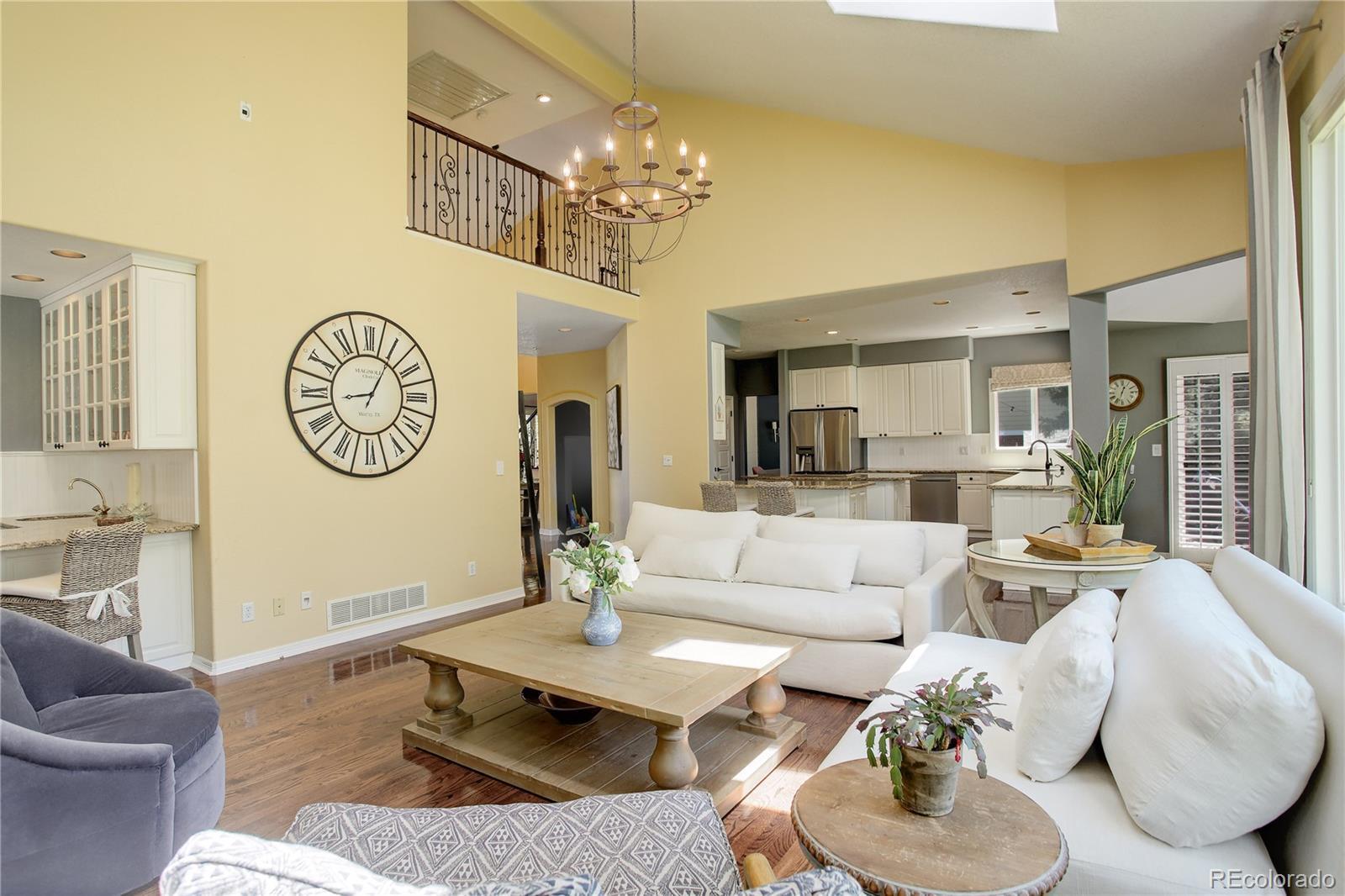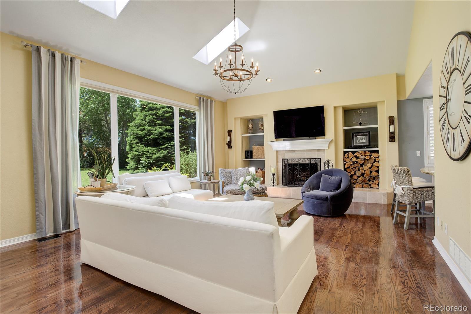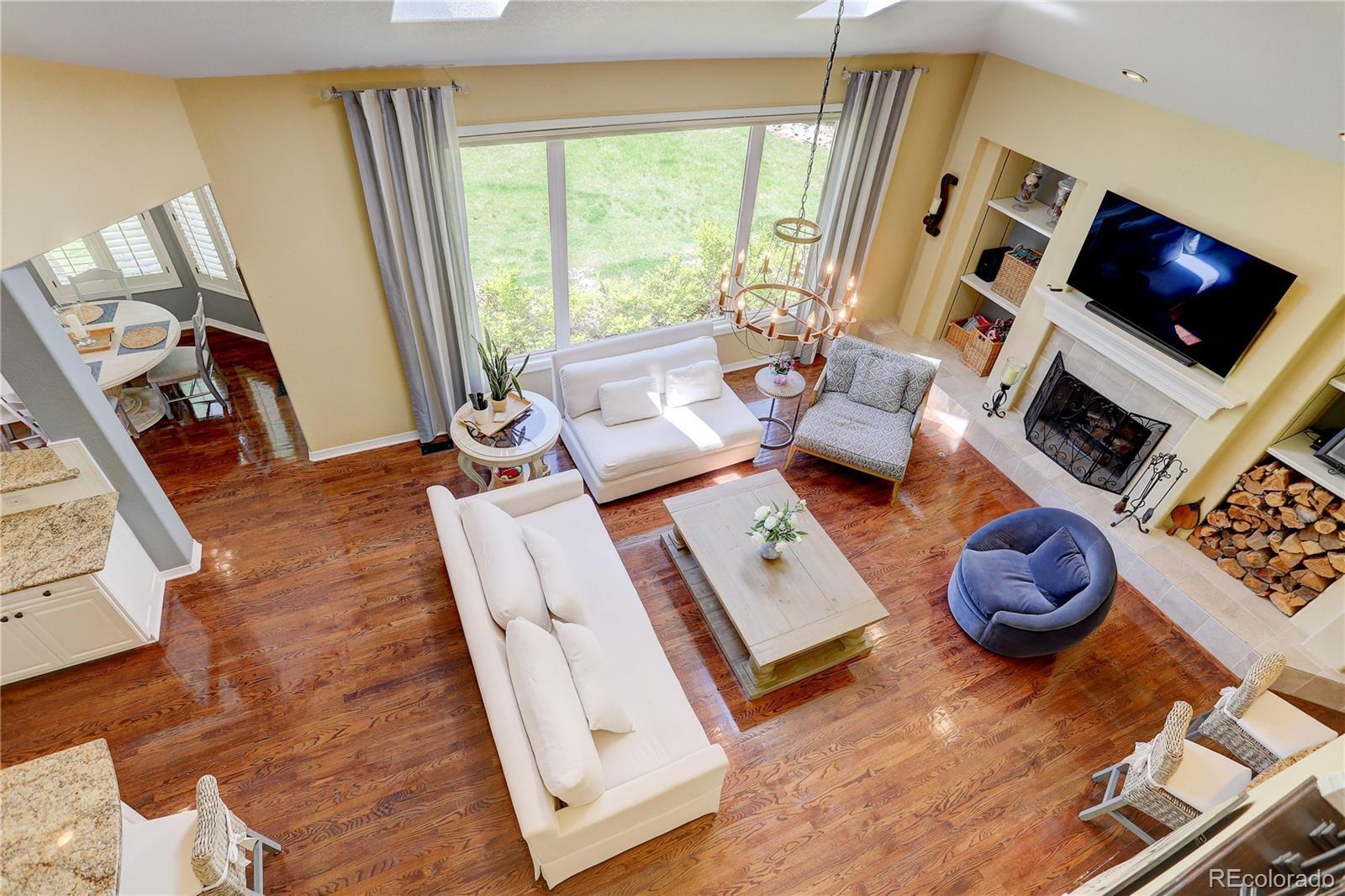 Discover this stunning Highlands Ranch home nestled in prestigious Hillcrest neighborhood. Amazing Cul de sac location where kids RIDE BIKES & WALK to award winning Douglas Cnty Schools K-12 & Valor Christian HS! 1.3 miles to C470 and 15 mins to DTC. Residents enjoy all Highlands Ranch rec centers, pools & hiking trails. From the moment you enter into the spectacular two story foyer the sprawling staircase is inviting and welcoming. NEW HVAC; 2 HEATERS & 2 AIR CONDITIONERS! Be greeted by warmth from gleaming oak hardwood floors throughout the main level. The kitchen is complete with Dacor gas stove, a double oven and counter/cupboard space galore. UPDATES THROUGHOUT! Two breakfast bars and the sunny, custom turret eating area leading to the patio, add to making the entire home flow flawlessly. The kitchen opens into the spectacular great room which embodies tall ceilings, picture windows, a wet bar, and wood burning fireplace. Two private offices on the main floor make this a perfect home! One off the kitchen with a wall of windows, the other having custom shelves, a bay window and beveled glass french doors.The dining room accommodates a huge table fit for royalty! As you ascend the staircase you find a loft with built-in shelves, leading to a luxurious primary suite and three generous additional bedrooms. The primary suite is a true retreat, boasting a bay window, five-piece bath, large jetted tub and a sizable walk-in closet. Two of the secondary bedrooms share a bath, while the third has its own en suite bath. Enjoy Mountain Views from the second floor. The professionally finished basement offers a spacious tv room equipped with a fireplace, a huge exercise studio, fifth bedroom, a full bathroom, and ample storage. Set on a sprawling ½ acre the backyard features a serene waterfall, pond, two patios, a basketball court and a fire pit area for outdoor gatherings. This Home is a True Gem, Make it Yours Today