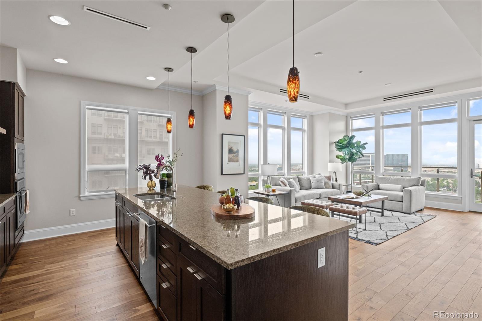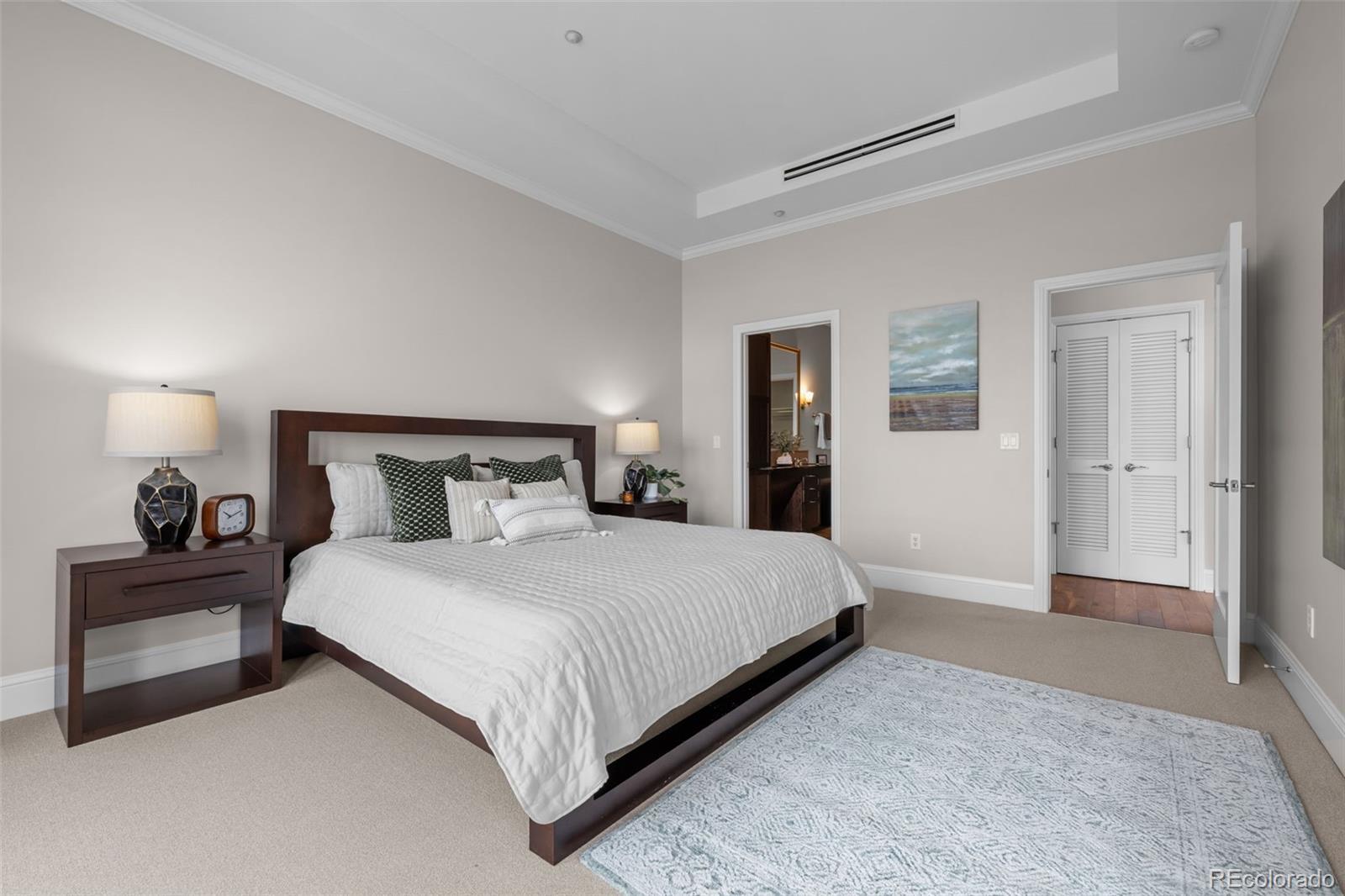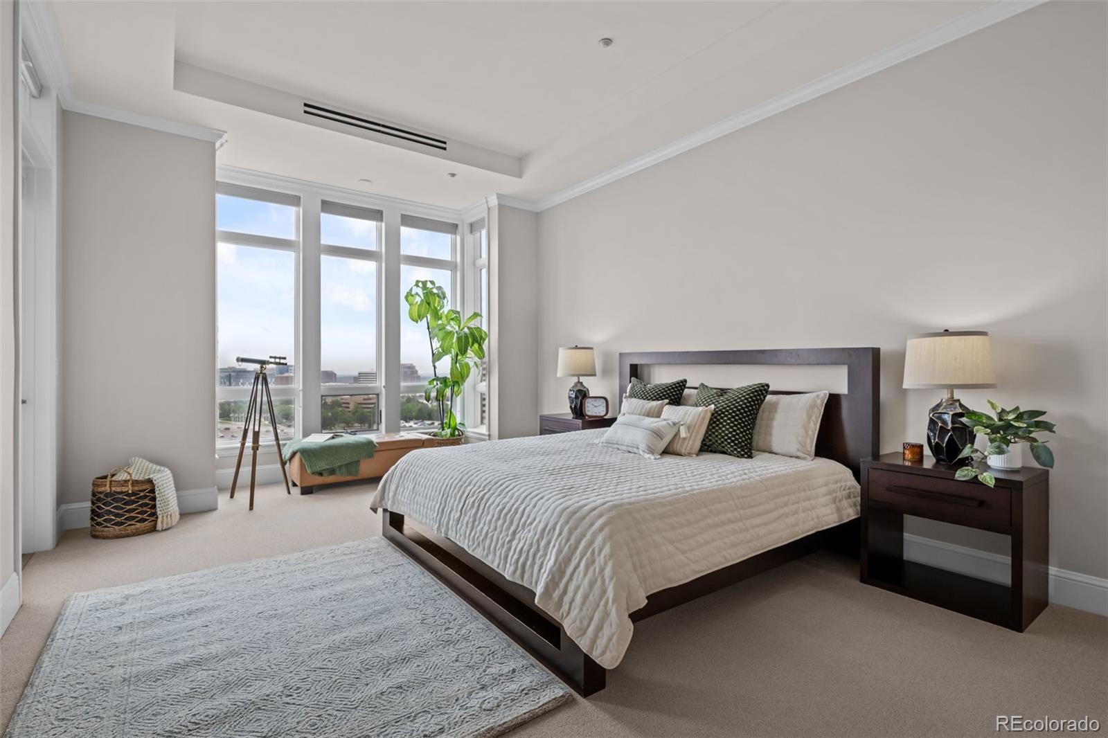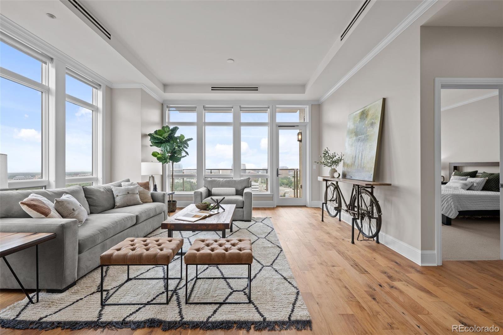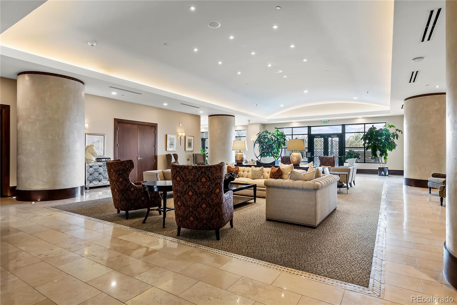 A Sophisticated Retreat with Breathtaking Views at The Landmark. Gracefully positioned on a coveted corner, this exceptional 2-bedroom, 2-bath residence at The Landmark is awash in natural light and framed by sweeping mountain and city vistas. Encompassing over 1,500 square feet of thoughtfully designed living space, the home exudes timeless elegance with soaring 10-foot ceilings, a welcoming stone-tiled foyer, rich hardwood flooring, and fresh designer paint throughout. The kitchen is both functional and refined, featuring a generous island with seating for four to five, seamlessly connecting to the expansive living and dining areas—ideal for effortless entertaining. The primary suite is an inviting sanctuary with panoramic views and direct access to a spacious, covered patio that also adjoins the main living area, offering a perfect setting for indoor-outdoor living. Additional conveniences include two assigned garage parking spaces and a storage unit. The Landmark redefines luxury living with a host of curated amenities designed for comfort, wellness, and community. From concierge and front desk services to serene patios with tranquil water features, toasty fire pits, every detail has been thoughtfully considered. Indulge in the spa experience with sauna and steam rooms, unwind in the club room with a full catering kitchen, or explore creative pursuits in the craft room and library. Wine connoisseurs will appreciate a temperature controlled wine storage room, while the media room offers the perfect escape for cinematic evenings. Just outside your doorstep, a world of convenience awaits: fine dining, boutique shopping, fitness studios, and a luxury cinema, all within a short stroll. With easy access to scenic trails, lush parks, and the natural beauty of Cherry Creek Reservoir, The Landmark offers an extraordinary lifestyle where sophistication meets simplicity.